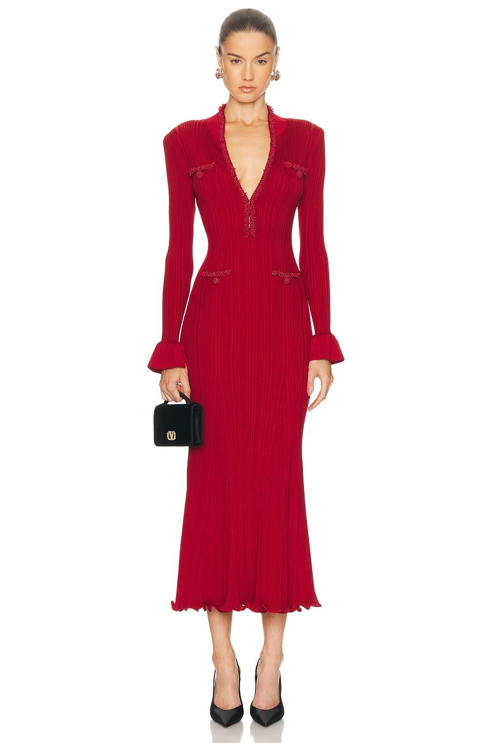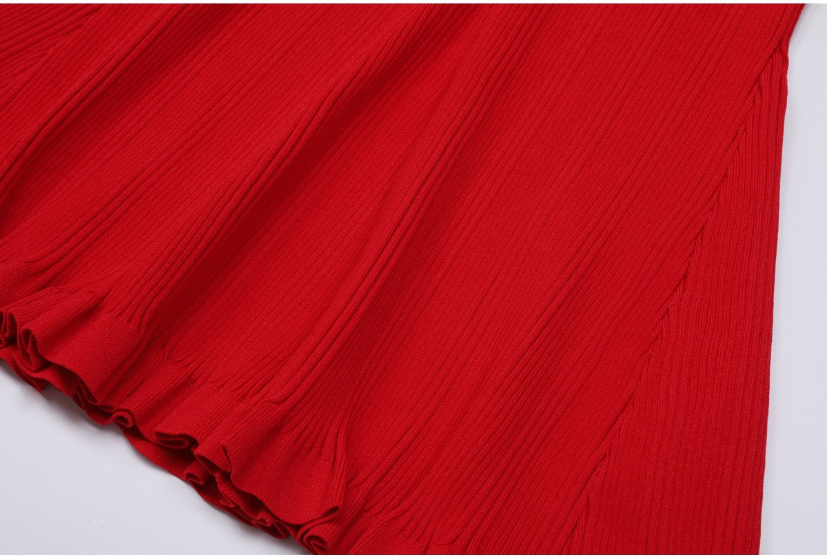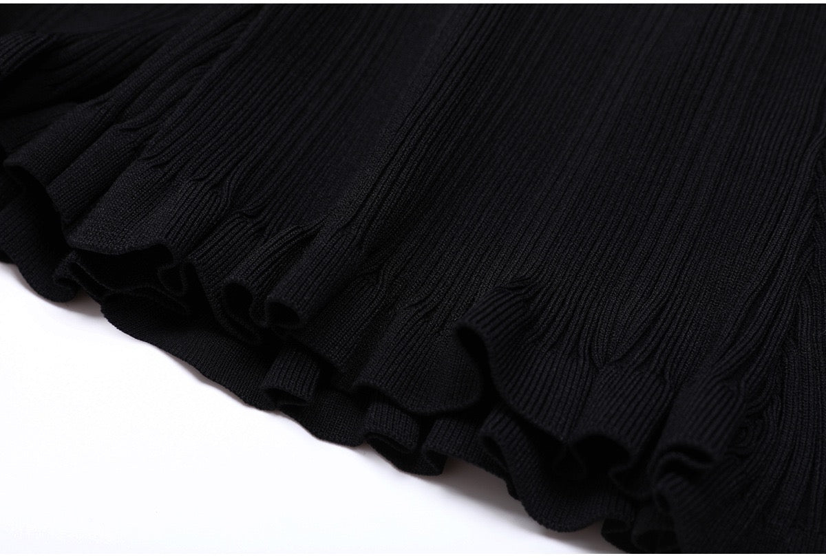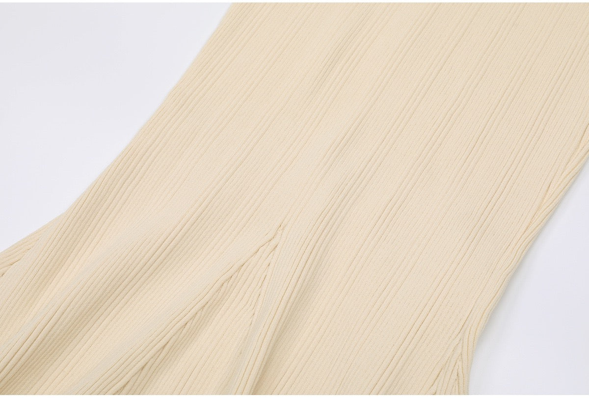 A refined long knit dress designed with delicate ribbed texture and elegant pearl trim accents. Crafted in a soft, structured fabric that flatters the silhouette, featuring long sleeves, a subtle neckline opening, and feminine pocket details. Effortlessly polished for daytime elegance or elevated evening styling.