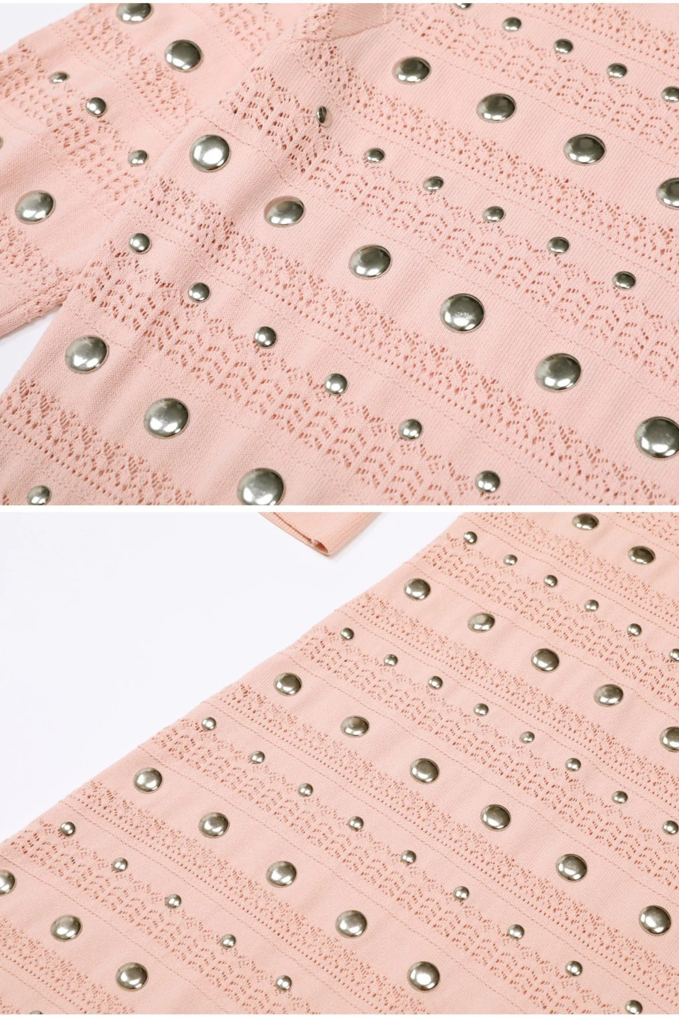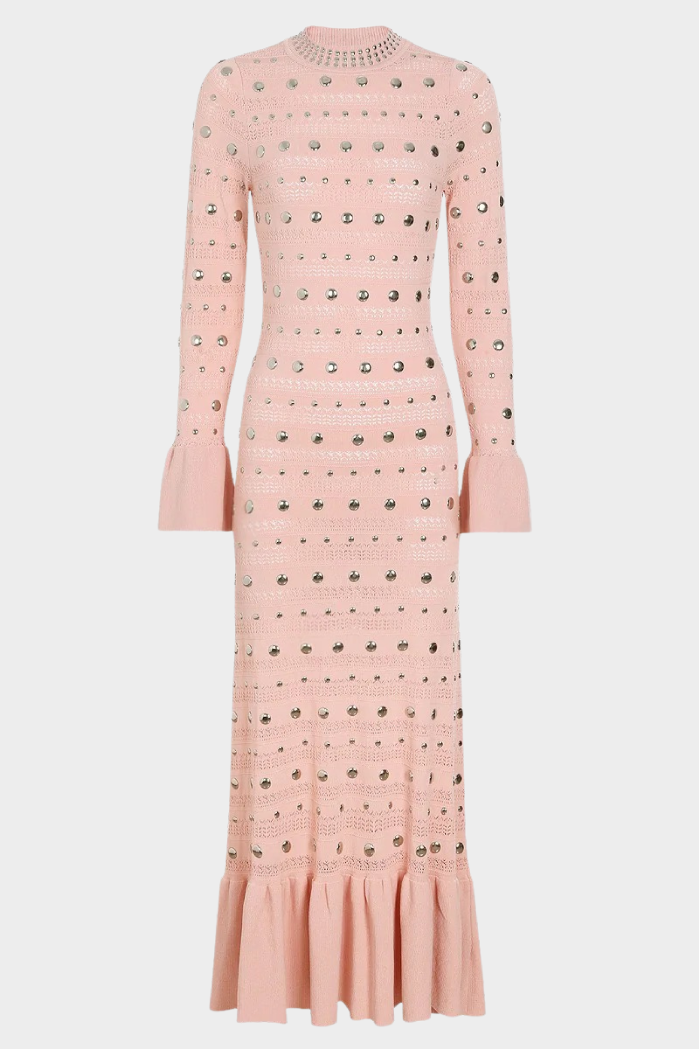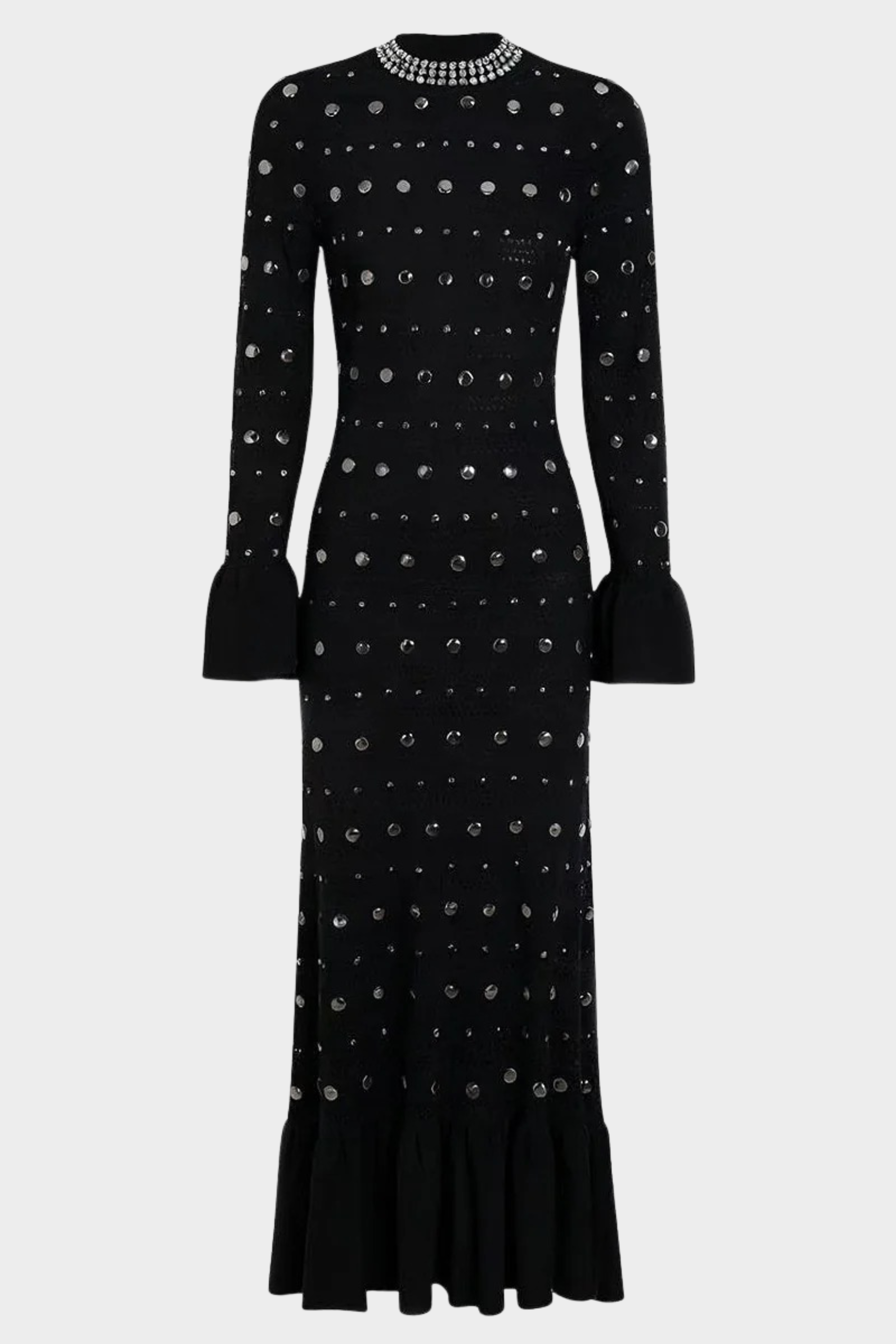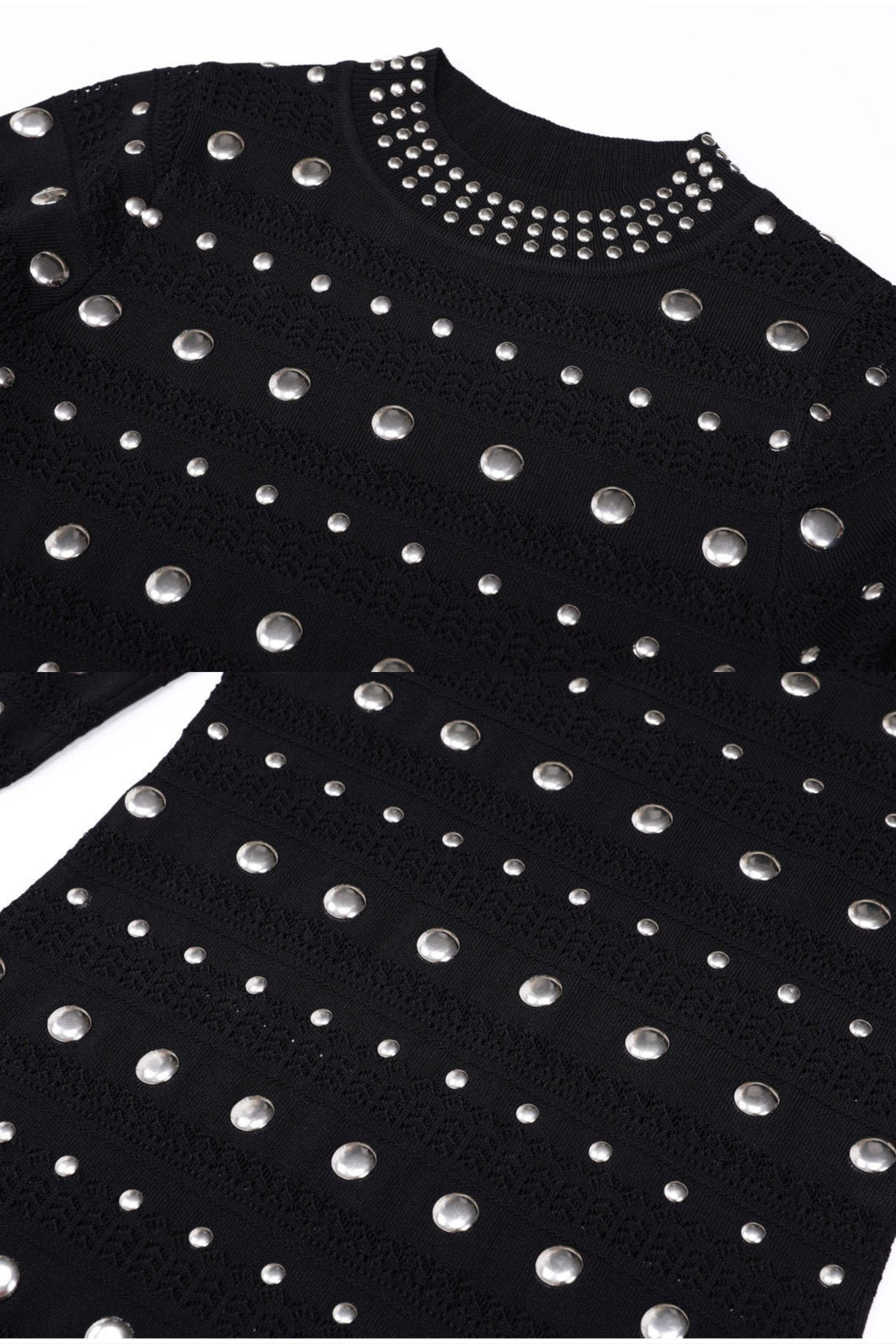 A luxury studded knit maxi dress crafted from soft, stretchy woven fabric with a long-sleeve design, flared cuffs, and a fitted bodycon silhouette. Features metallic stud embellishments, a delicate textured knit pattern, and a feminine A-line flared hem. Perfect for evening events, winter occasions, and elegant nights out. Stylish, flattering, and high-quality—designed for a chic statement look.