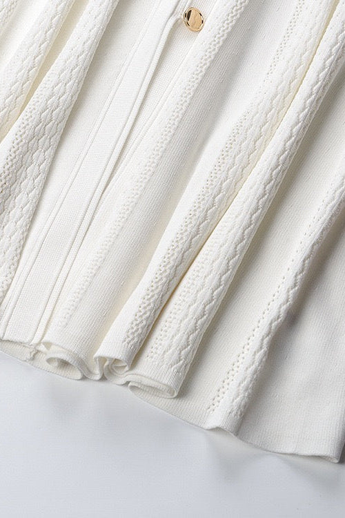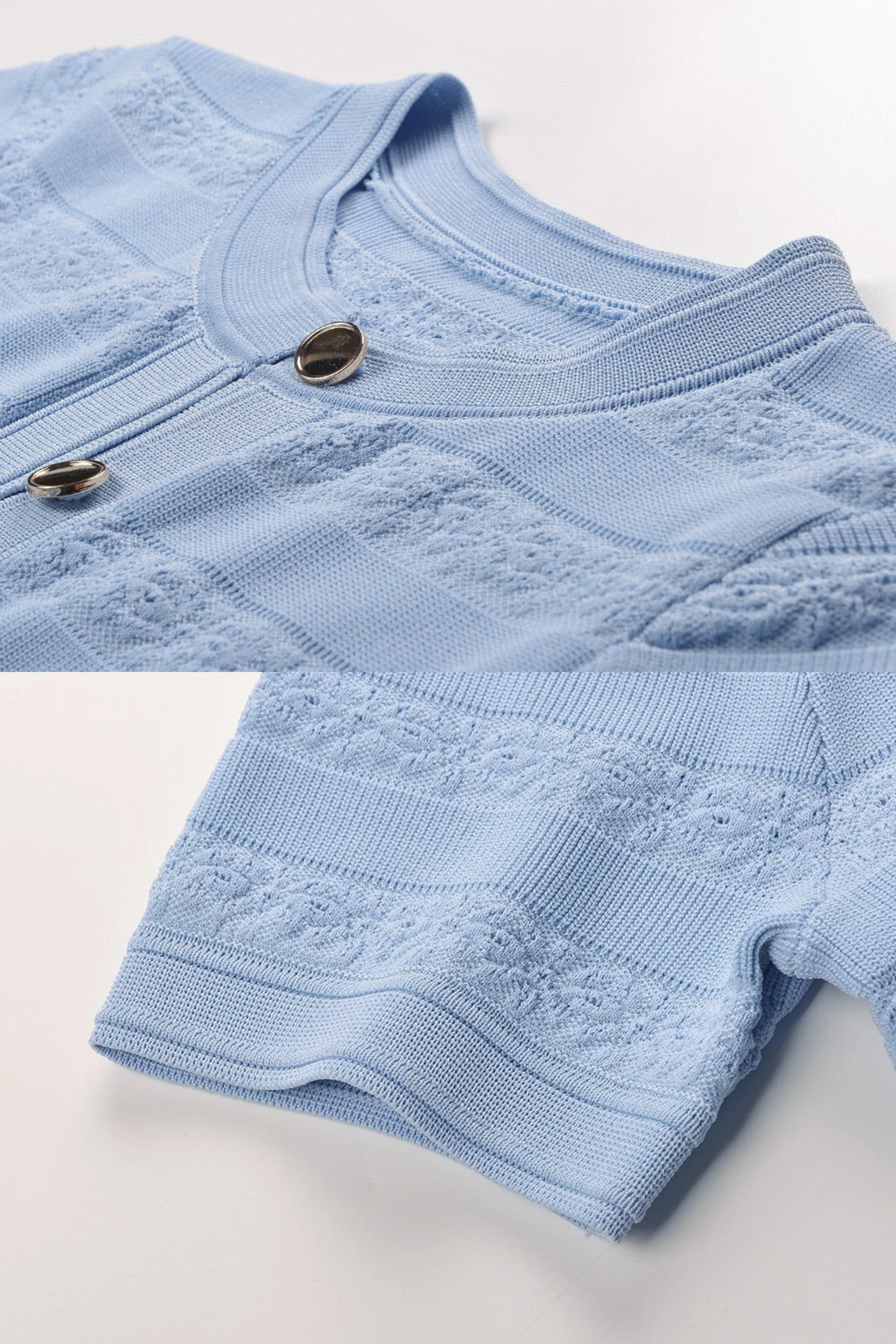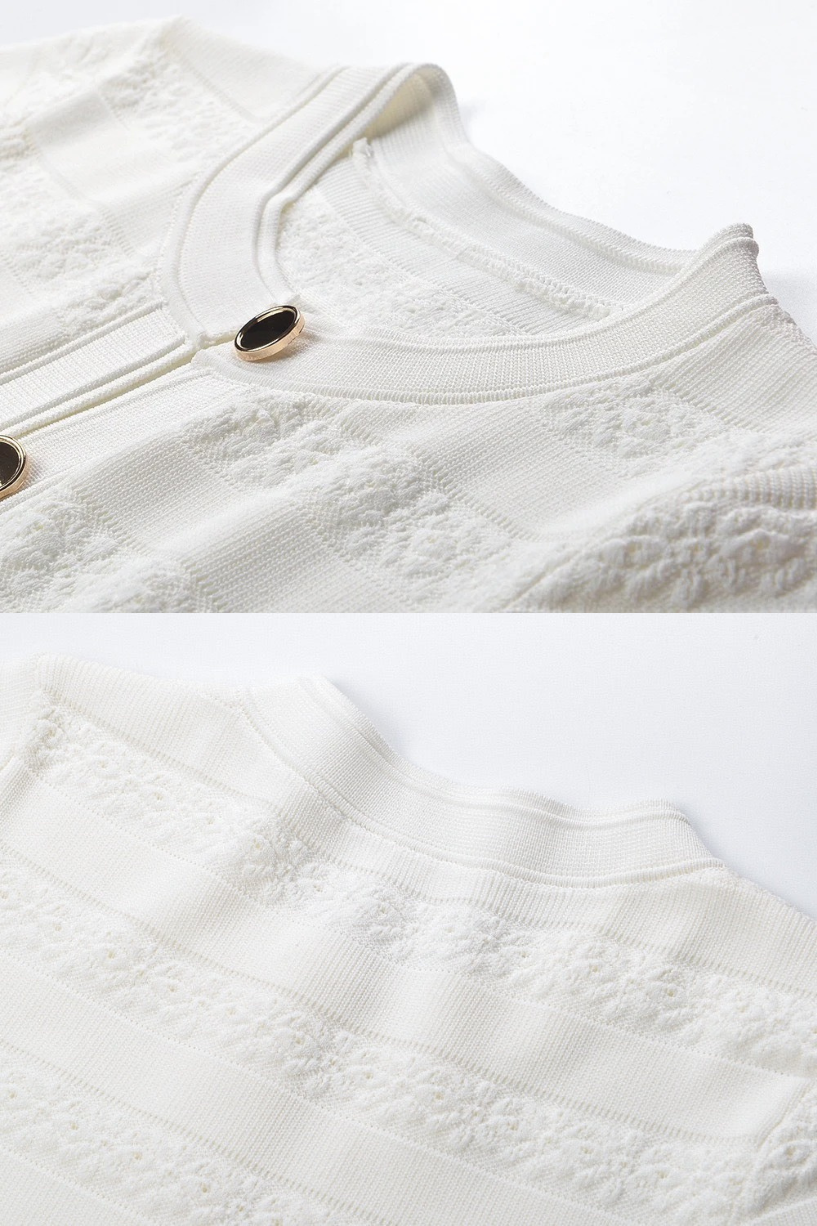 The delicate knit pattern adds subtle dimension while the structured buttons bring a polished finish. Perfect for everyday elegance, work, or effortlessly polished occasions.