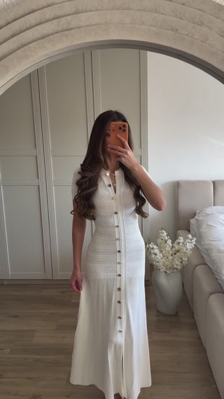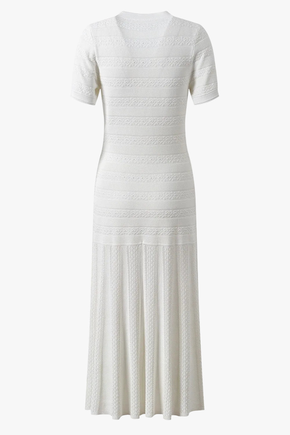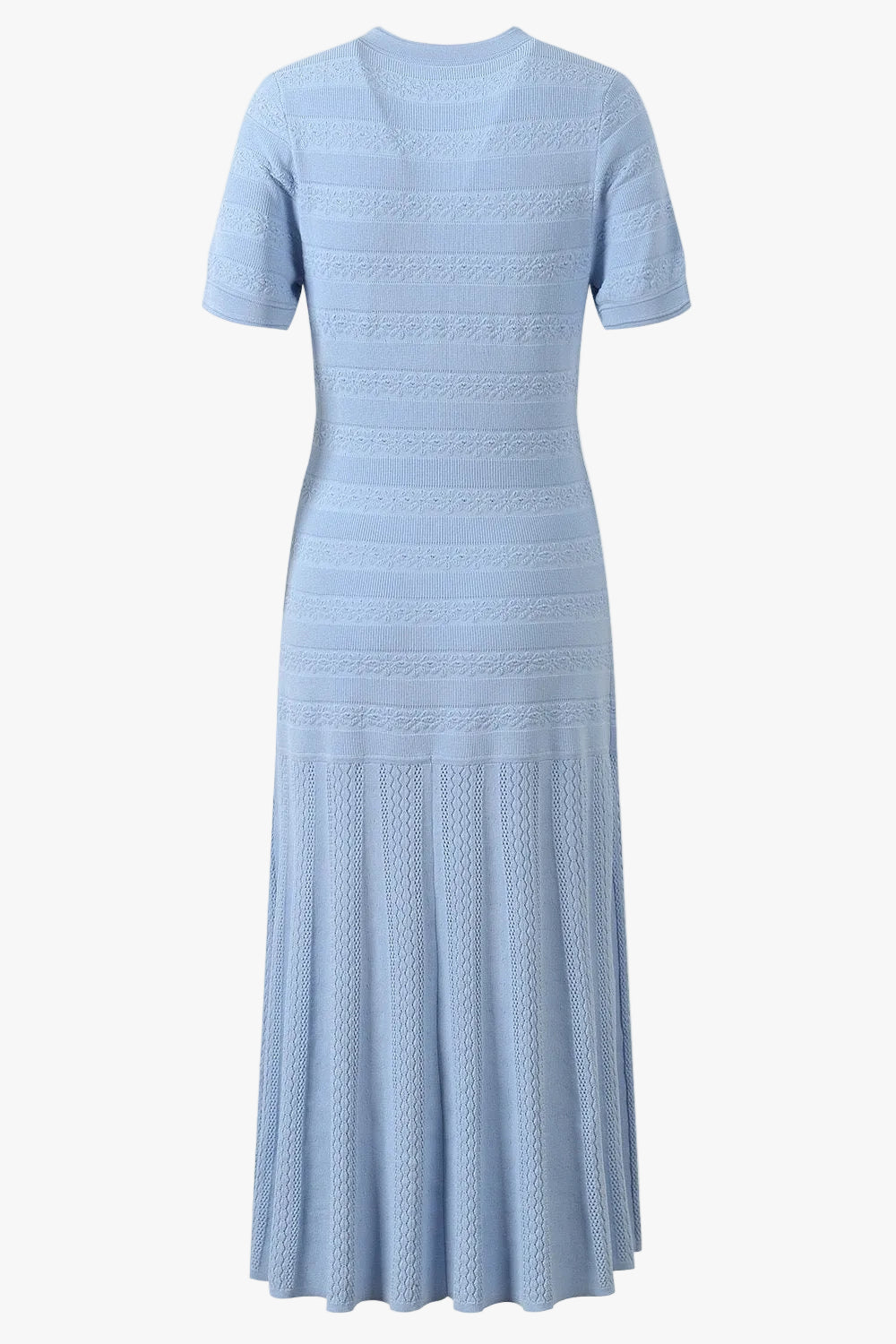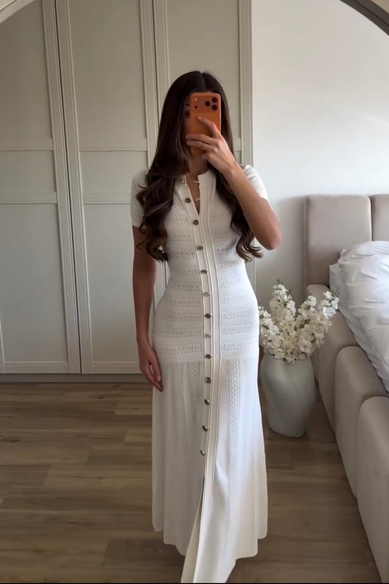 An elegant long dress crafted from soft textured knit fabric, featuring short sleeves and a refined button-front design. The fitted upper silhouette gently follows the body before flowing into a softly pleated hem, creating graceful movement and a flattering shape.