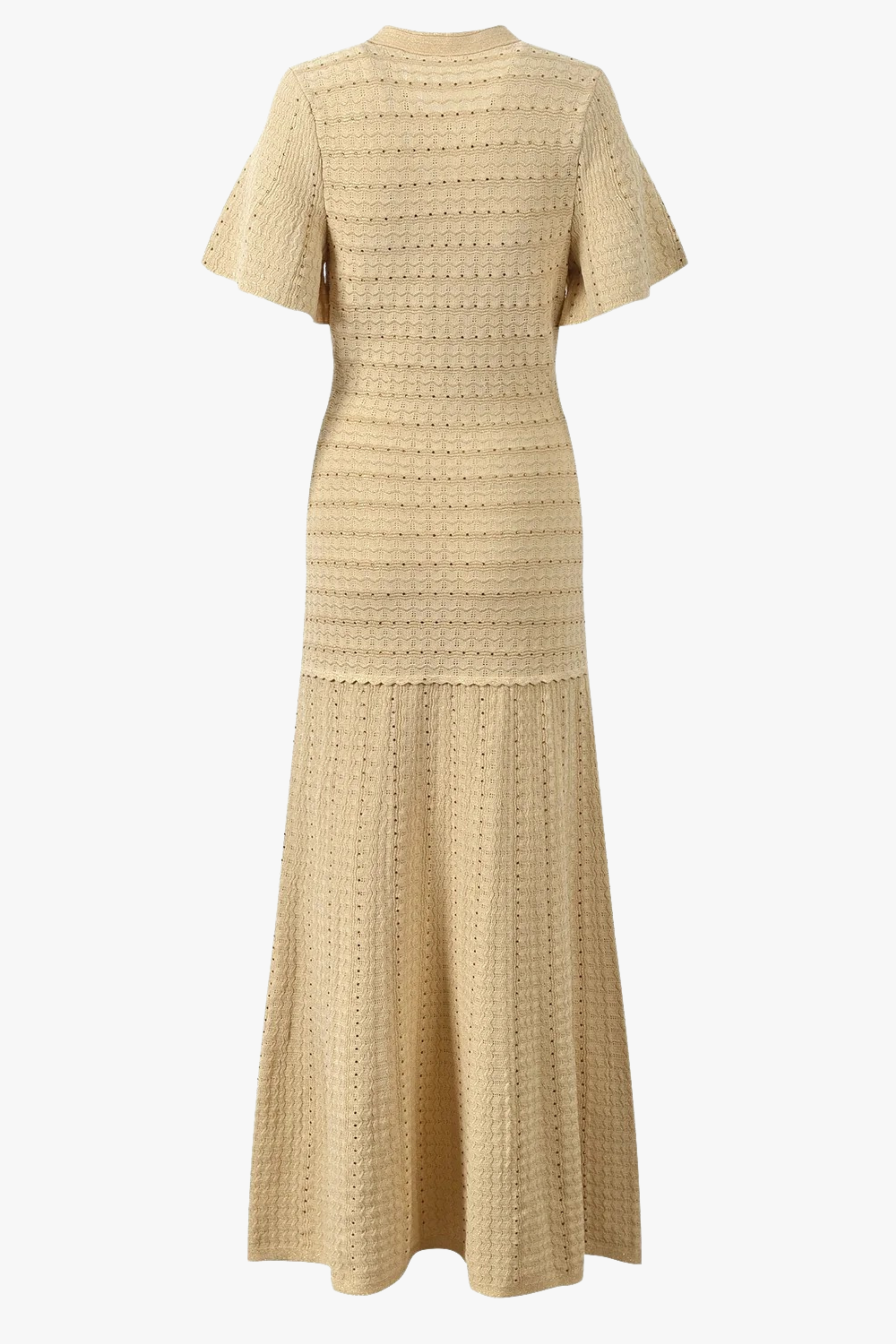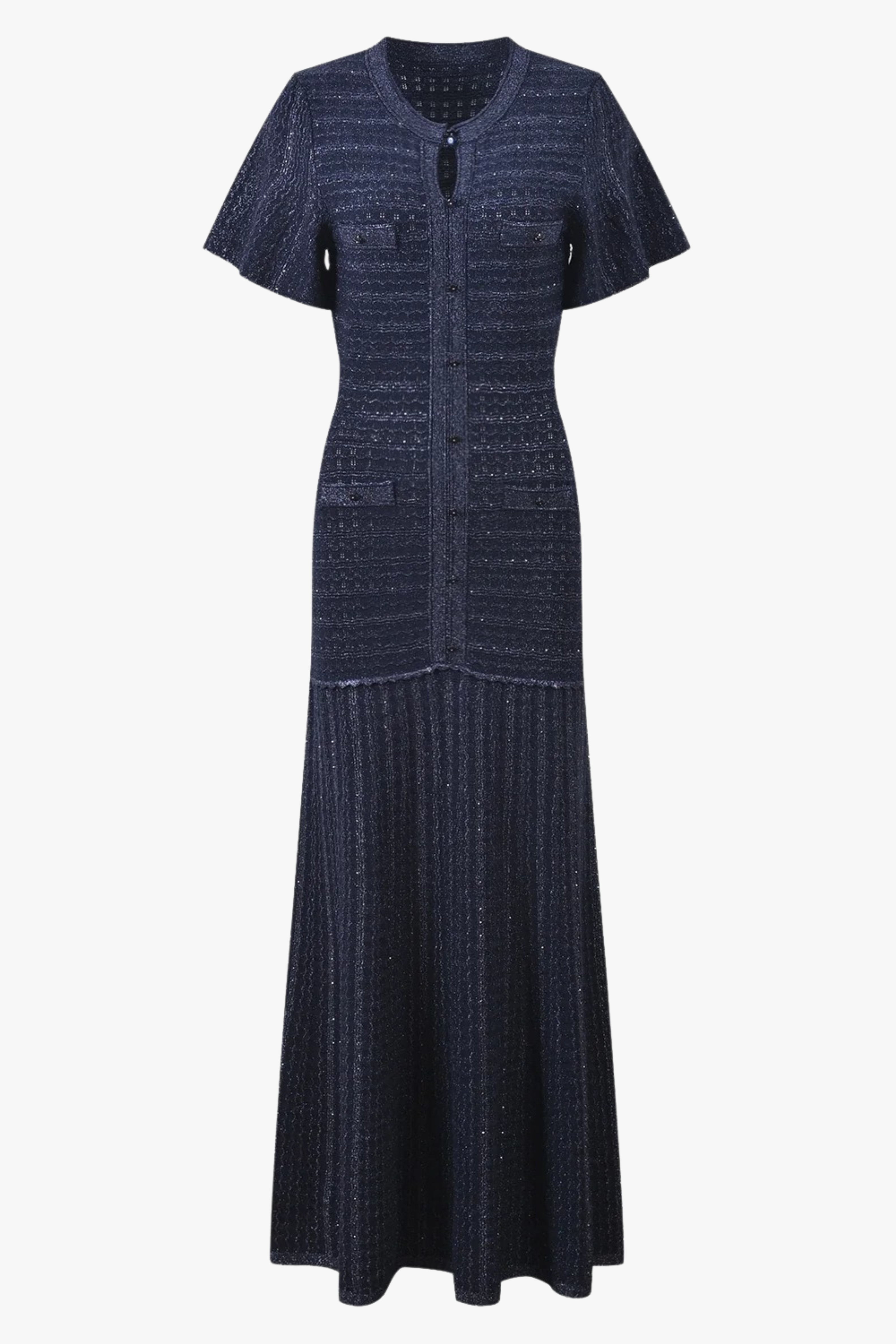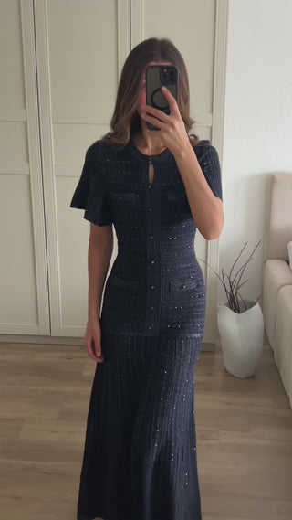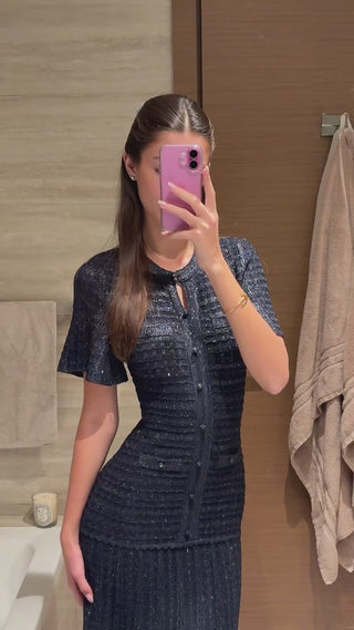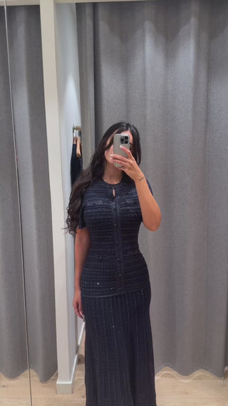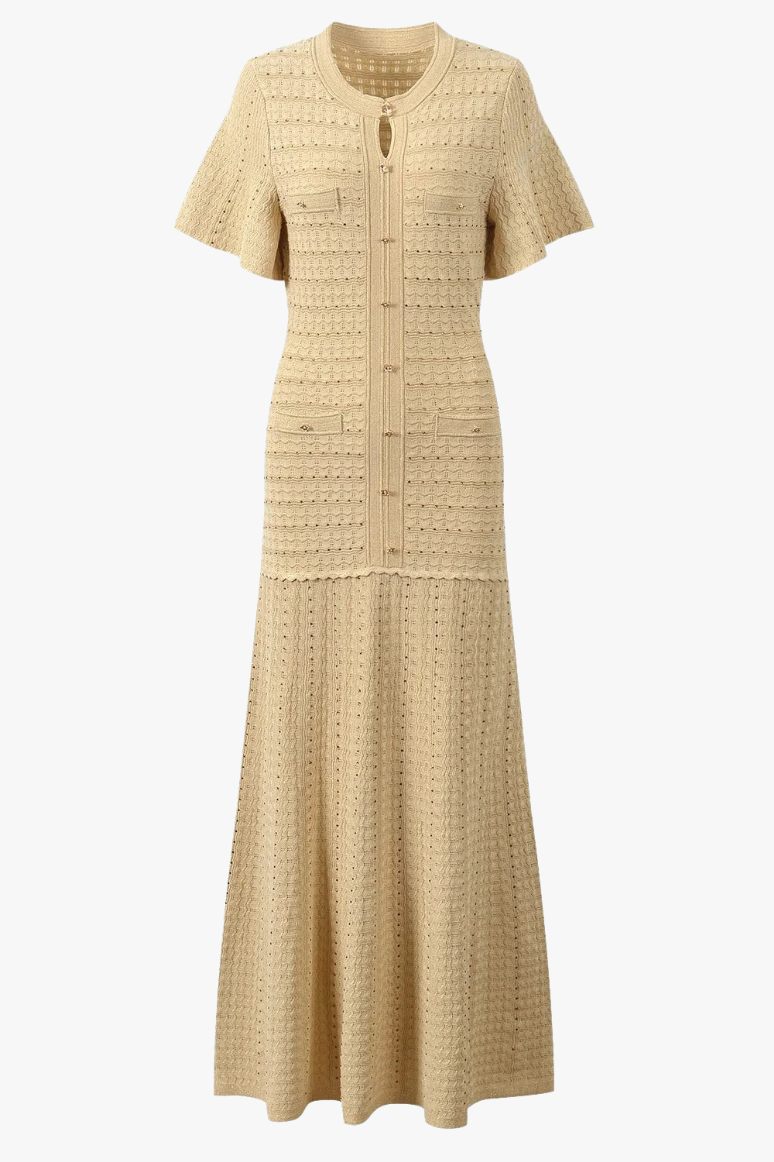A refined long knit dress crafted with detailed textured weaving and a clean front button closure. The tailored upper silhouette gently contours the body before falling into a sleek long skirt, creating an elegant and balanced shape. Finished with short sleeves and subtle structure, perfect for a polished everyday or occasion look.