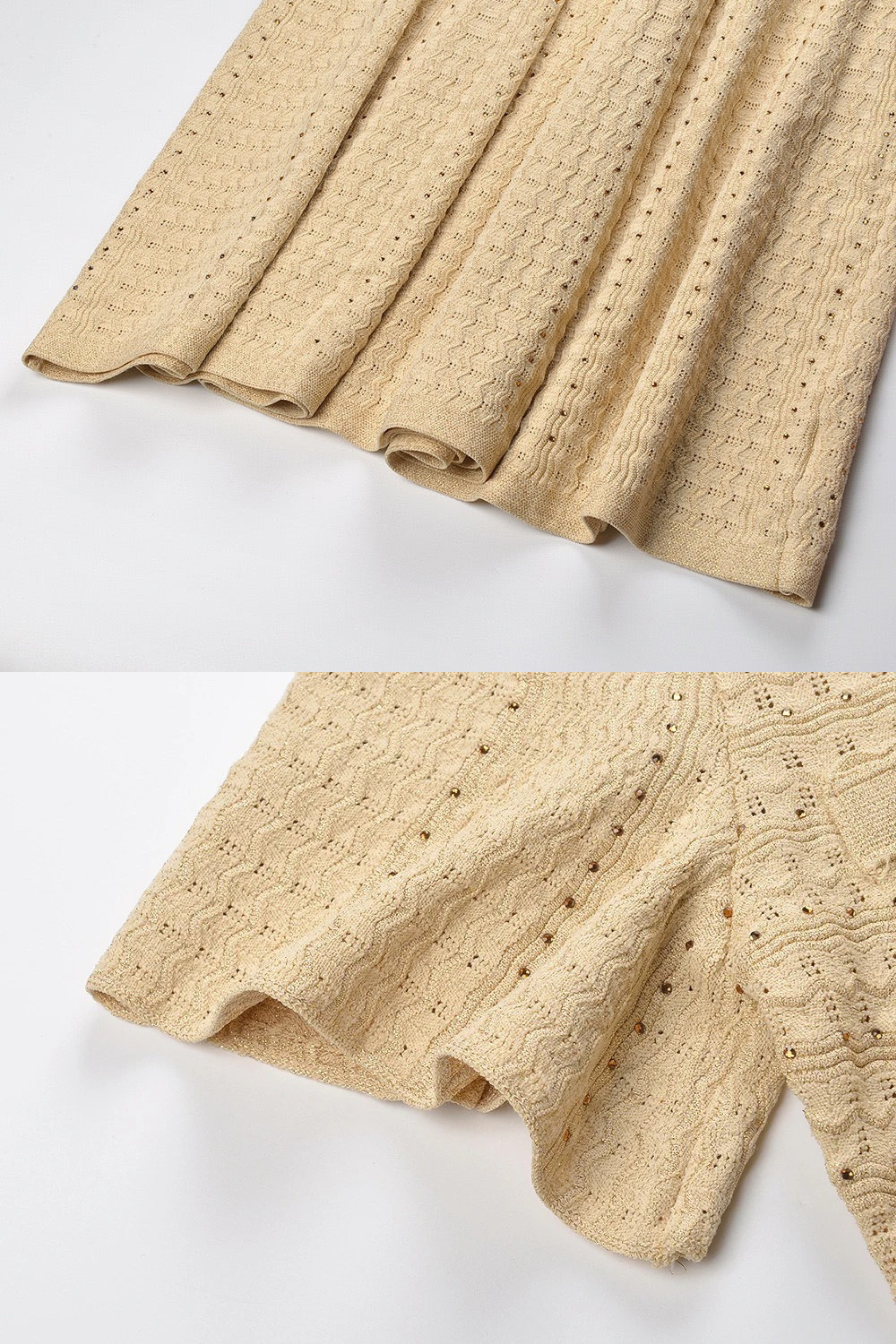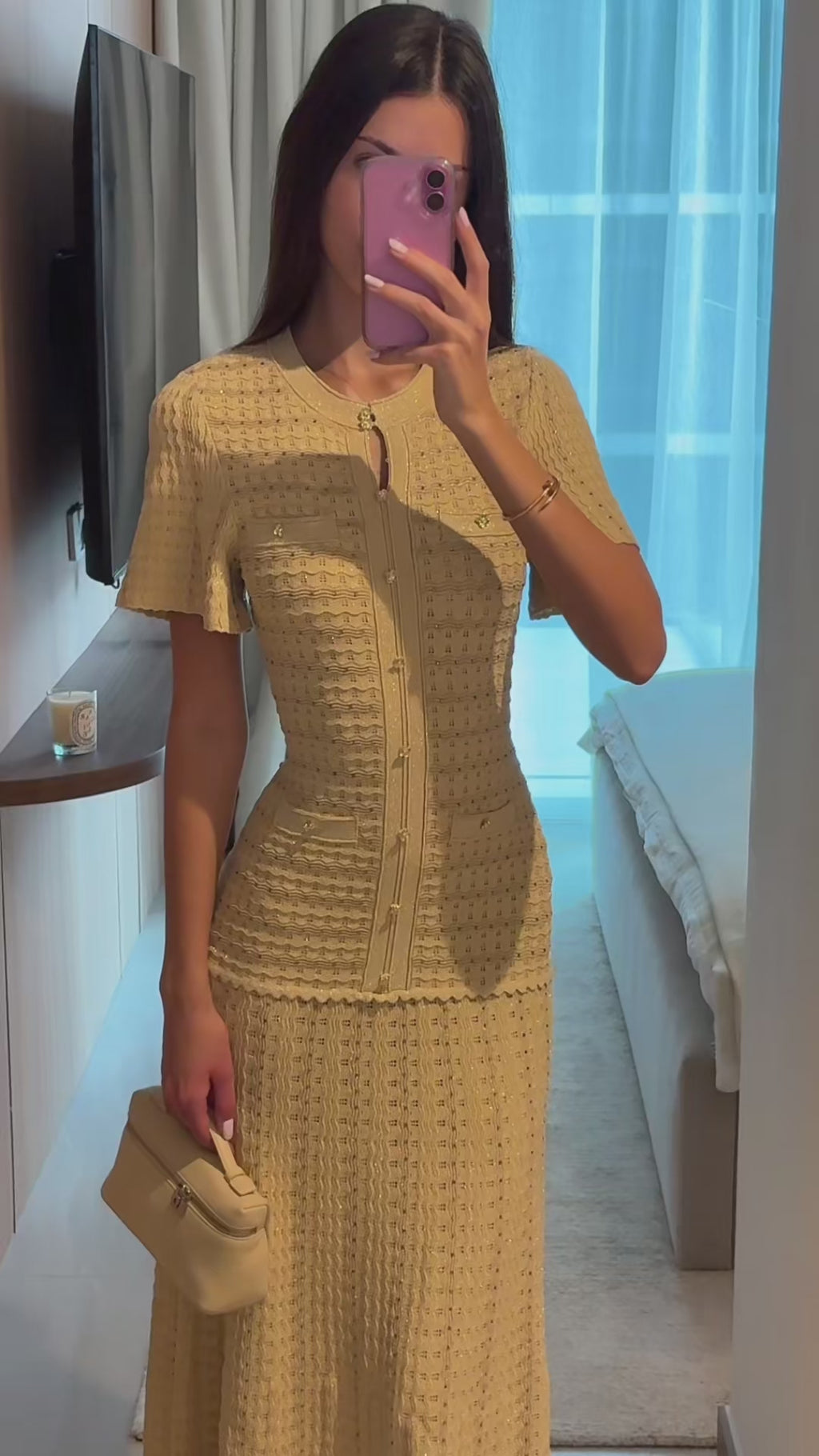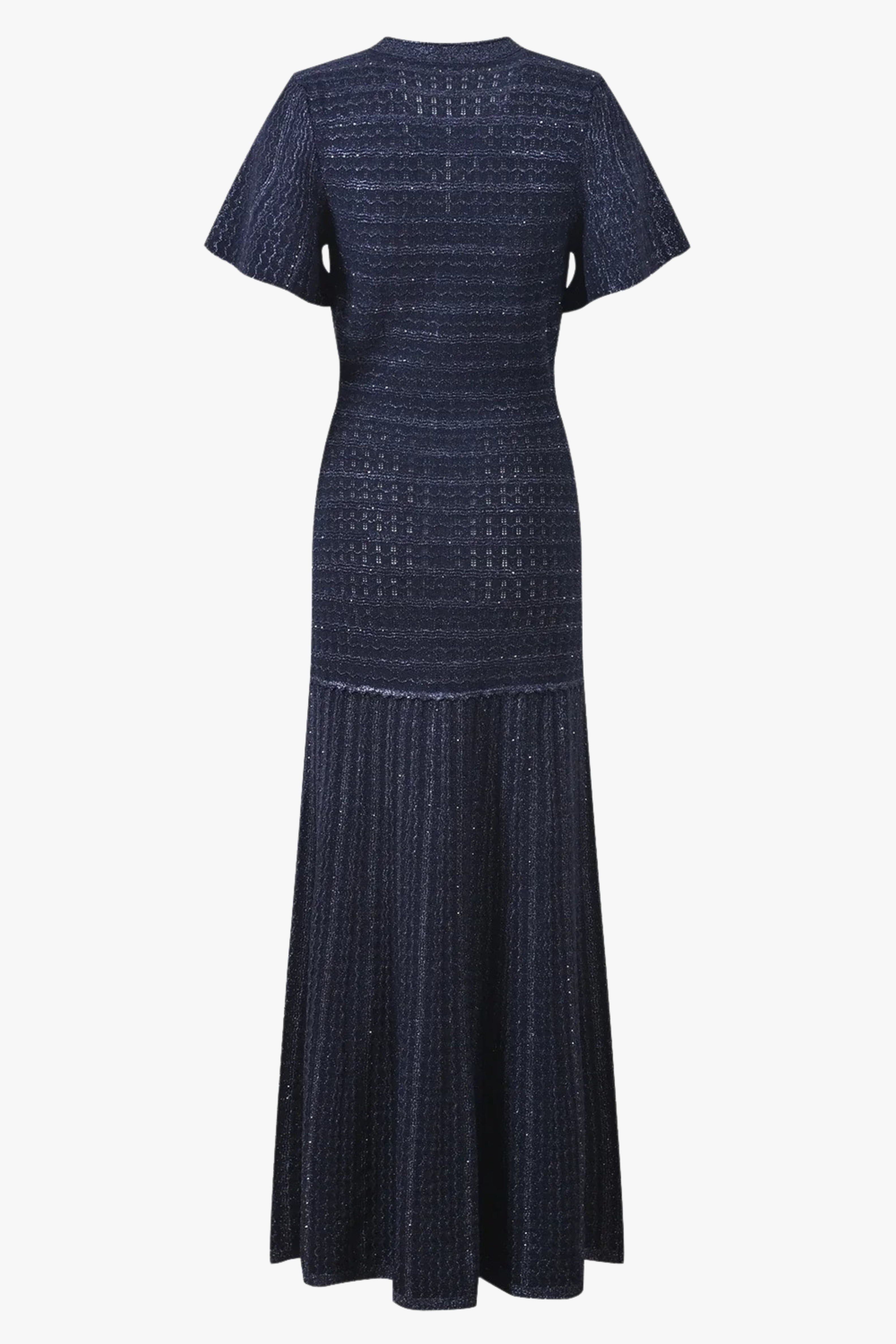A refined long knit dress crafted with detailed textured weaving and a clean front button closure. The tailored upper silhouette gently contours the body before falling into a sleek long skirt, creating an elegant and balanced shape. Finished with short sleeves and subtle structure, perfect for a polished everyday or occasion look.