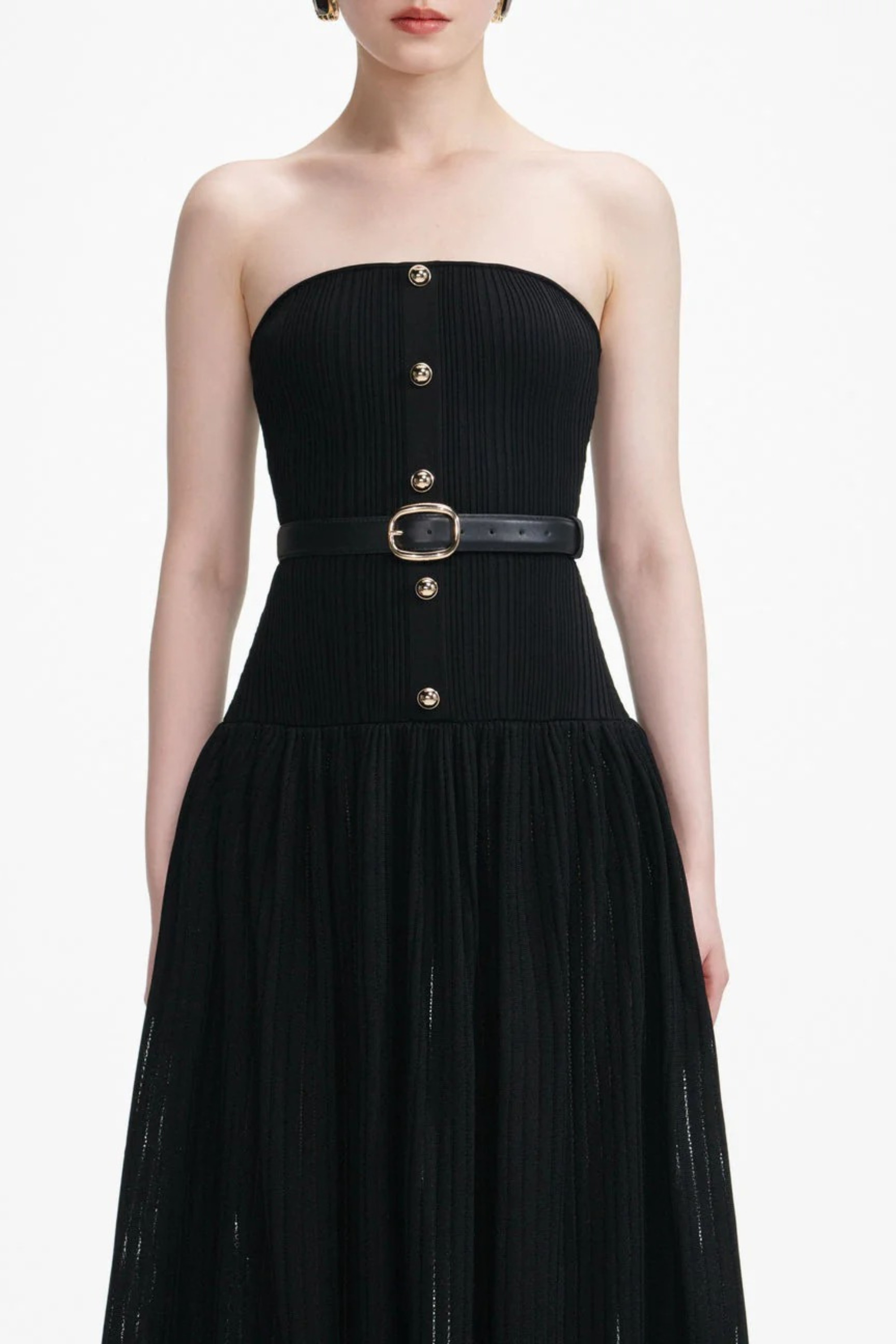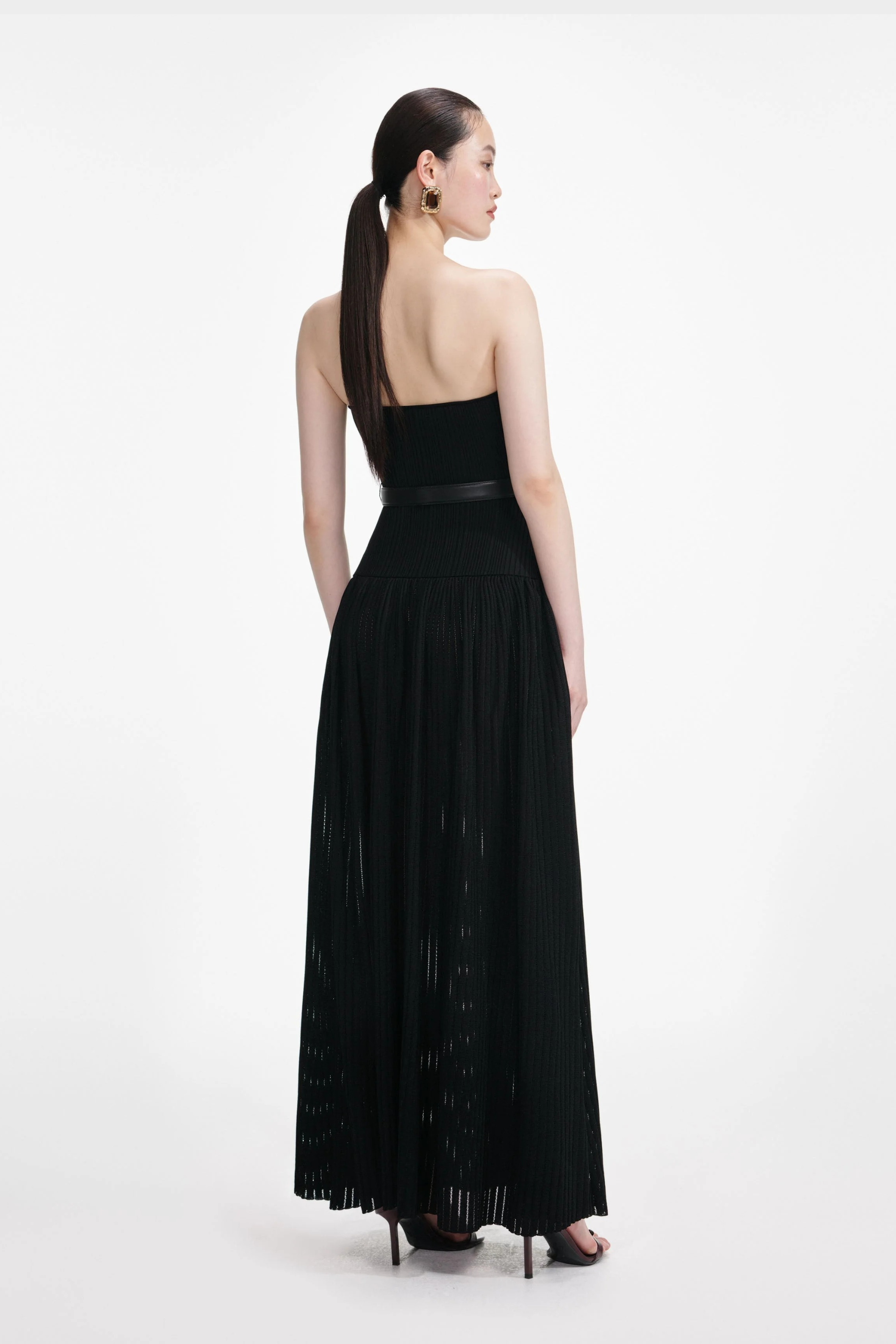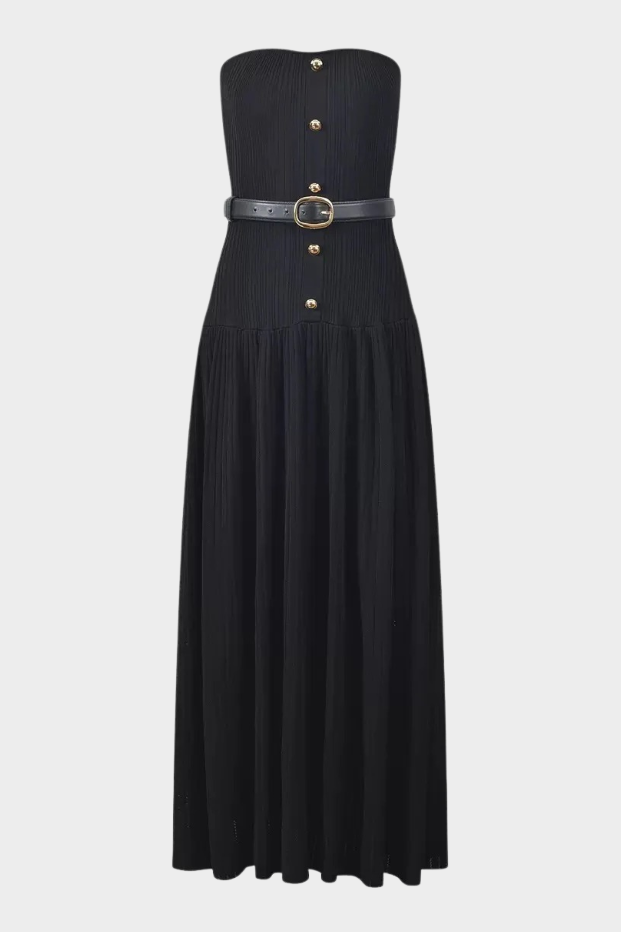A timeless strapless maxi dress designed in a soft, stretchy pleated knit that flatters every curve. The structured bodice gives secure support, while the flowing pleated skirt creates graceful movement. Finished with a sleek adjustable belt for a defined, elegant silhouette—perfect for evenings, events, and elevated everyday style.