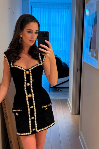 Long Sleeve Tweed Mini Dress with Pearl-Trimmed Square Neck and Pocket Details