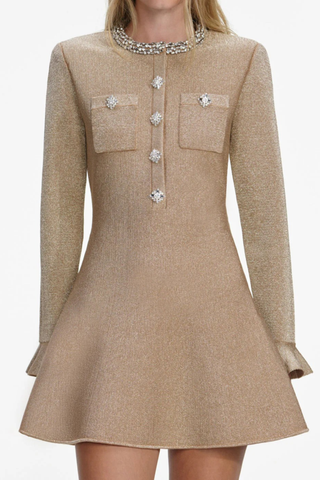 Round Neck Slim-Fit Wool-Blend Mini Dress with Crystal Embellished Buttons