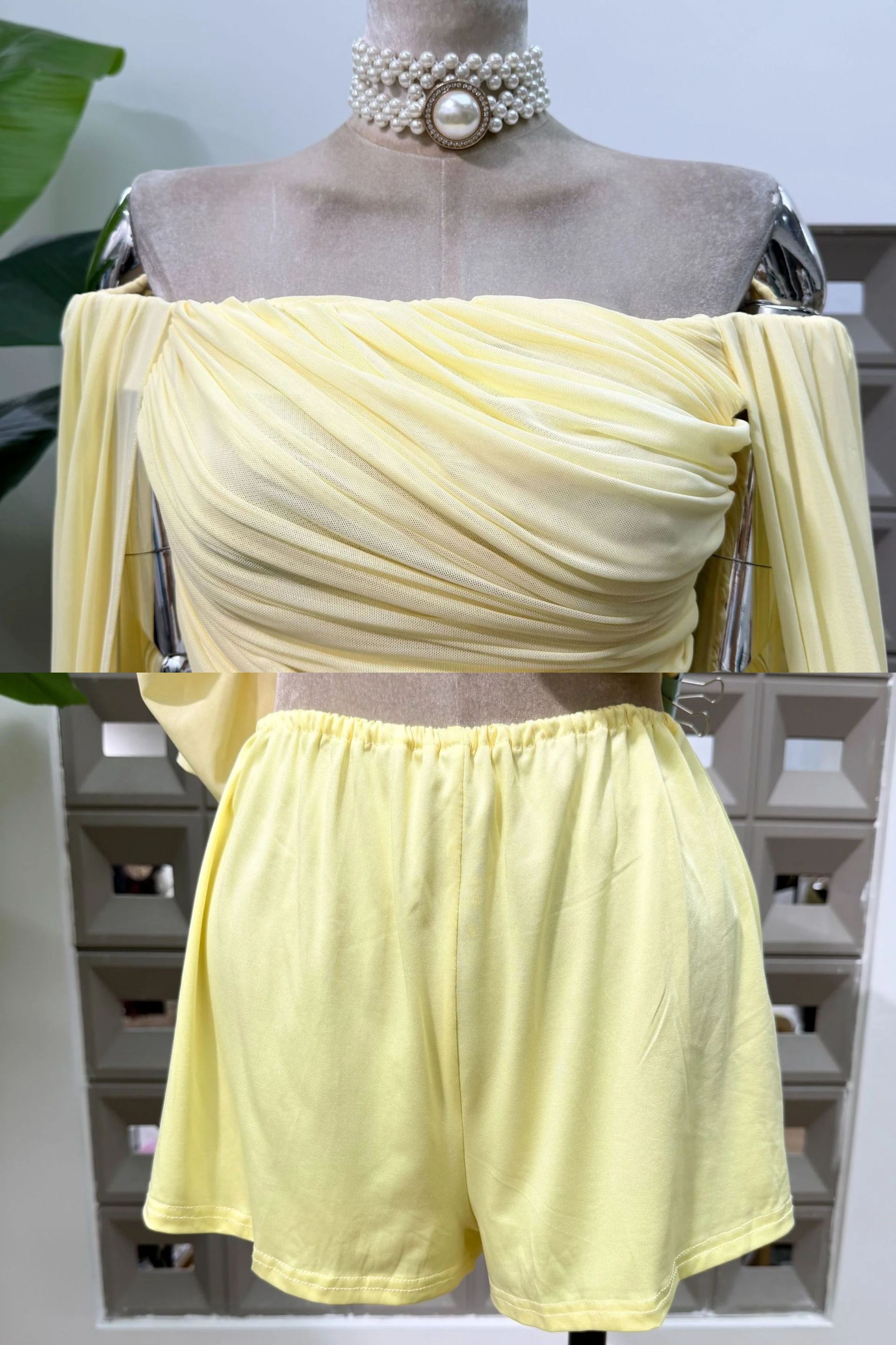 A delicate blend of elegance and modern femininity, this mini dress features a softly draped off-shoulder neckline paired with flowing sheer sleeves that add movement and lightness to the look.