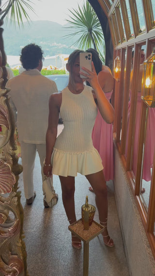 This chic sleeveless mini dress blends comfort with style, featuring a fitted knitted bodice that hugs the figure and a flared ruffled hem for a playful finish. Crafted from soft, stretch-knit fabric in a creamy off-white hue, it offers a flattering silhouette perfect for summer events, brunch dates, or elegant vacations. Style it with strappy heels or flats for a polished, feminine look.