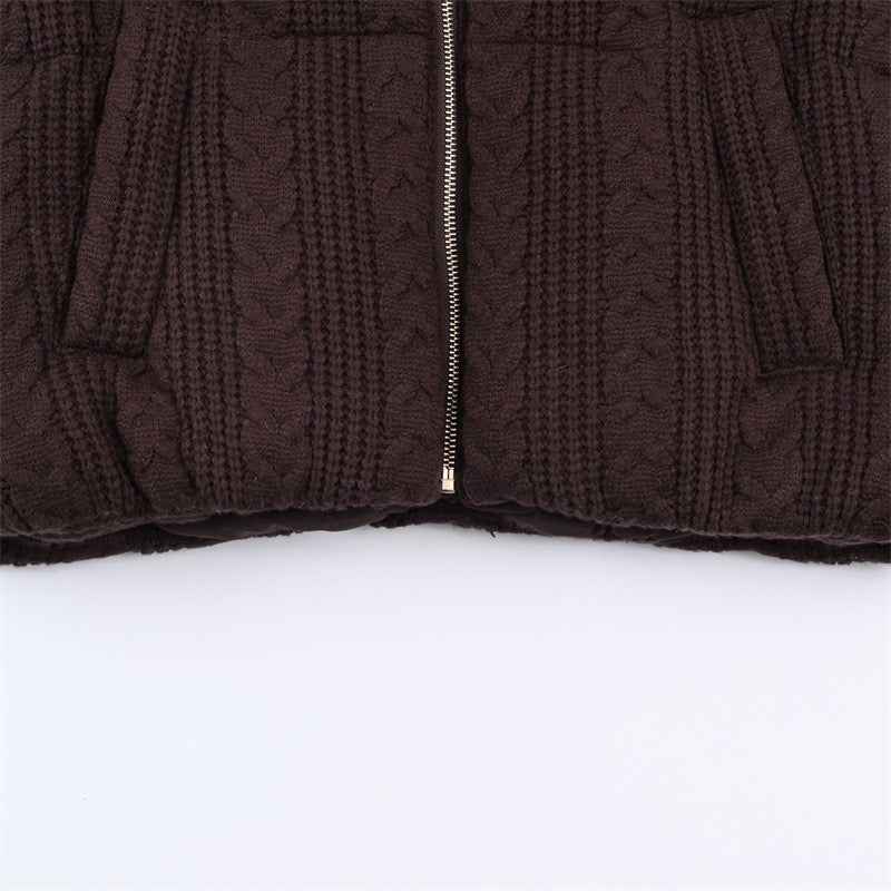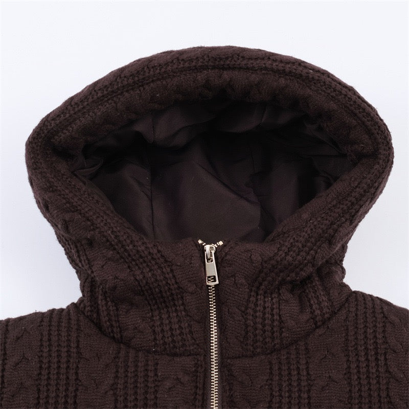 Stay warm and stylish with this Cable Knit Puffer Jacket with Hood, designed for extra comfort and winter warmth. Made from soft knitted fabric with padded filling, it keeps you cozy while giving a chic and modern look. The jacket features a full front zipper, long sleeves, and a comfy hood for extra protection on cold days. Perfect for everyday wear, casual outings, and winter travels.