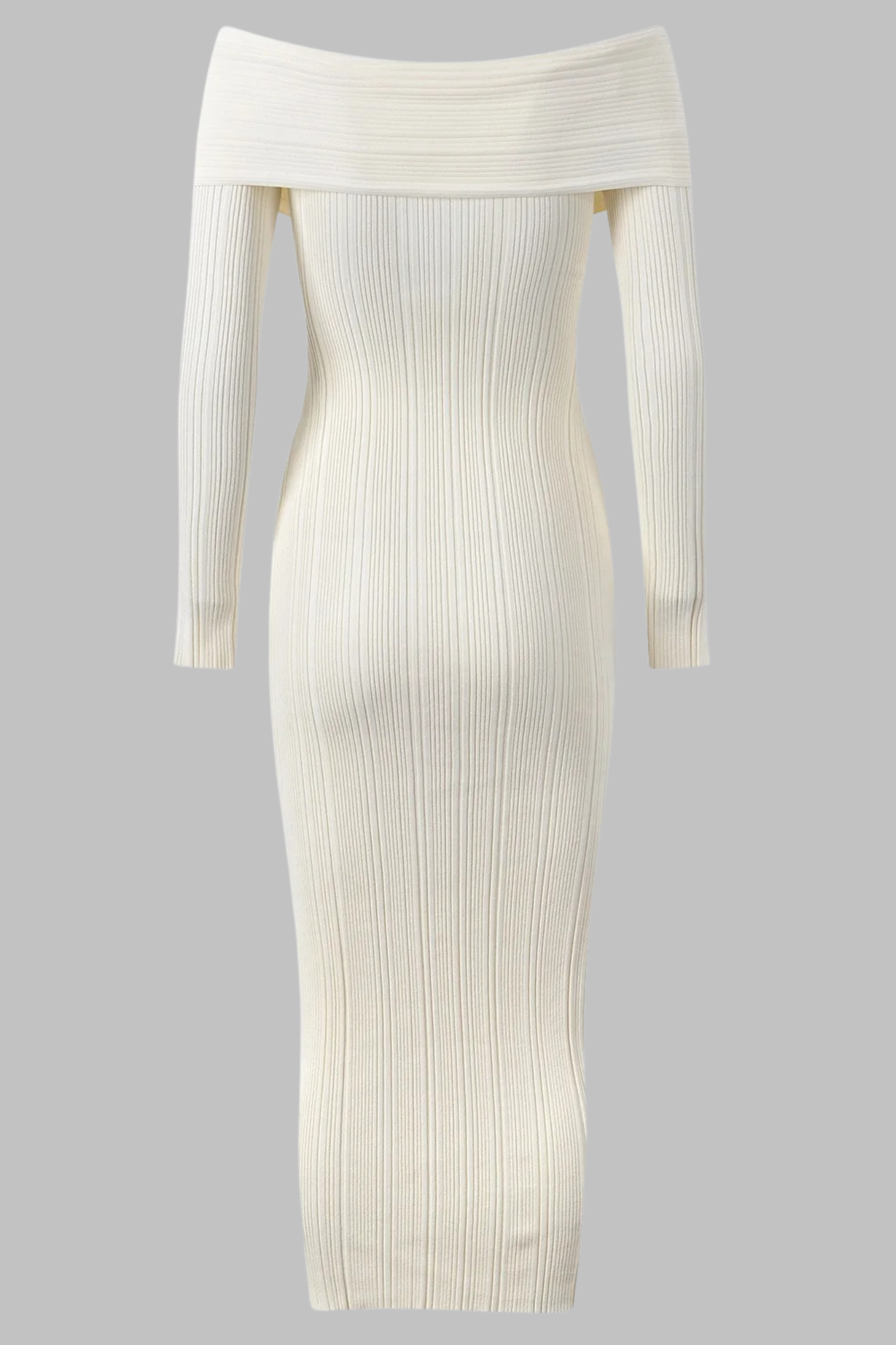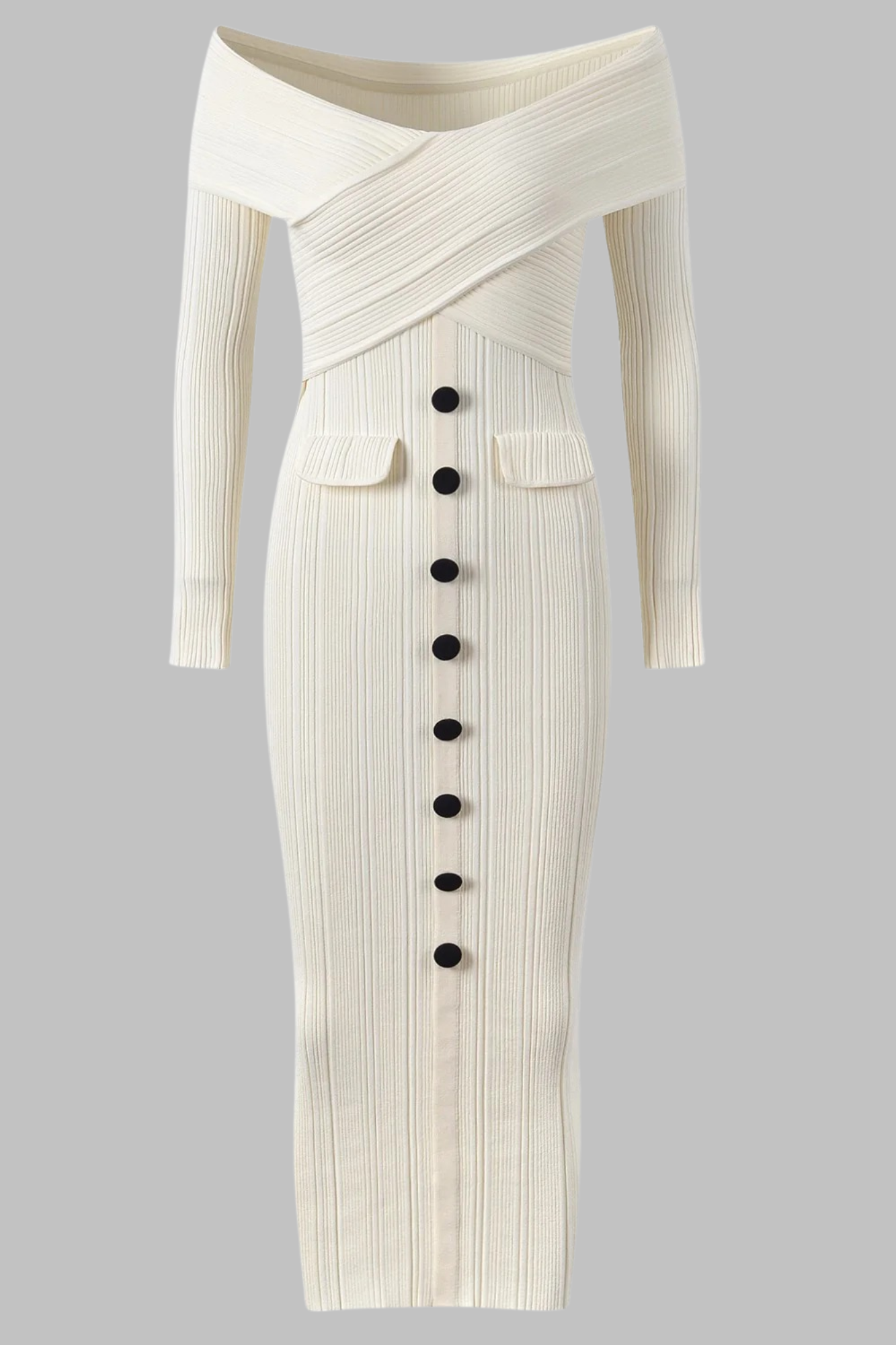 Elegant and modern, this ribbed knit mid-long dress features a folded off-shoulder neckline that highlights the décolletage with refined charm. The long sleeves and front button design add a touch of sophistication, while the soft, stretchy knit fabric offers a flattering and comfortable fit. Ideal for evening events, dinner outings, or special occasions, blending timeless elegance with a contemporary silhouette.