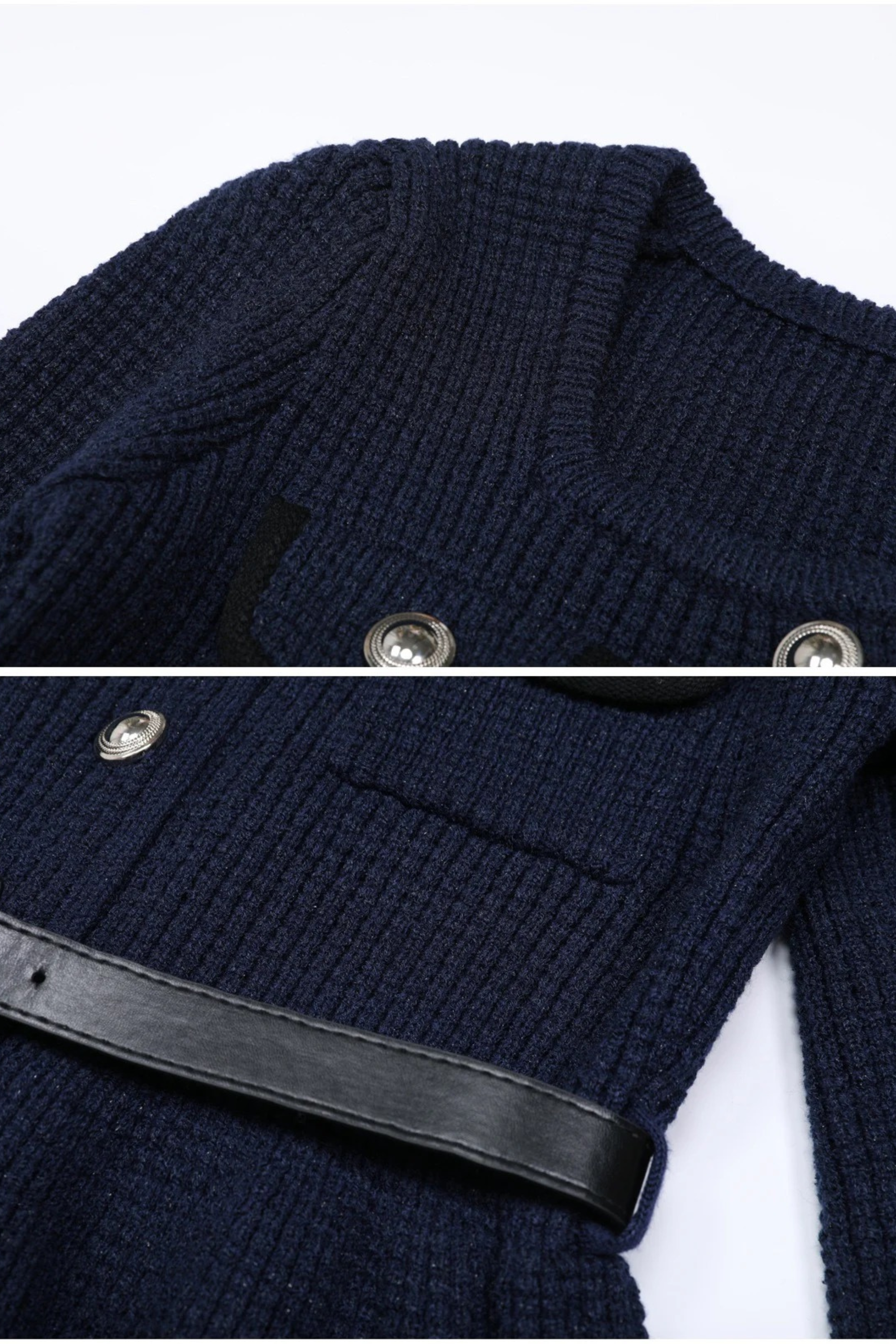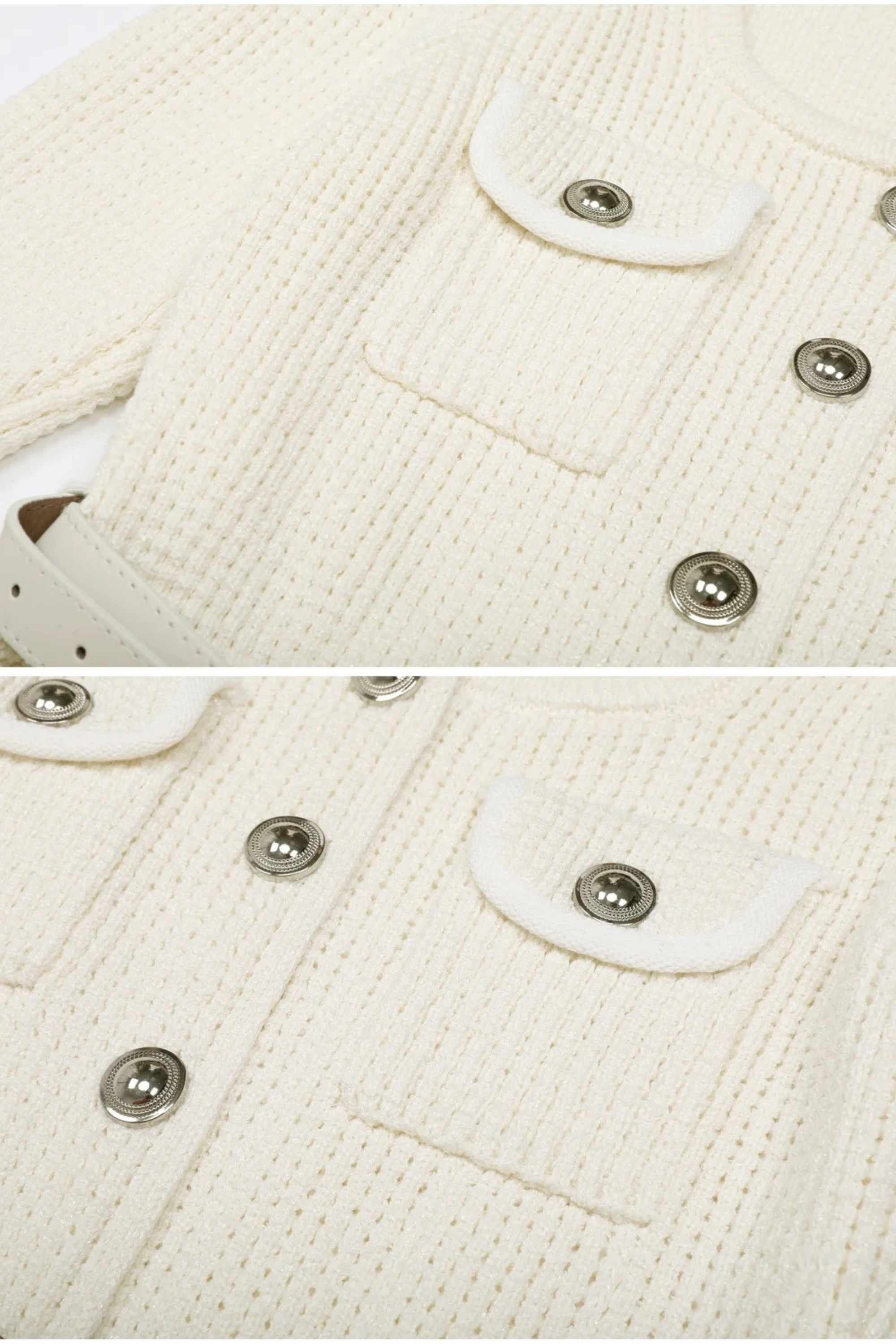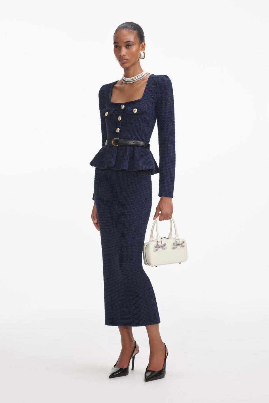 Elegant and structured, this two-piece knitted set includes a long-sleeve peplum cardigan and a matching high-waist pencil skirt, both crafted from soft ribbed knit fabric for a refined textured finish. The cardigan features a square neckline, decorative flap pockets, and metallic button detailing, cinched at the waist with a coordinating belt that defines the silhouette beautifully. The peplum hem adds volume and femininity, balancing the sleek, form-fitting long skirt that falls gracefully to the ankle. Sophisticated yet comfortable, this belted knit set is ideal for elegant daytime wear or polished evening occasions. Available in navy blue and ivory.