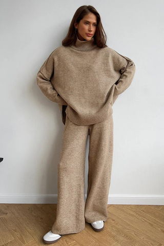 Soft Knit Two-Piece Set with Long-Sleeve Turtleneck and Relaxed Pants