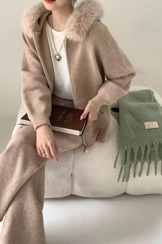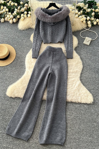 Cozy Fuzzy Knit Hoodie & Wide-Leg Pants Set - Soft Two-Piece Loungewear