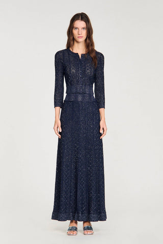 Two-Piece Textured Knit Set – Pearl-Button Cardigan & Flared Maxi Skirt
