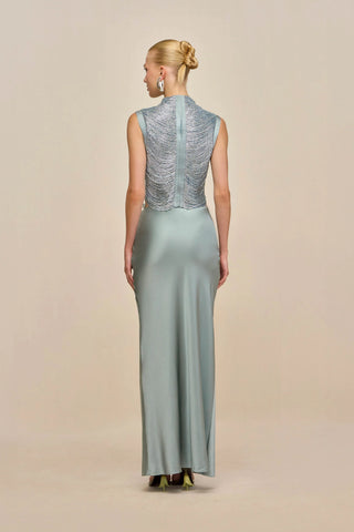 Sleeveless Bandage Metallic Top & Satin Skirt Set – Sculpted High Neck, Fluid Draped Fit, Refined Evening Look