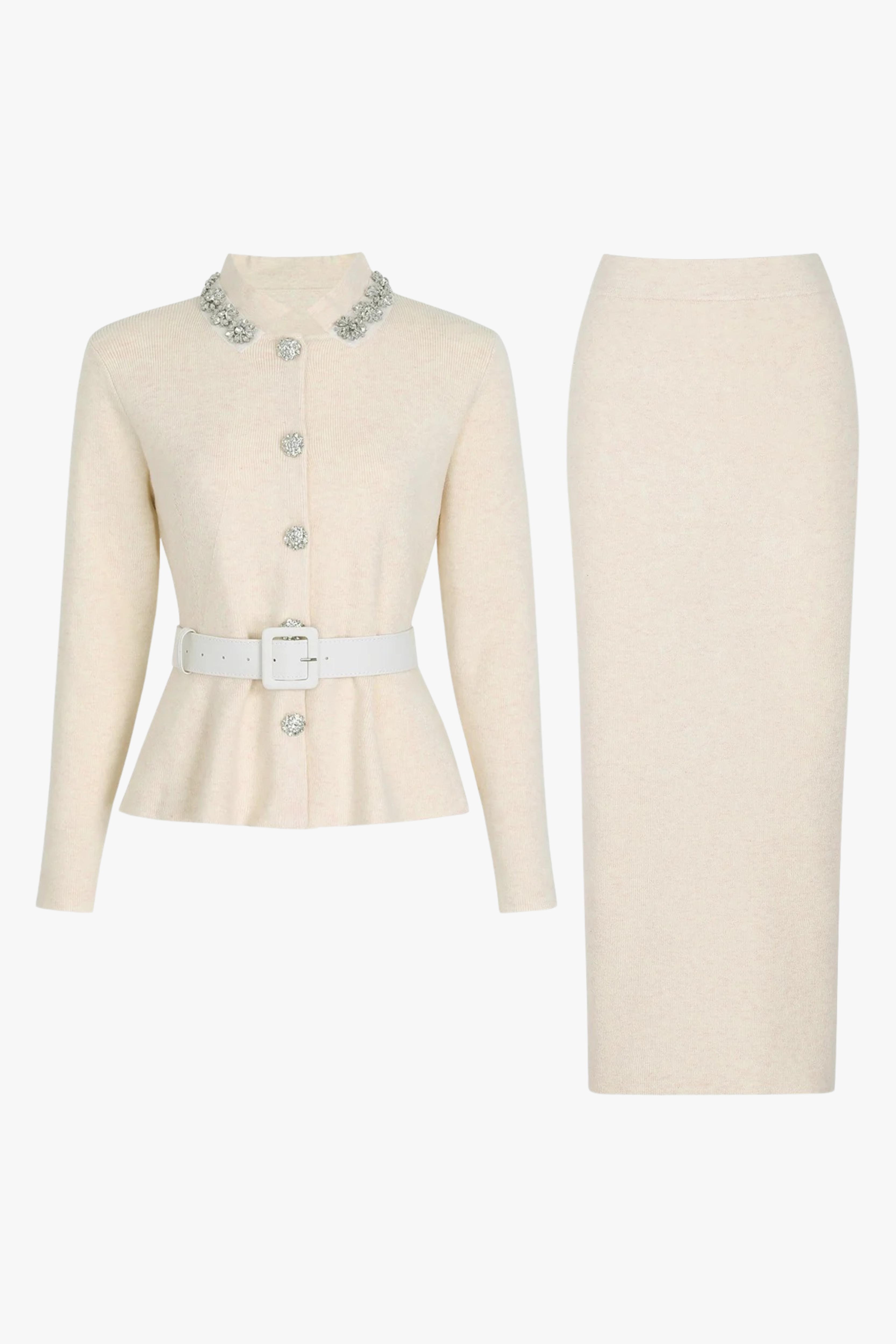 Elegant two-piece set crafted from soft stretch knit fabric for a structured yet comfortable fit. The top features a refined collar adorned with intricate embellishments, statement gold-tone buttons, and a flattering peplum silhouette with a matching waist belt for definition.