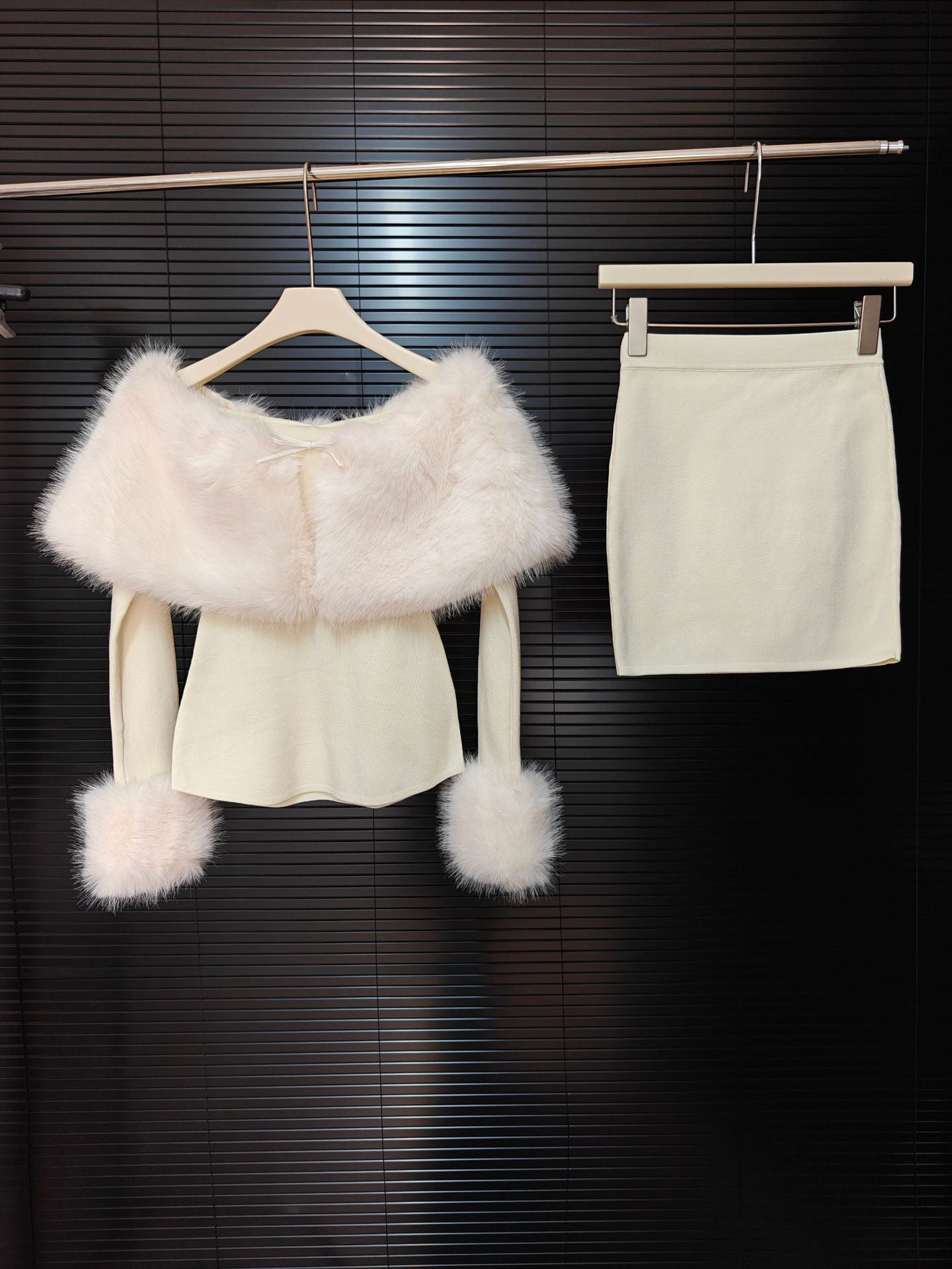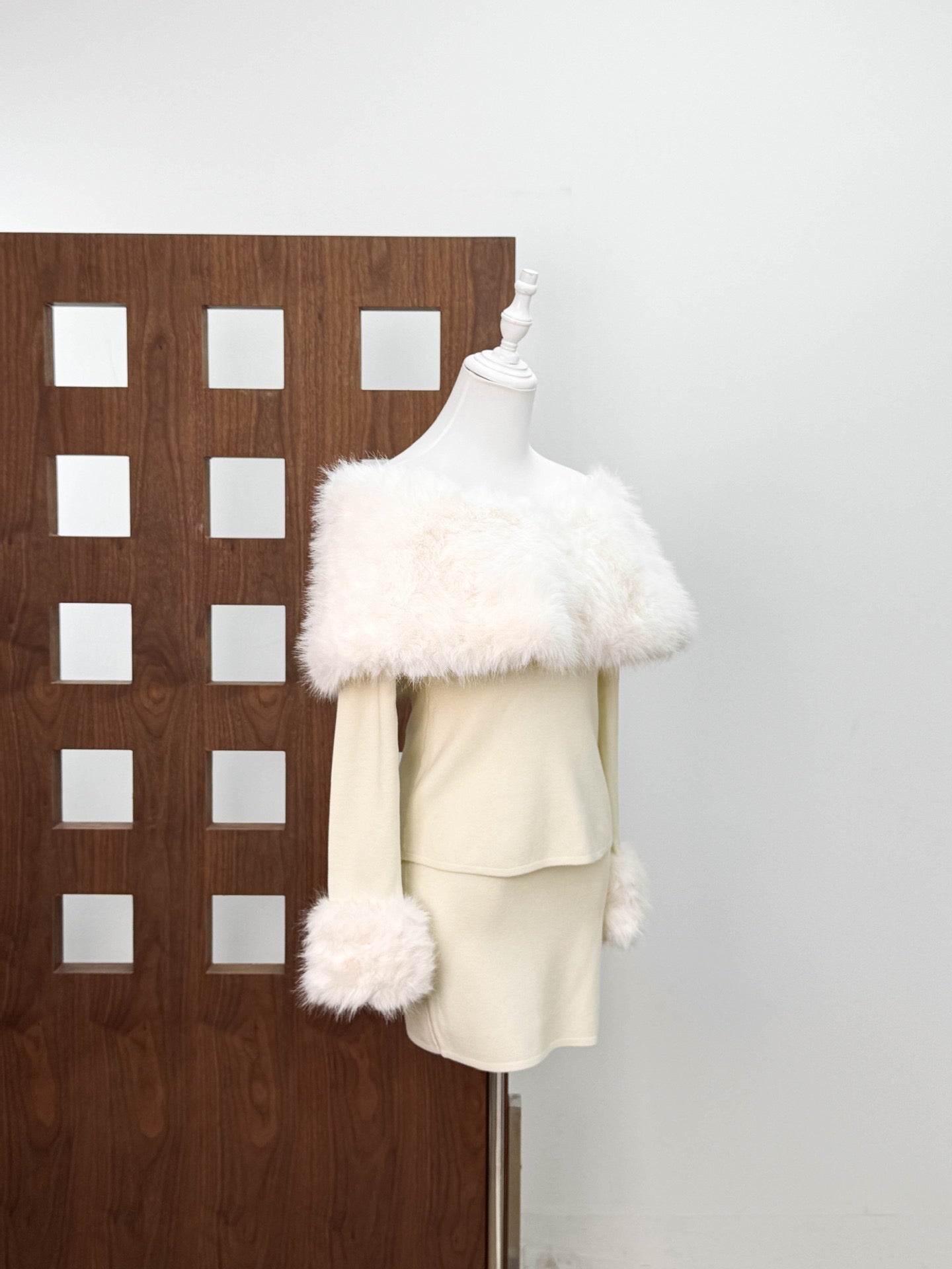 Elevate your look with this chic two-piece set featuring an off-shoulder faux fur top and a matching mini skirt. Designed for a flattering fit, this set blends elegance with modern glamour—perfect for nights out, special occasions, or stylish events.