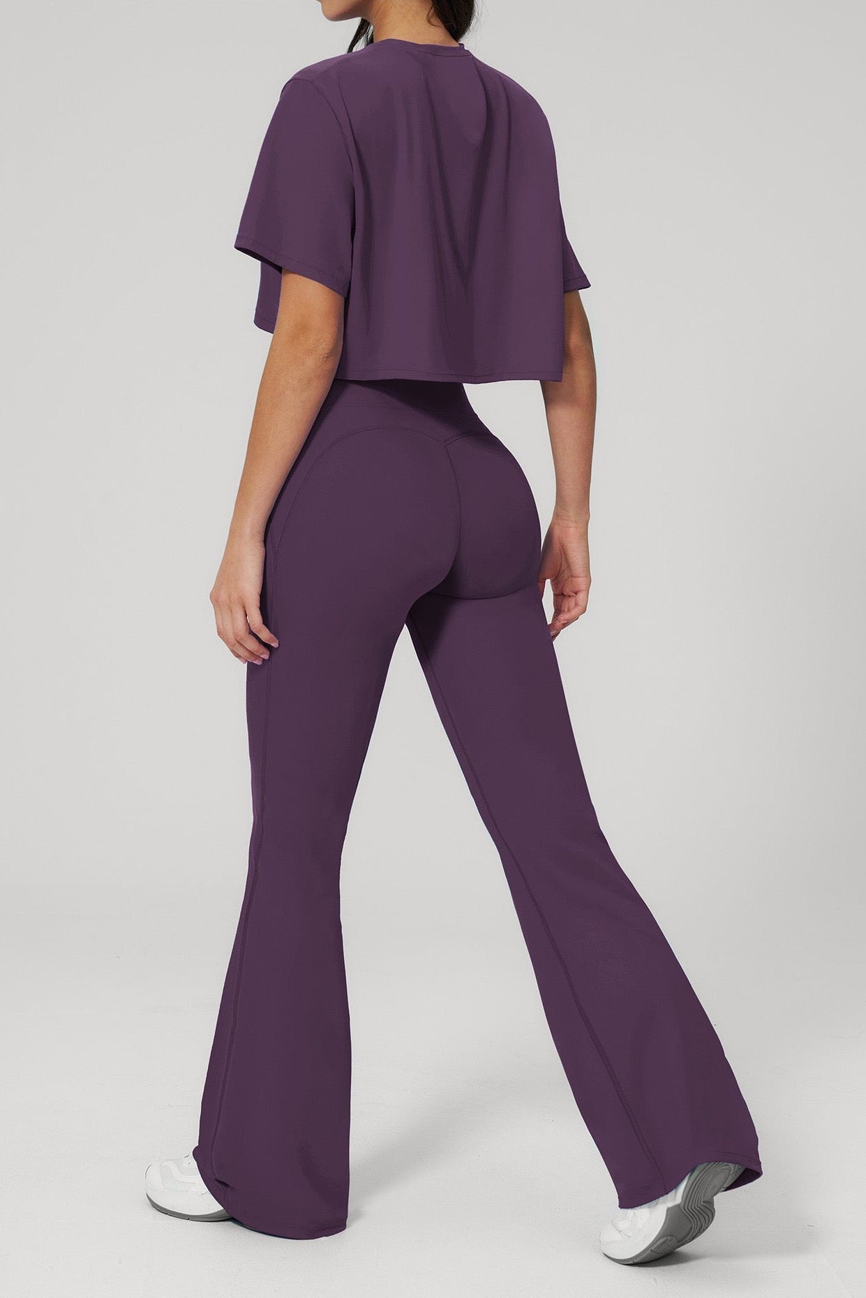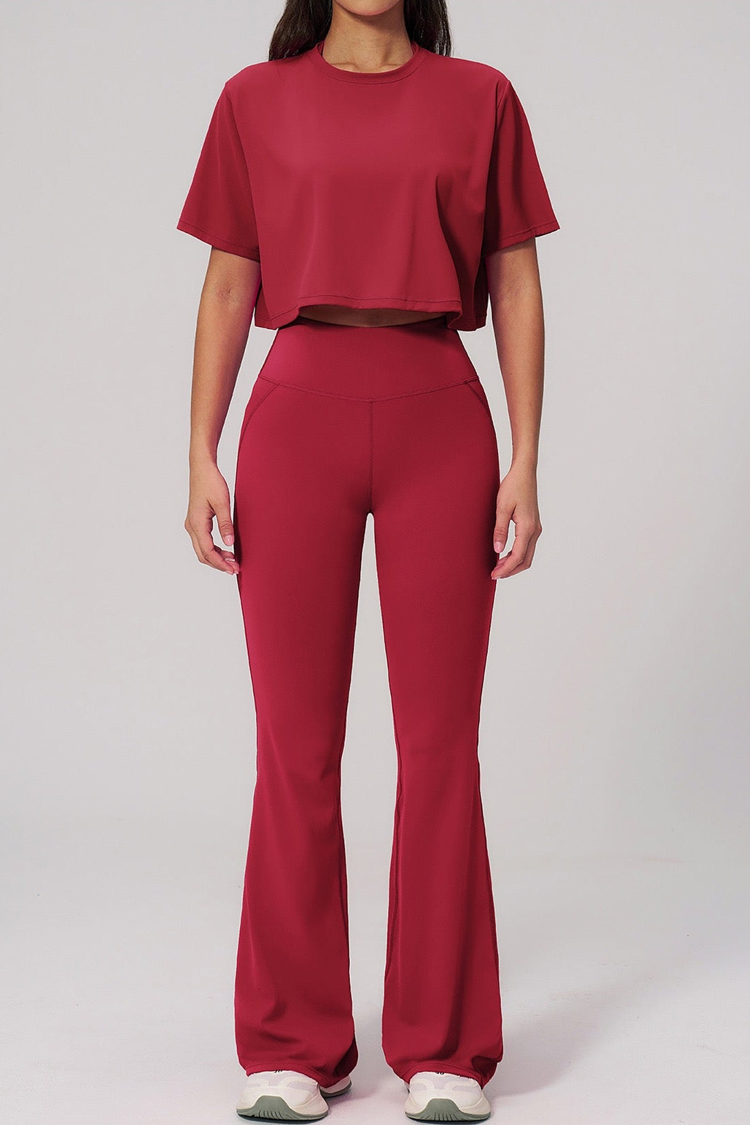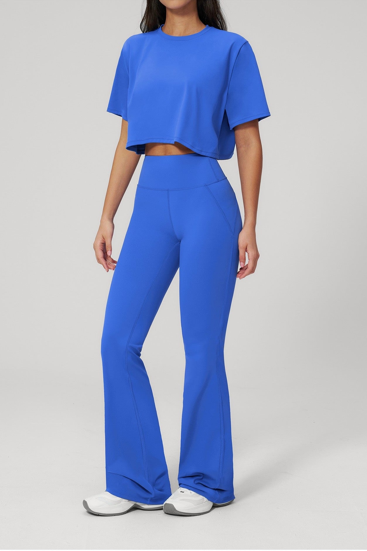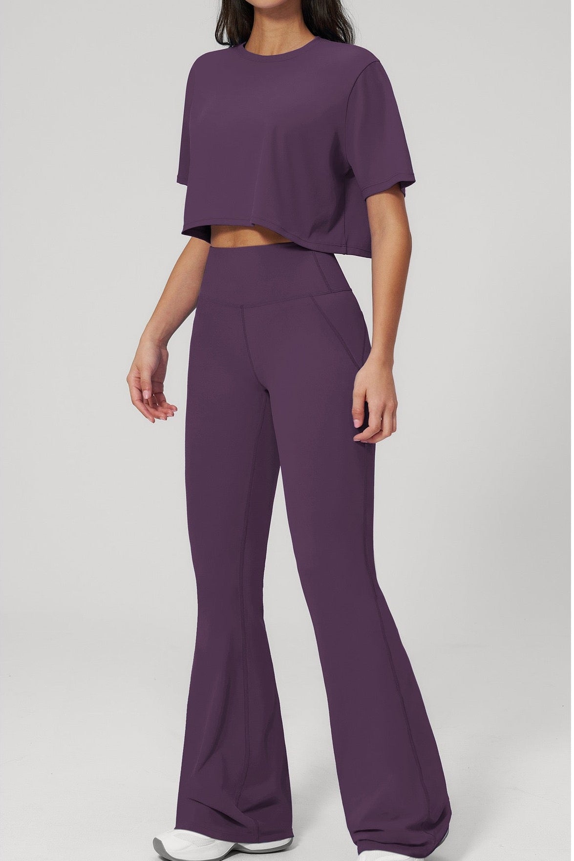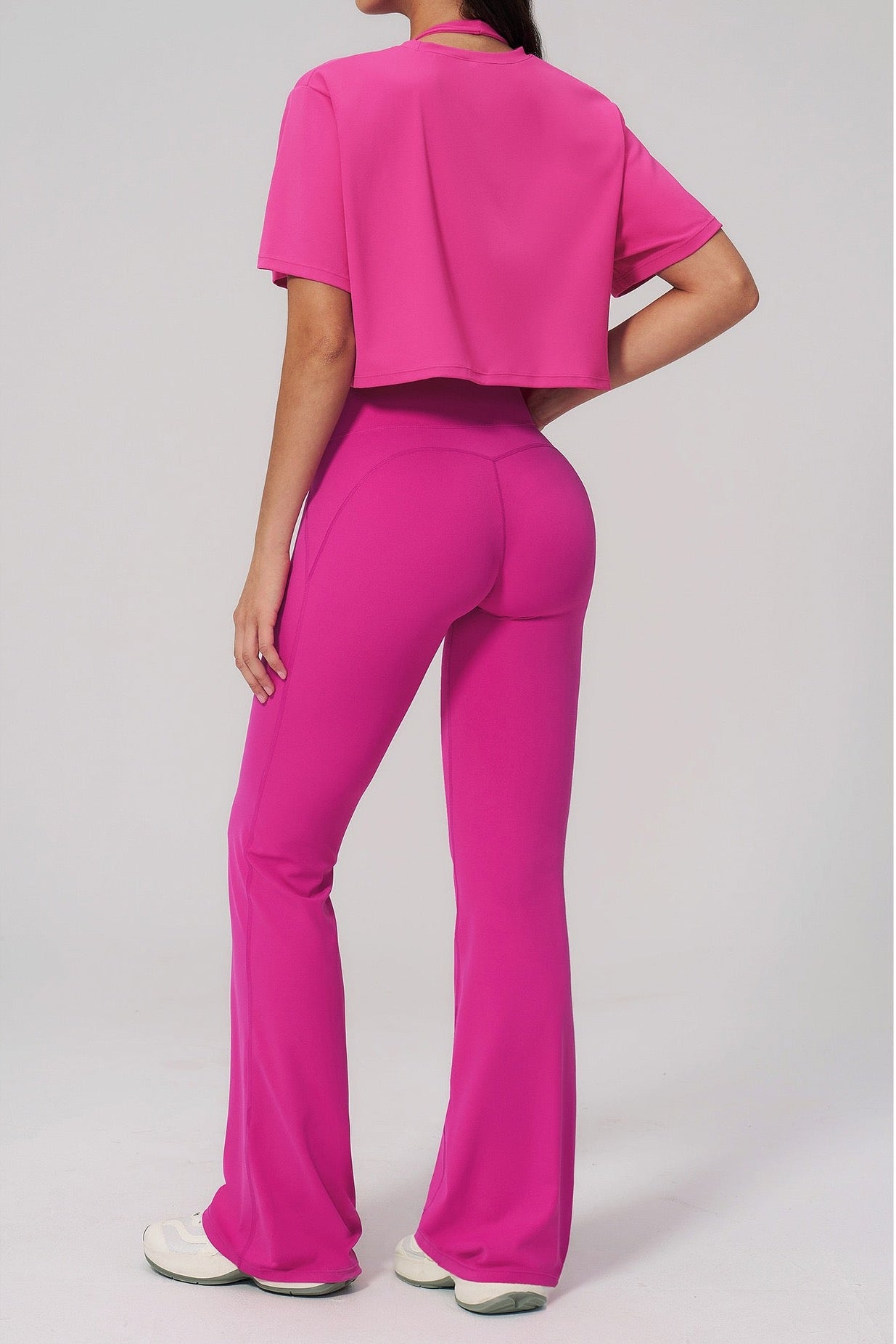 Crafted from a soft, premium stretch fabric, the set offers a smooth feel on the skin while providing flexibility and support. The fitted high-rise pants enhance the shape, while the flared leg adds movement and a subtle statement touch.