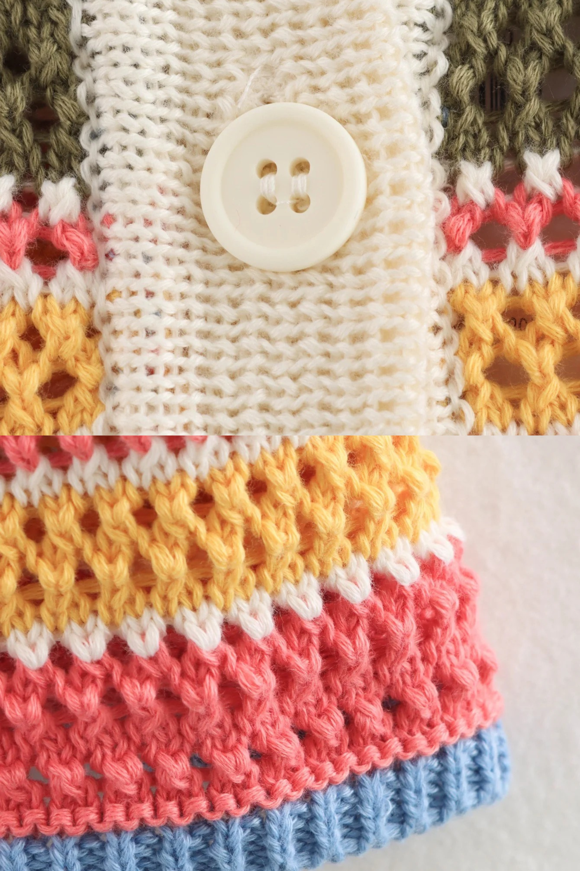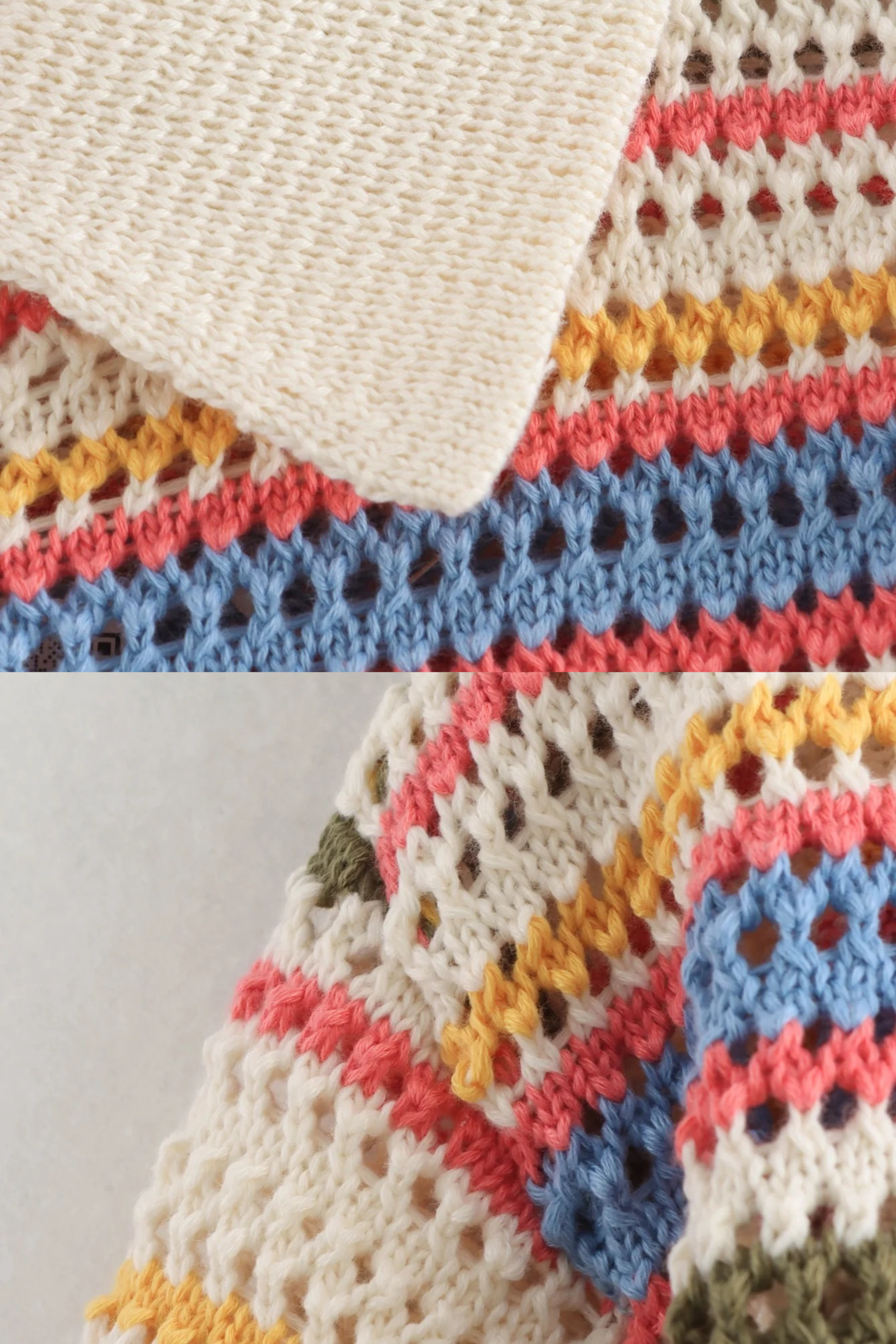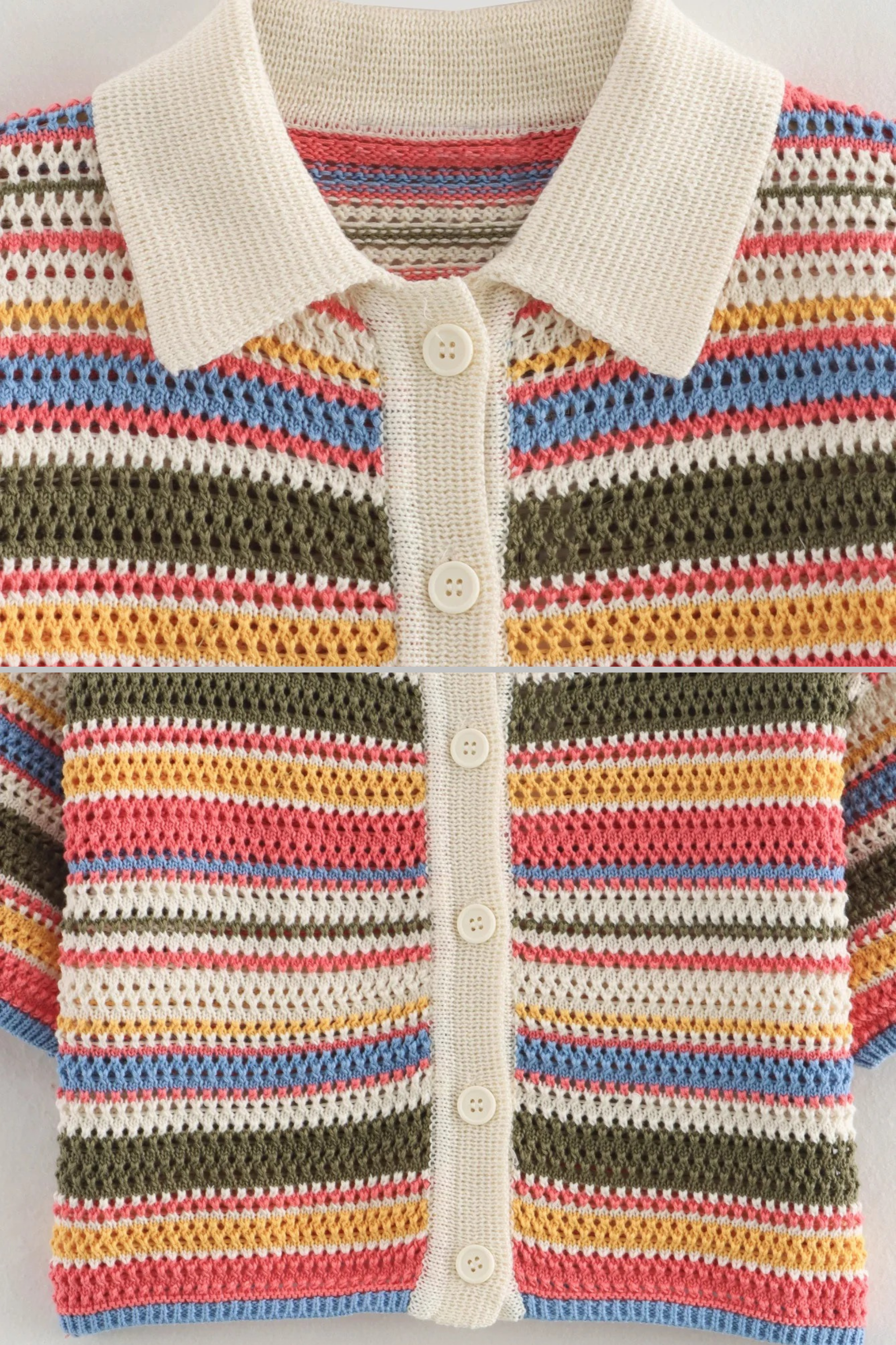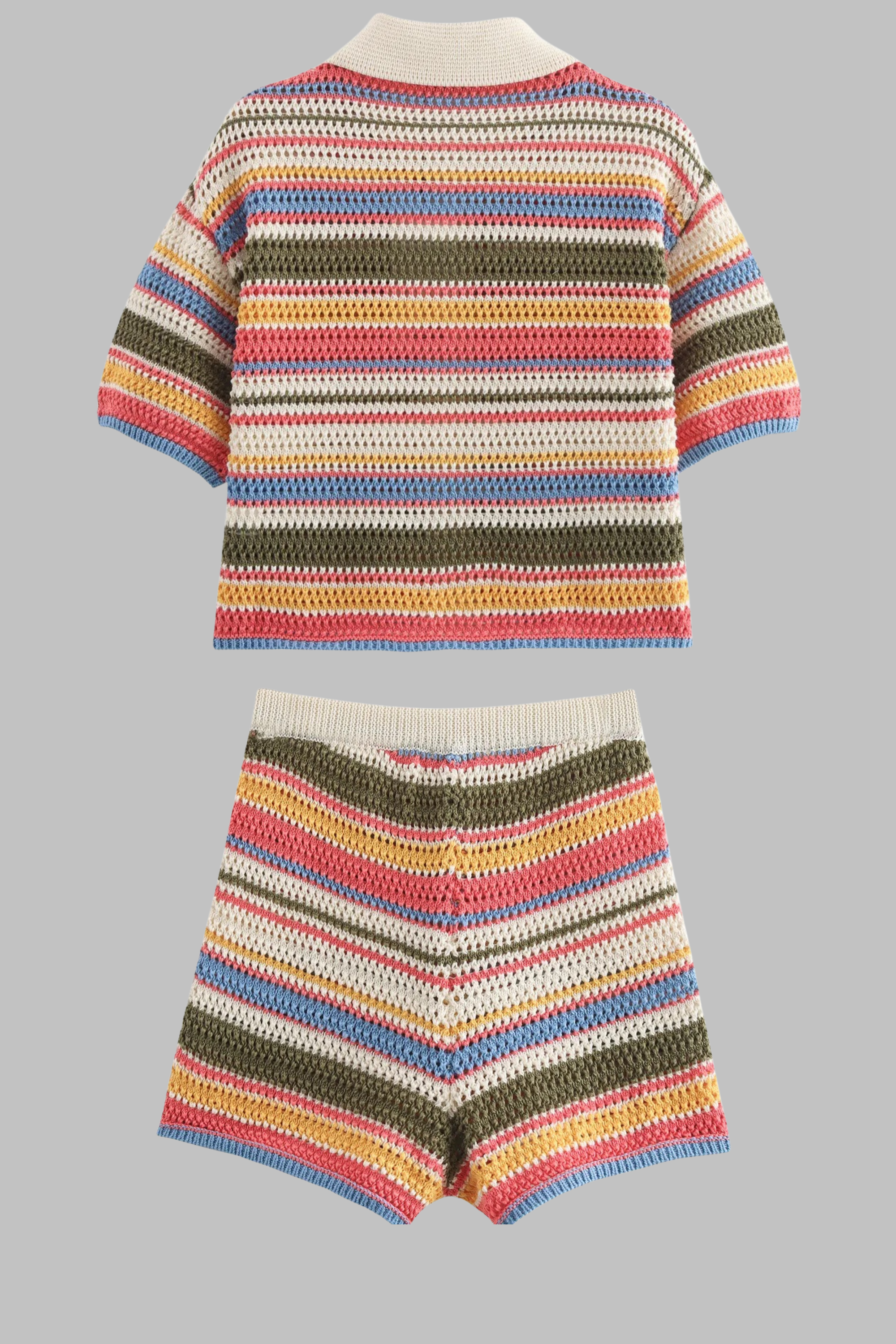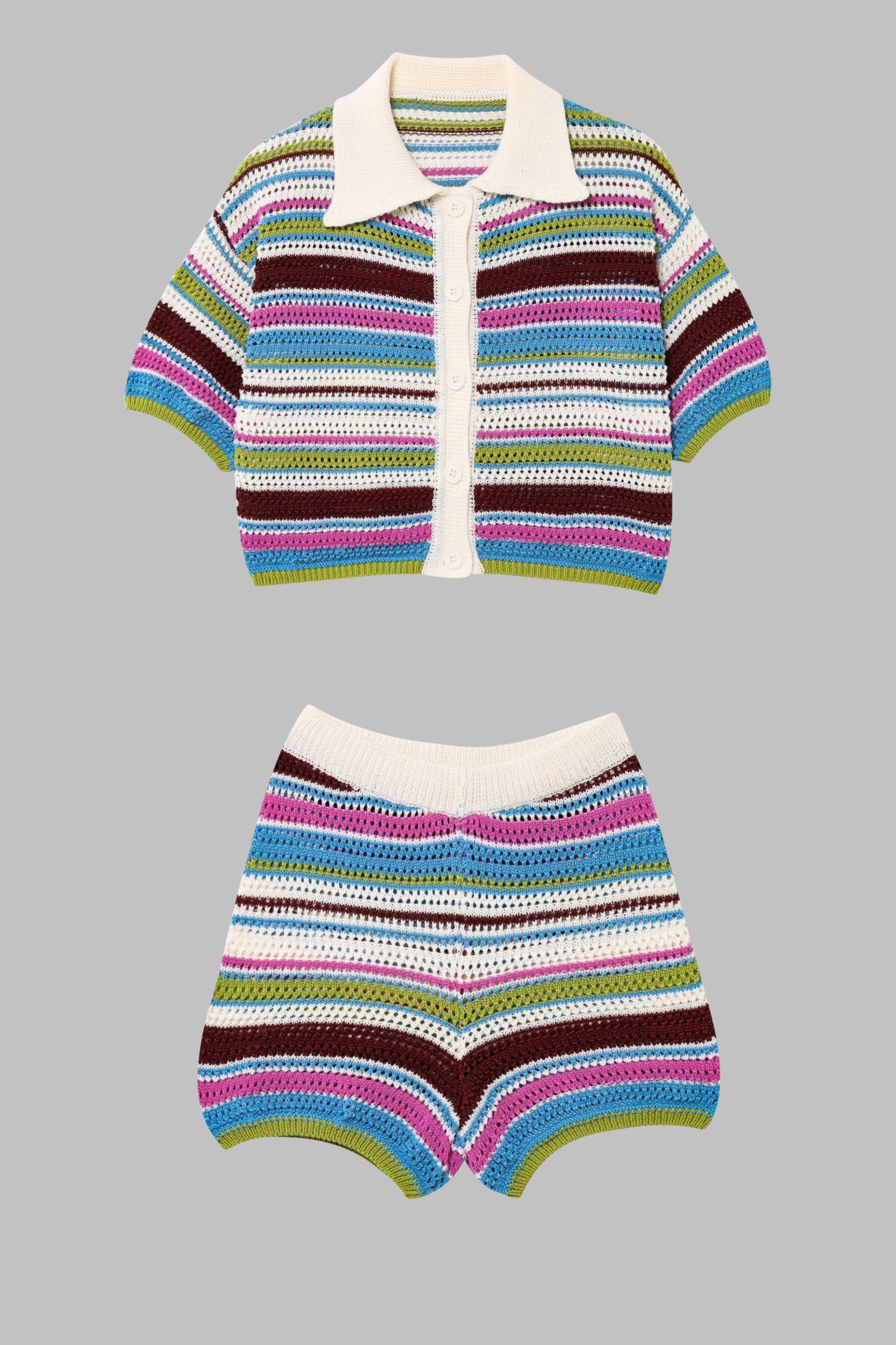 A chic handmade-look crochet set featuring a short-sleeve button-down knit top with a contrast collar and matching high-waist shorts. Designed in soft, breathable yarn with colorful retro stripes, this set combines comfort with effortless summer style. Perfect for beach strolls, brunch dates, or vacation days, it offers a relaxed yet fashionable vibe.