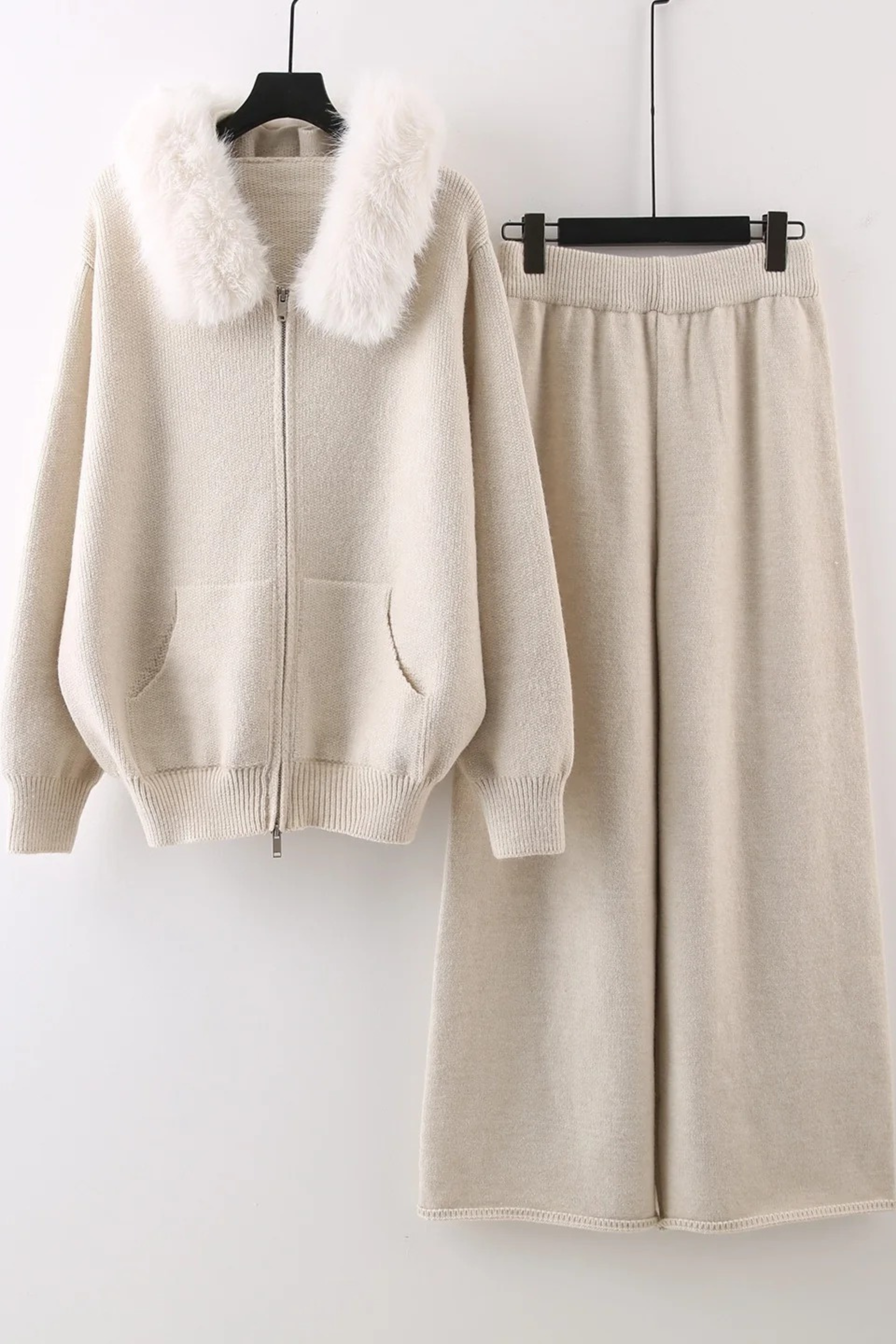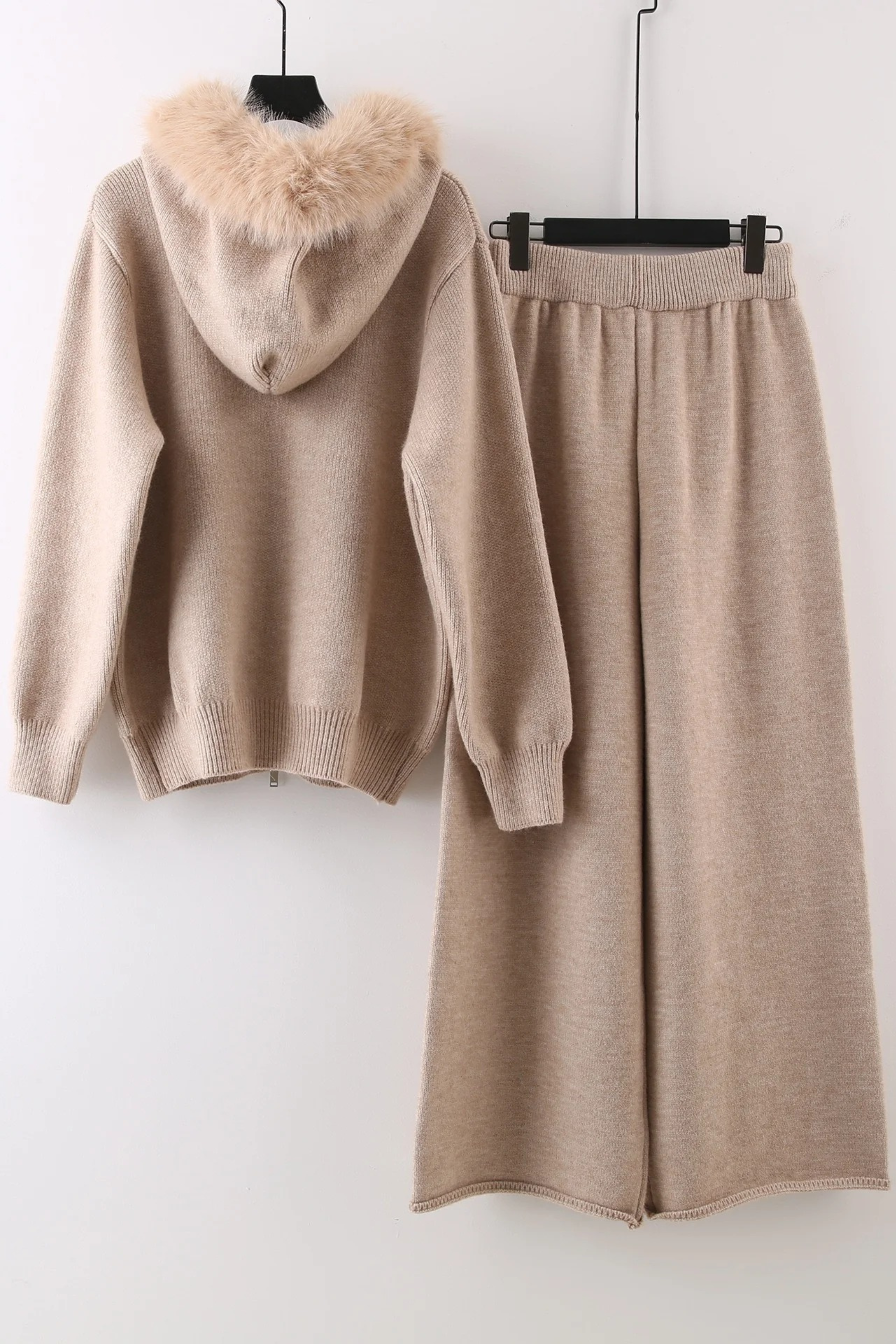 Designed for everyday comfort with a polished touch. This matching knit set features a zip-front hooded top with long sleeves and relaxed wide-leg pants. Soft, breathable knit material offers a cozy feel while maintaining a clean, modern silhouette—perfect for casual outings or elevated lounge wear.