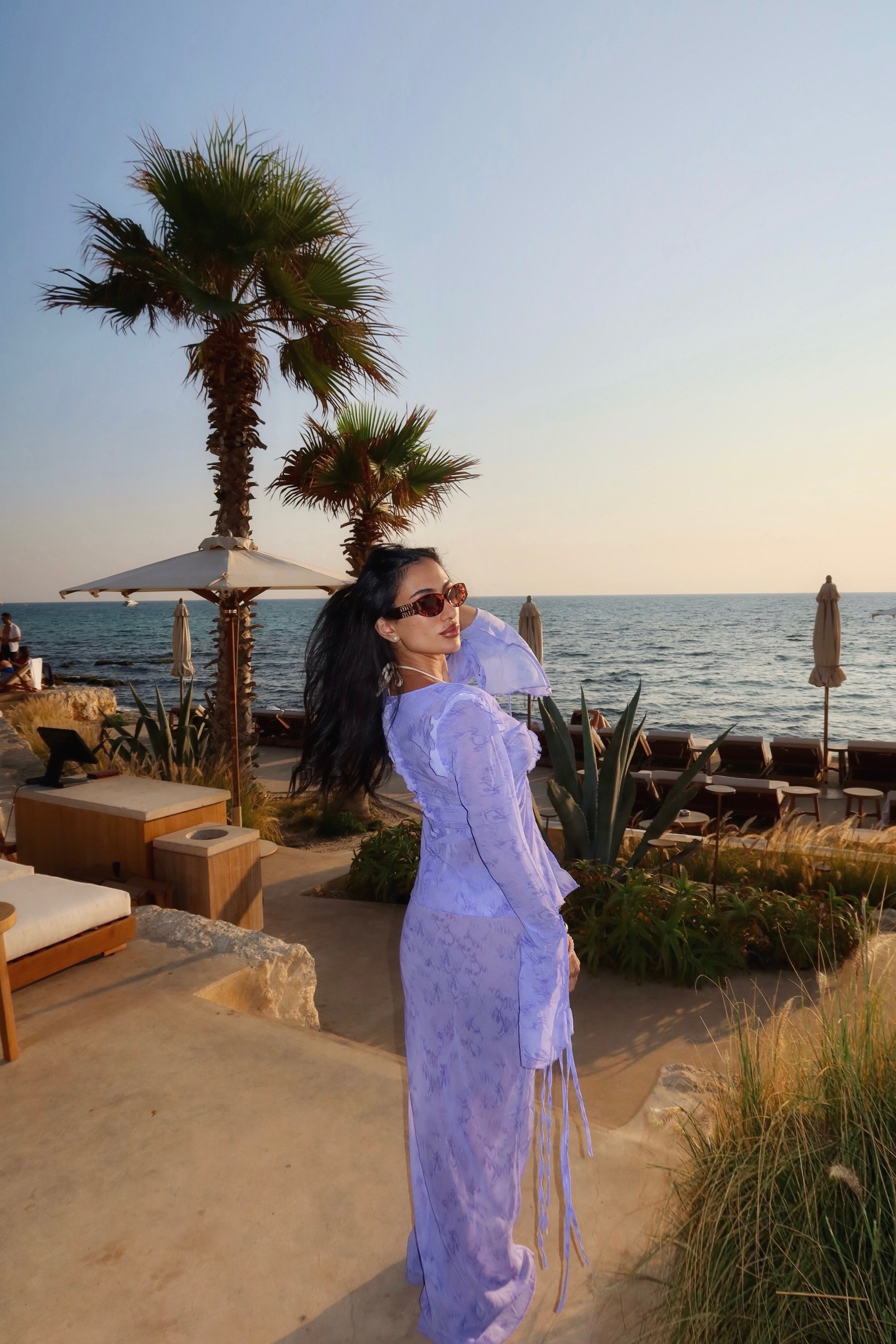 Featuring a captivating see-through long skirt paired with a coordinating top.
