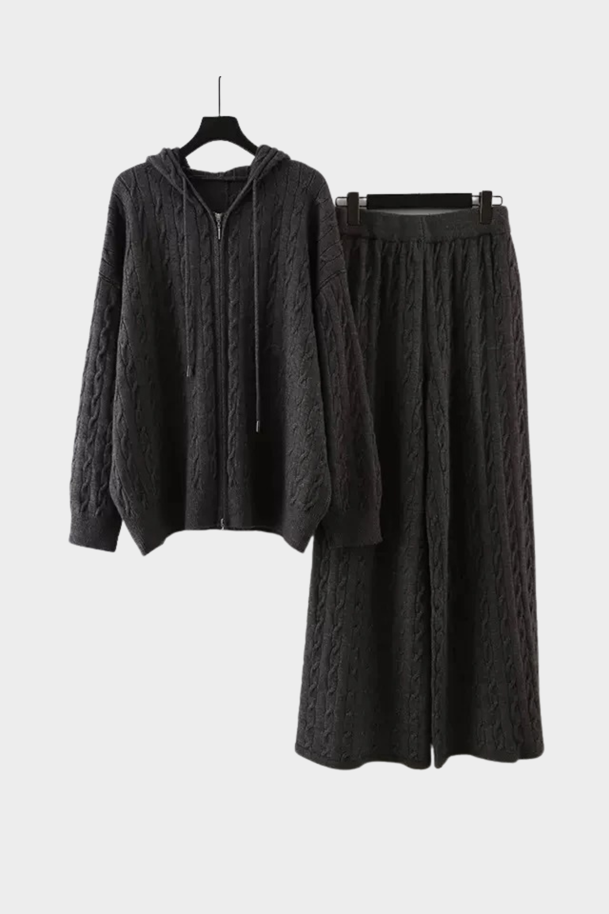 Upgrade your everyday comfort with this ultra-soft cable-knit two-piece set, designed for warmth, style and effortless wear. The full-zip hoodie paired with relaxed wide-leg pants creates the perfect balance between cozy loungewear and chic casual fashion. Ideal for daily wear, travel, home, school drop-offs or winter outings.