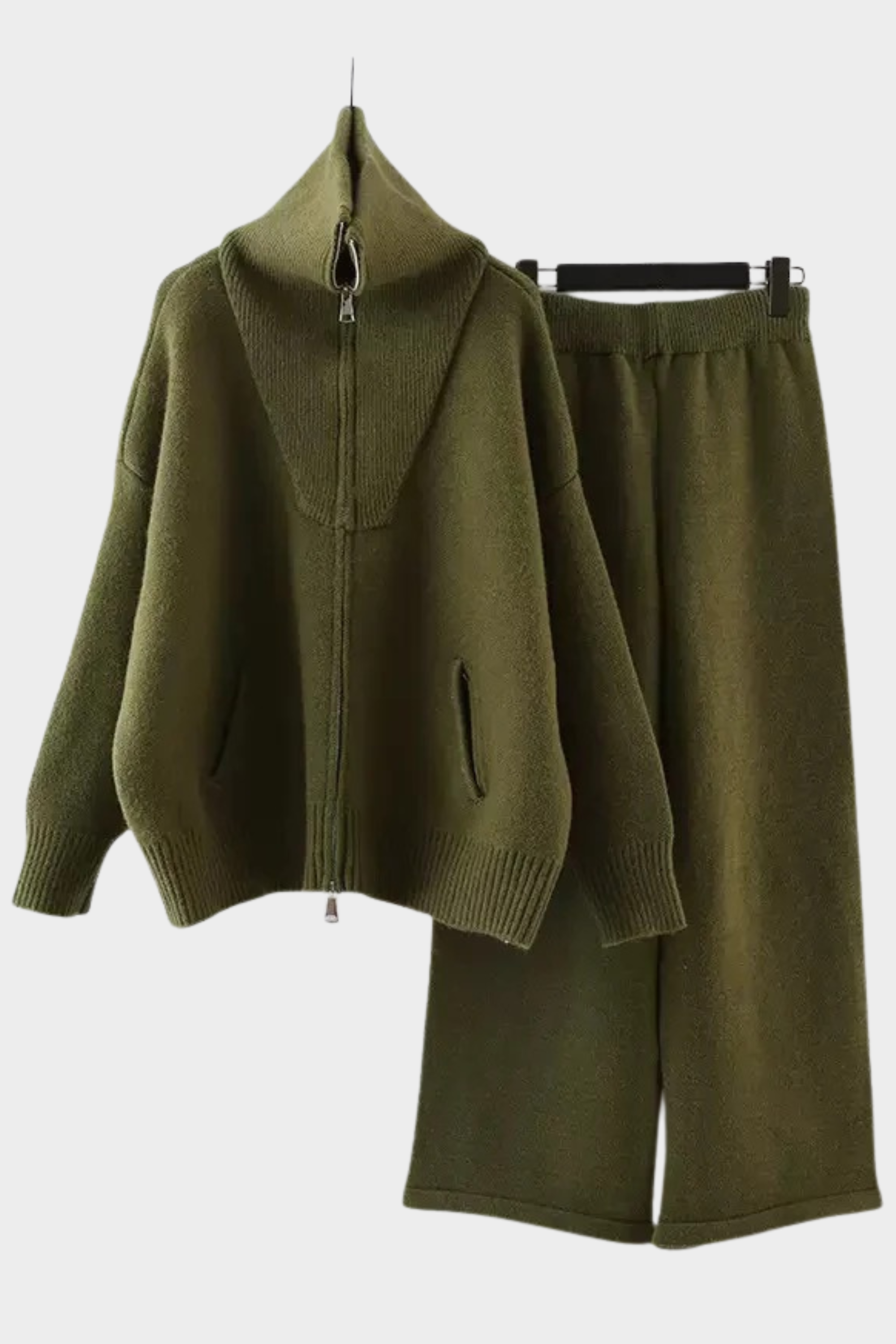 Wrap yourself in warmth and comfort with this ultra-soft high-neck knit set. Designed with a relaxed, oversized fit, the zip-up top keeps you warm while offering effortless style. The matching wide-leg pants feature a stretchy waistband for all-day comfort and easy movement.