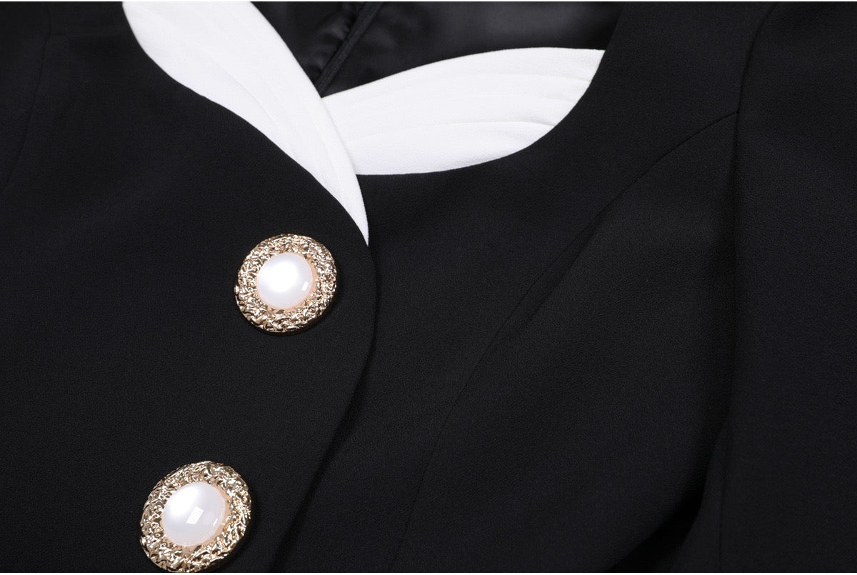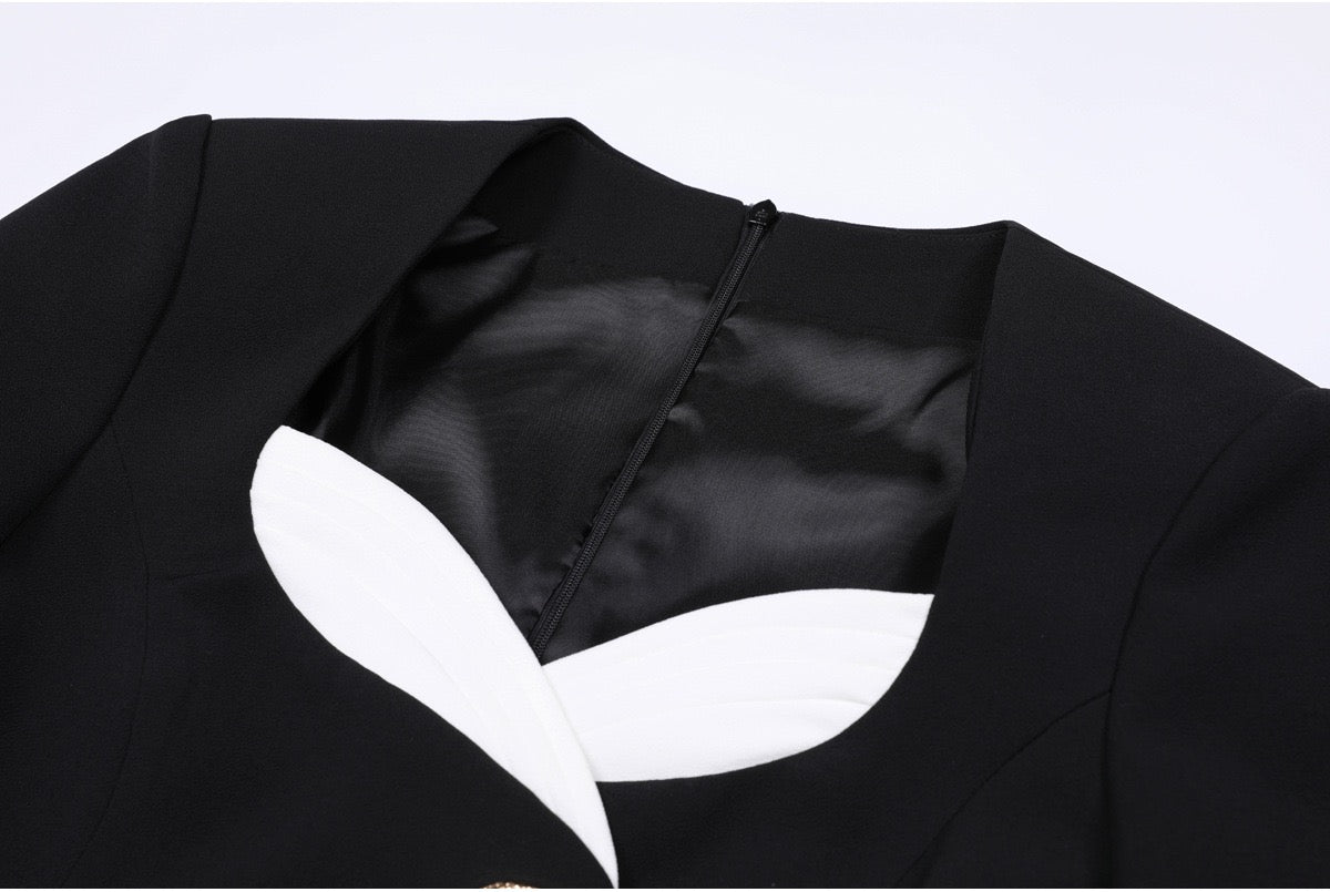 The sculpted neckline adds a modern touch, complemented by long fitted sleeves that balance the silhouette beautifully. Decorative button detailing at the front enhances the refined design, while the concealed back zipper ensures a seamless finish and easy wear.