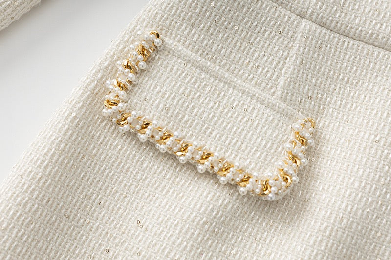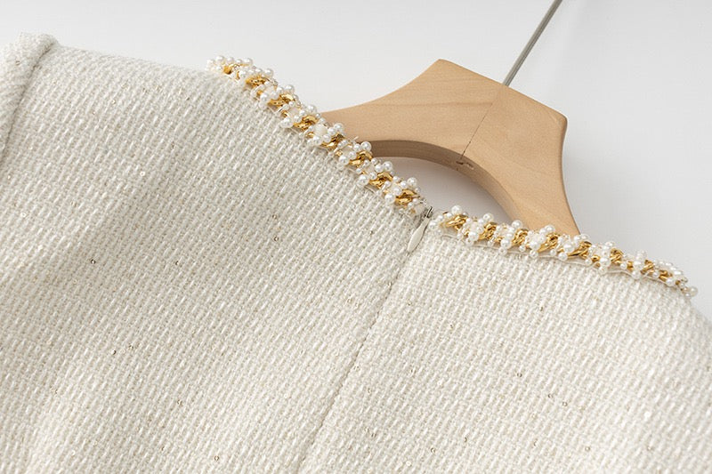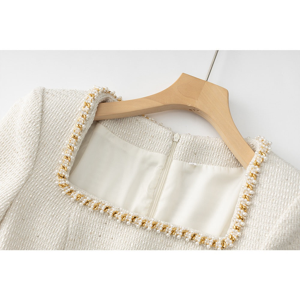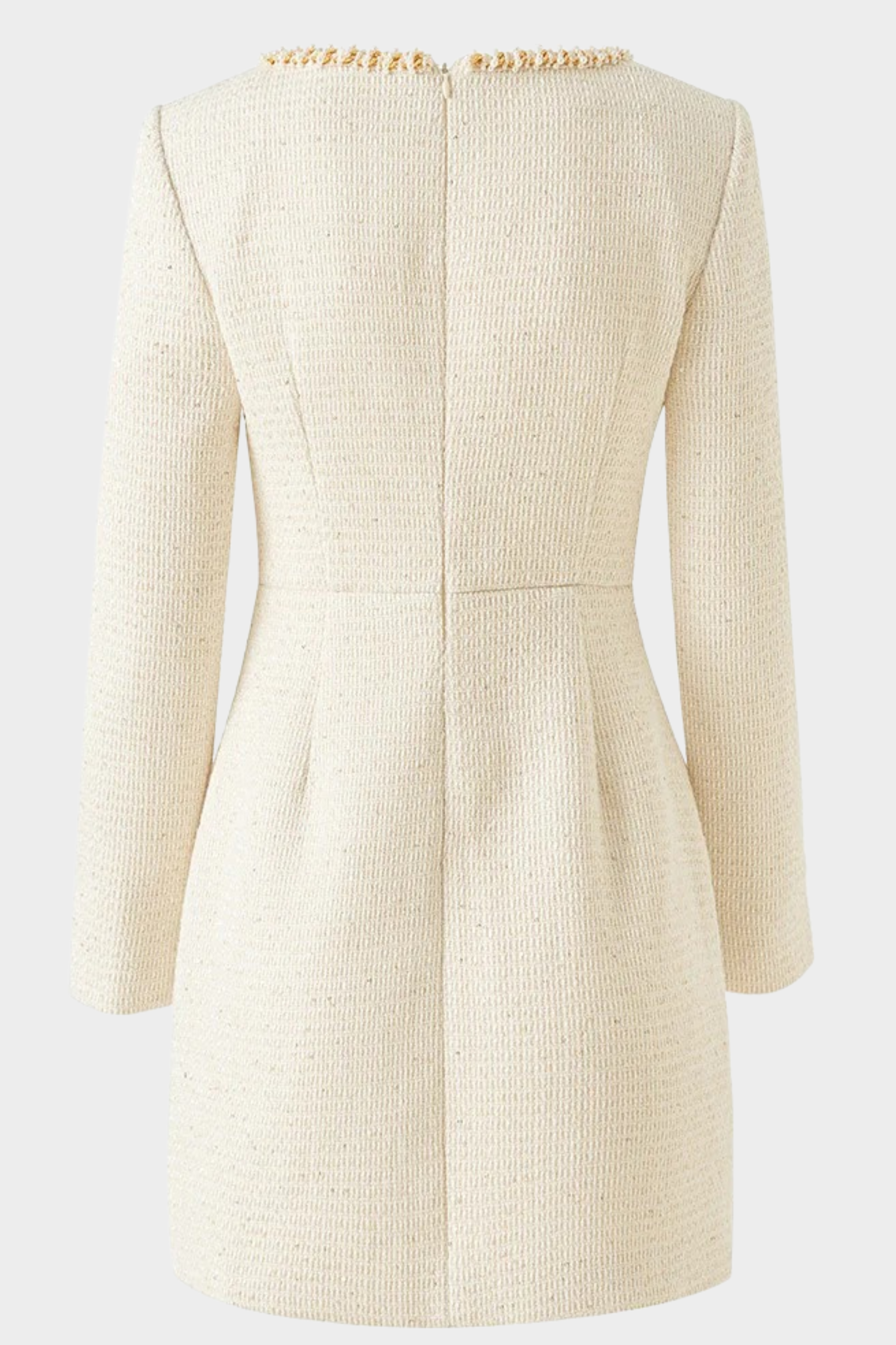 A refined take on classic tailoring, this long sleeve tweed dress is designed with a clean square neckline and a softly structured silhouette. The textured tweed fabric brings depth and elegance, while delicate pearl trim accents along the neckline and pockets add a subtle statement. Finished with a short length that feels modern and polished, this piece transitions effortlessly from daytime events to evening occasions.
