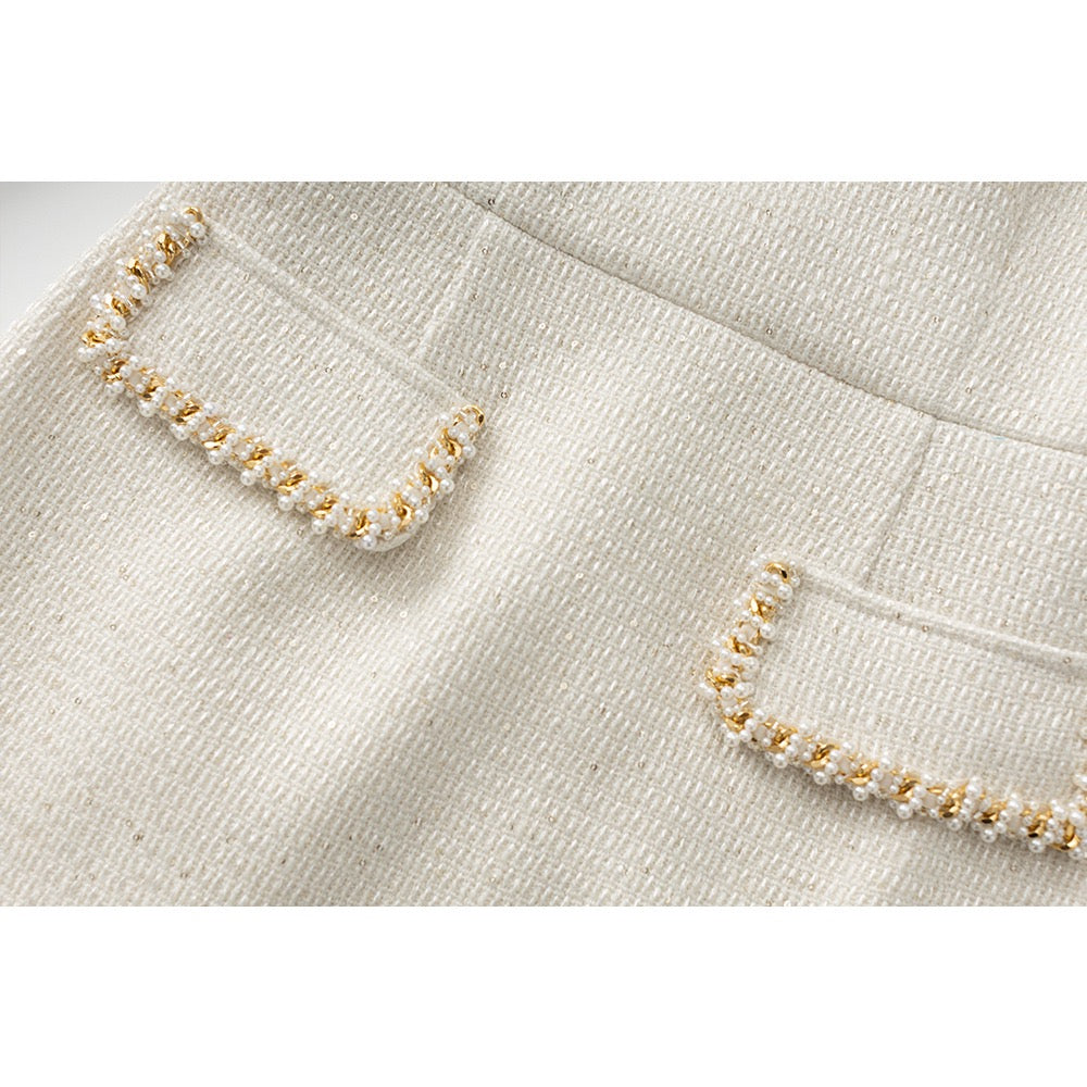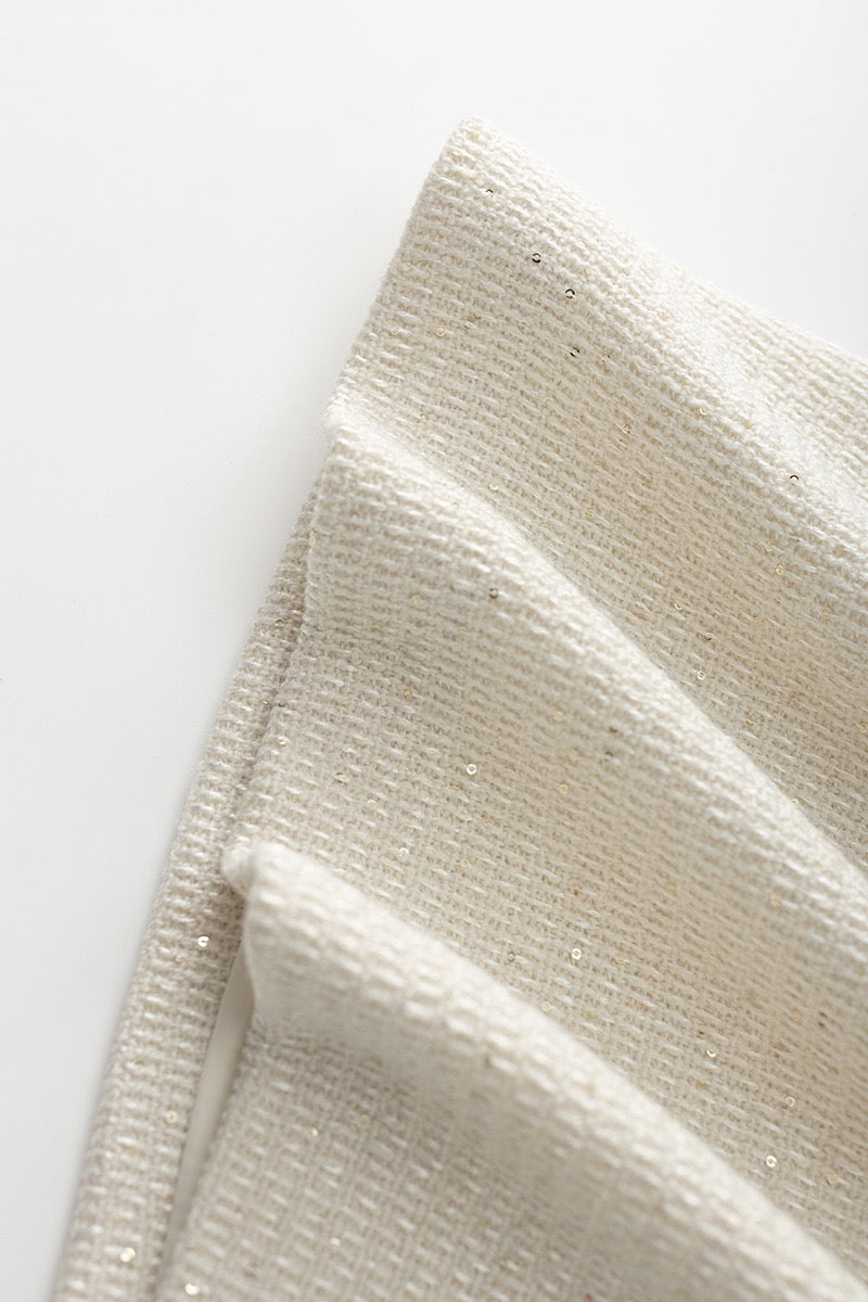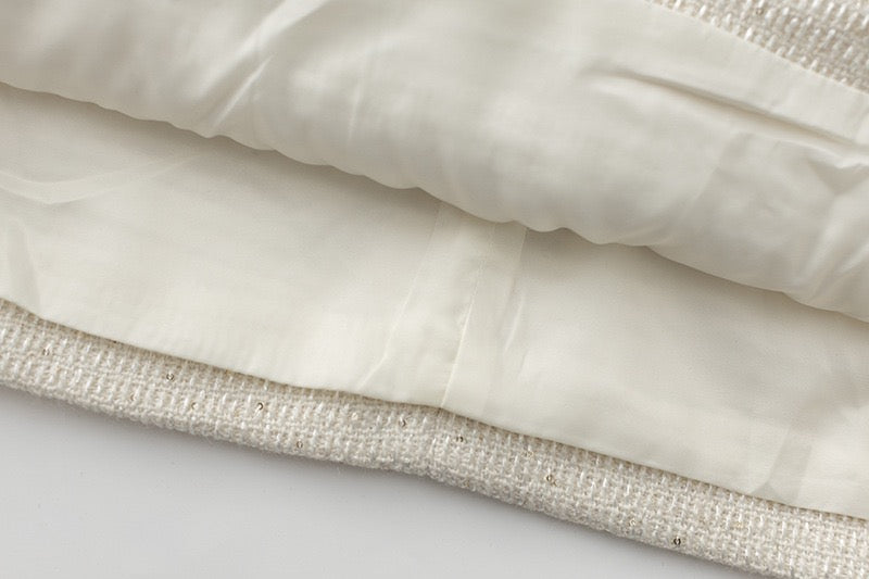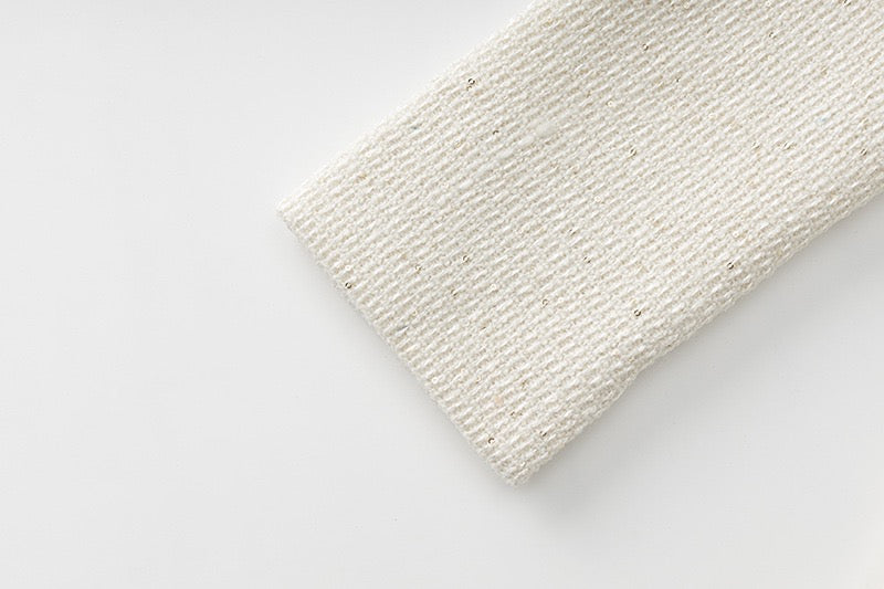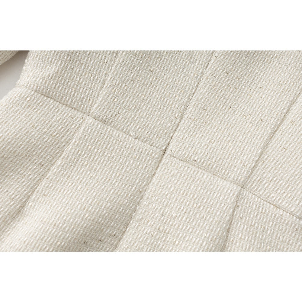 A refined take on classic tailoring, this long sleeve tweed dress is designed with a clean square neckline and a softly structured silhouette. The textured tweed fabric brings depth and elegance, while delicate pearl trim accents along the neckline and pockets add a subtle statement. Finished with a short length that feels modern and polished, this piece transitions effortlessly from daytime events to evening occasions.