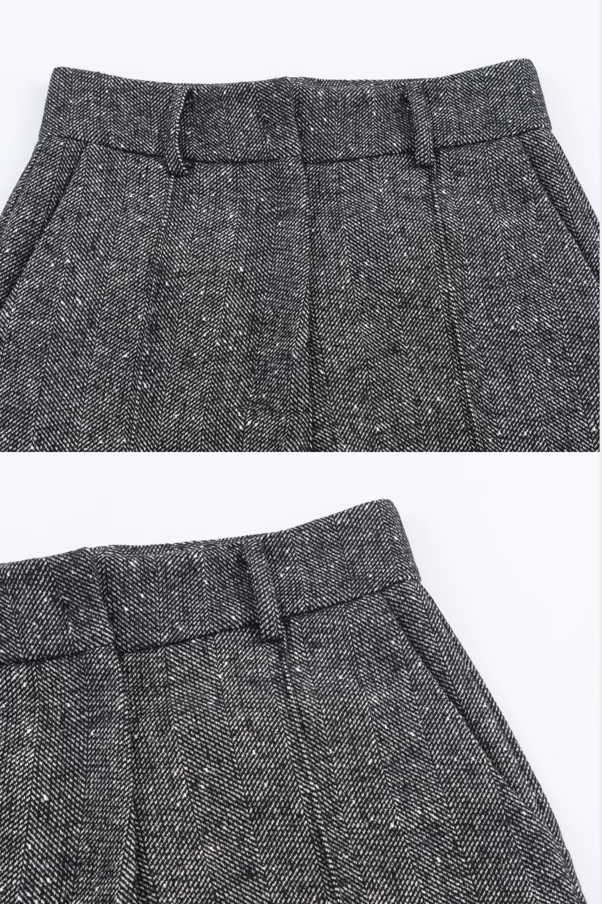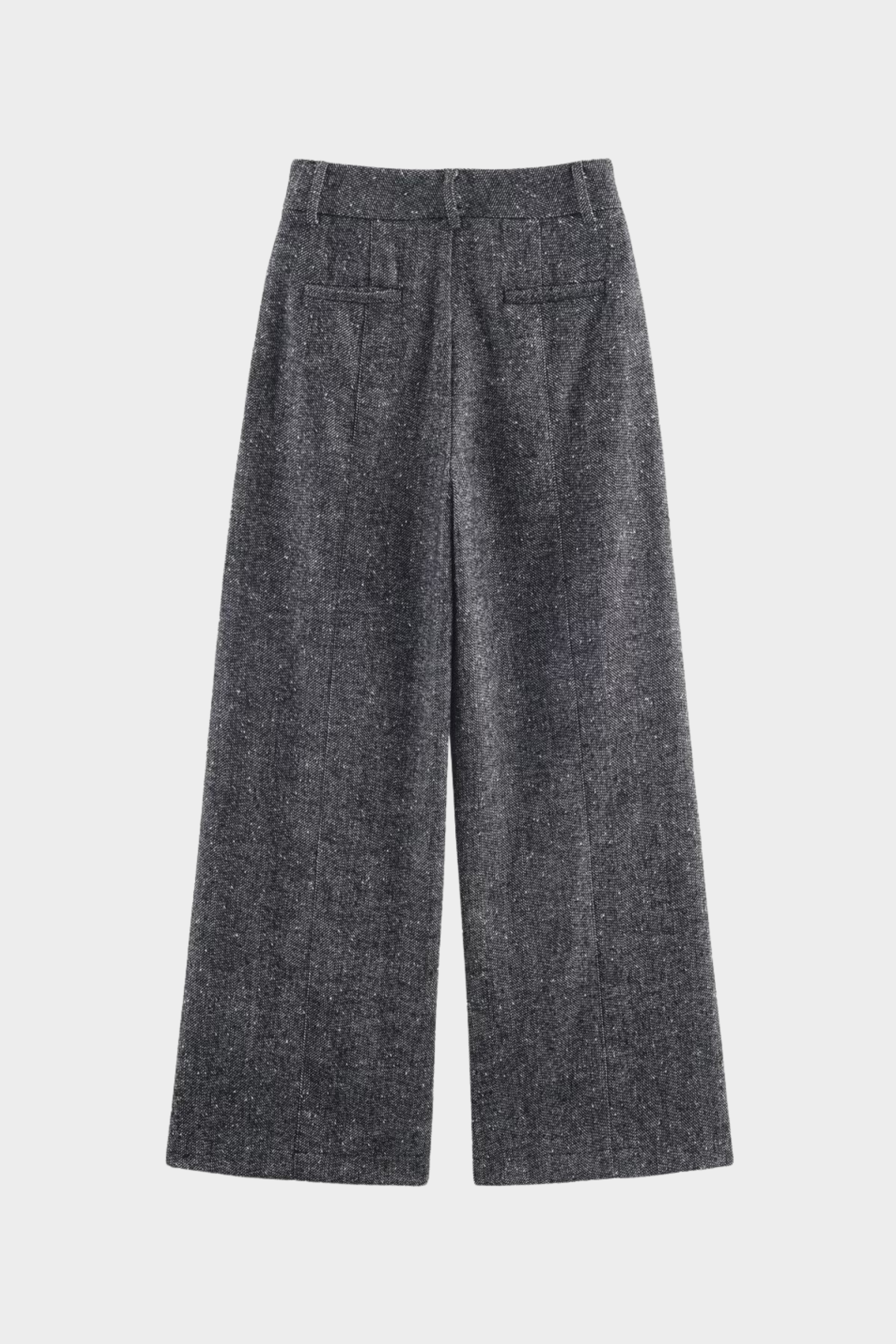 Elegant wide-leg trousers crafted from soft tweed with sharp front pleats and a clean tailored finish. Designed with side pockets and belt loops, they offer an effortlessly sleek and elongated silhouette for everyday chic styling.