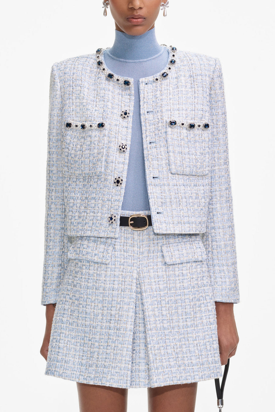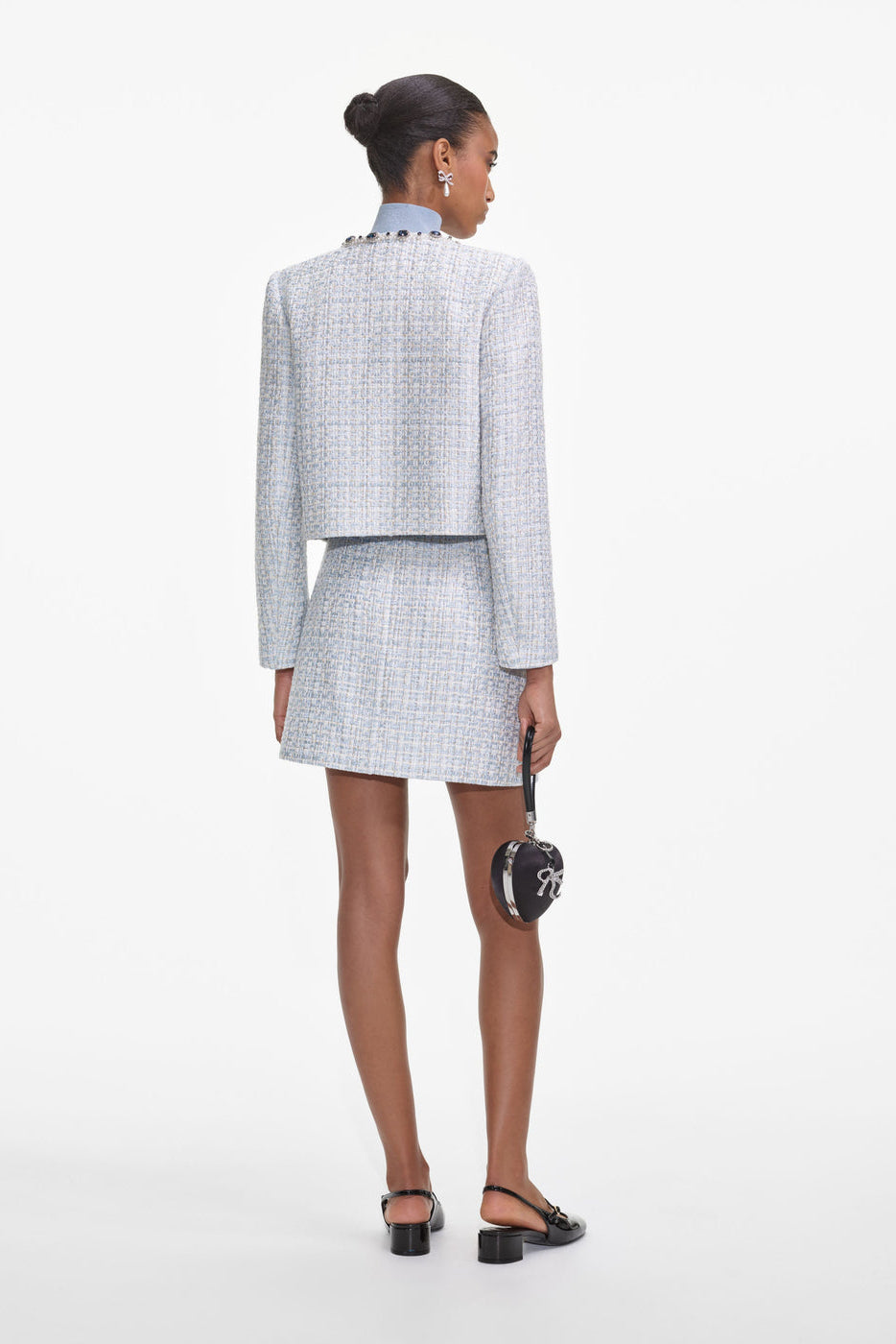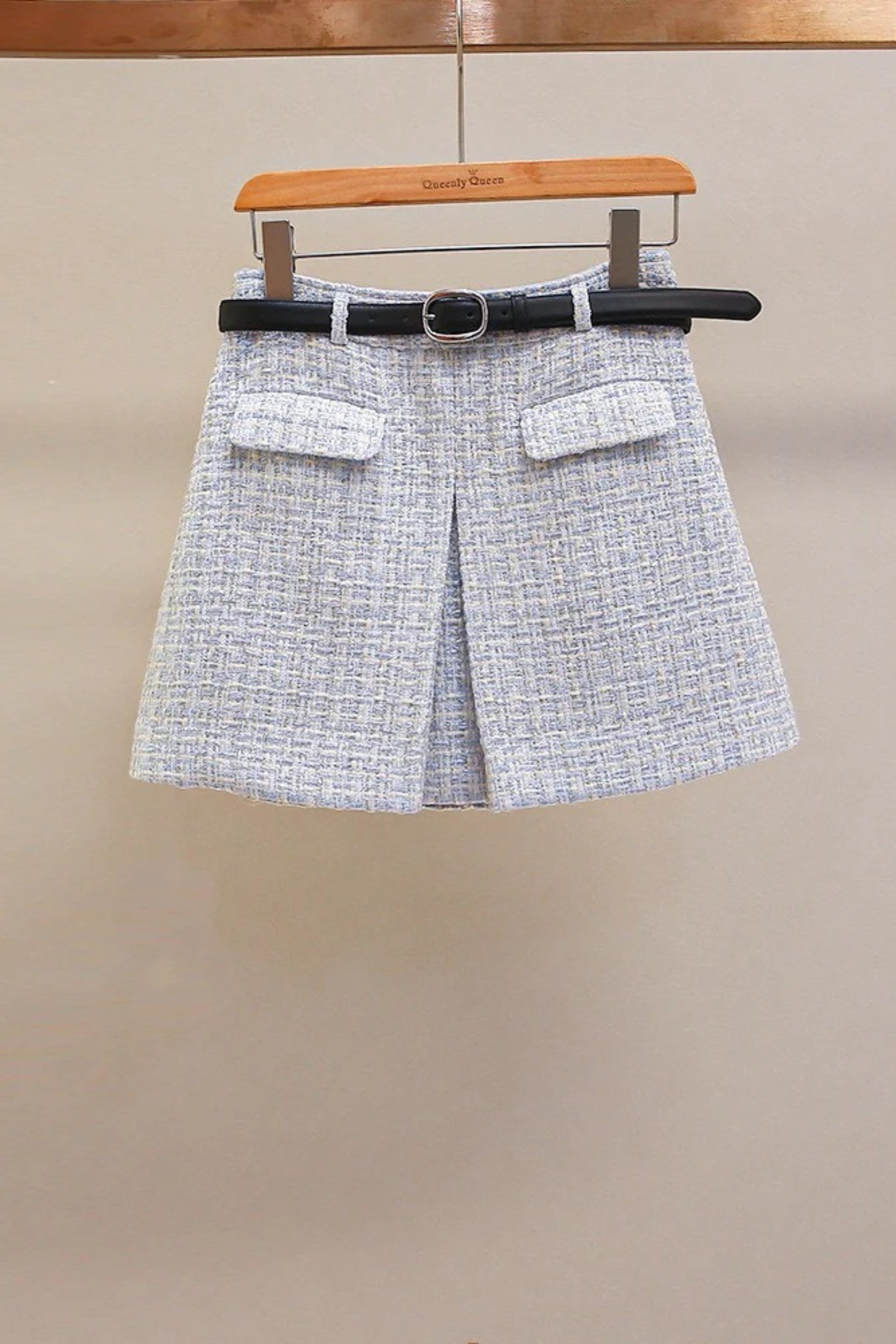 A chic tweed mini skirt designed in a flattering A-line silhouette, featuring front flap details, a soft structured texture, and a sleek black belt that elevates the whole look. Fully lined for comfort and perfect for pairing with its matching blazer or your favorite basics, this piece brings polished elegance to any outfit.