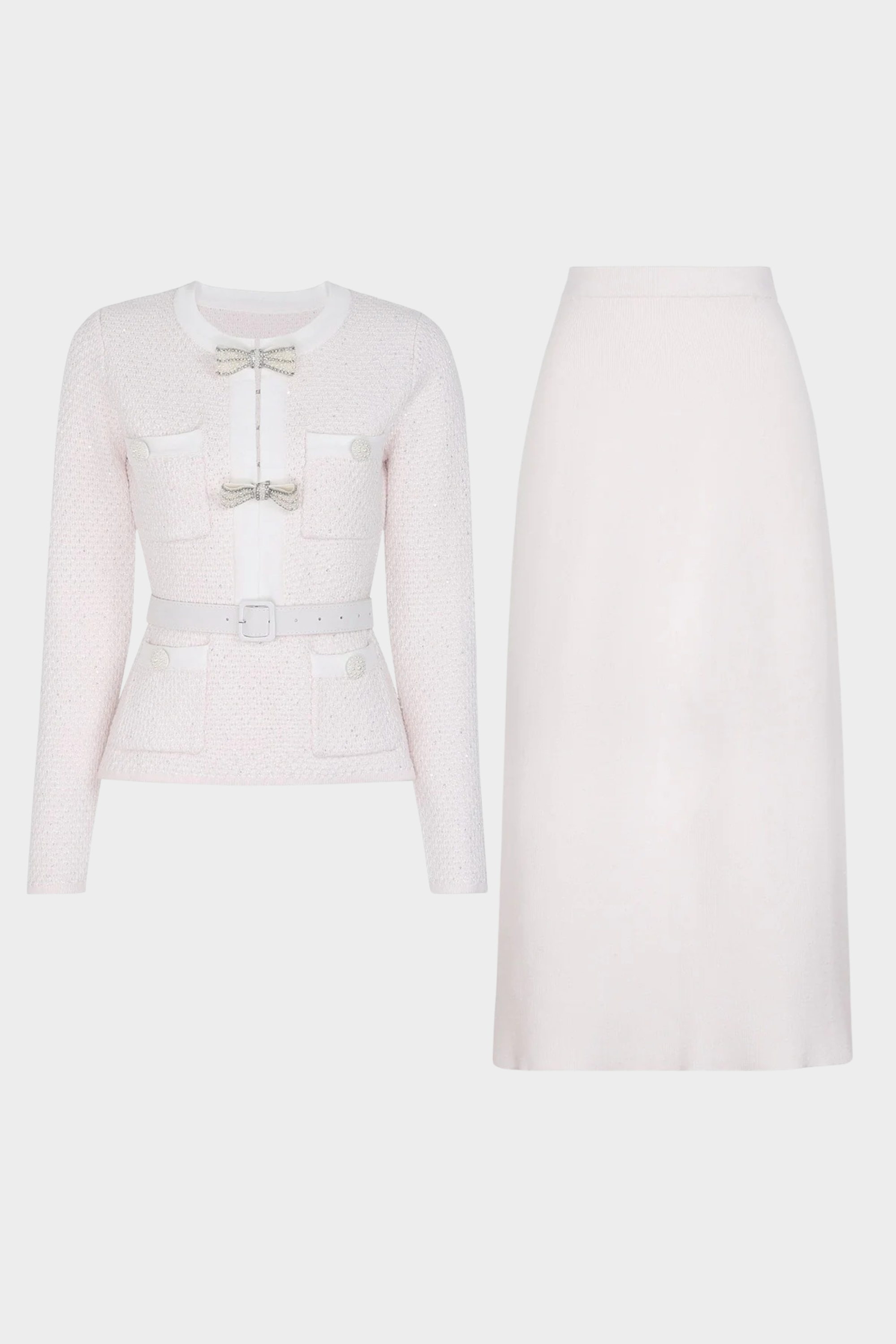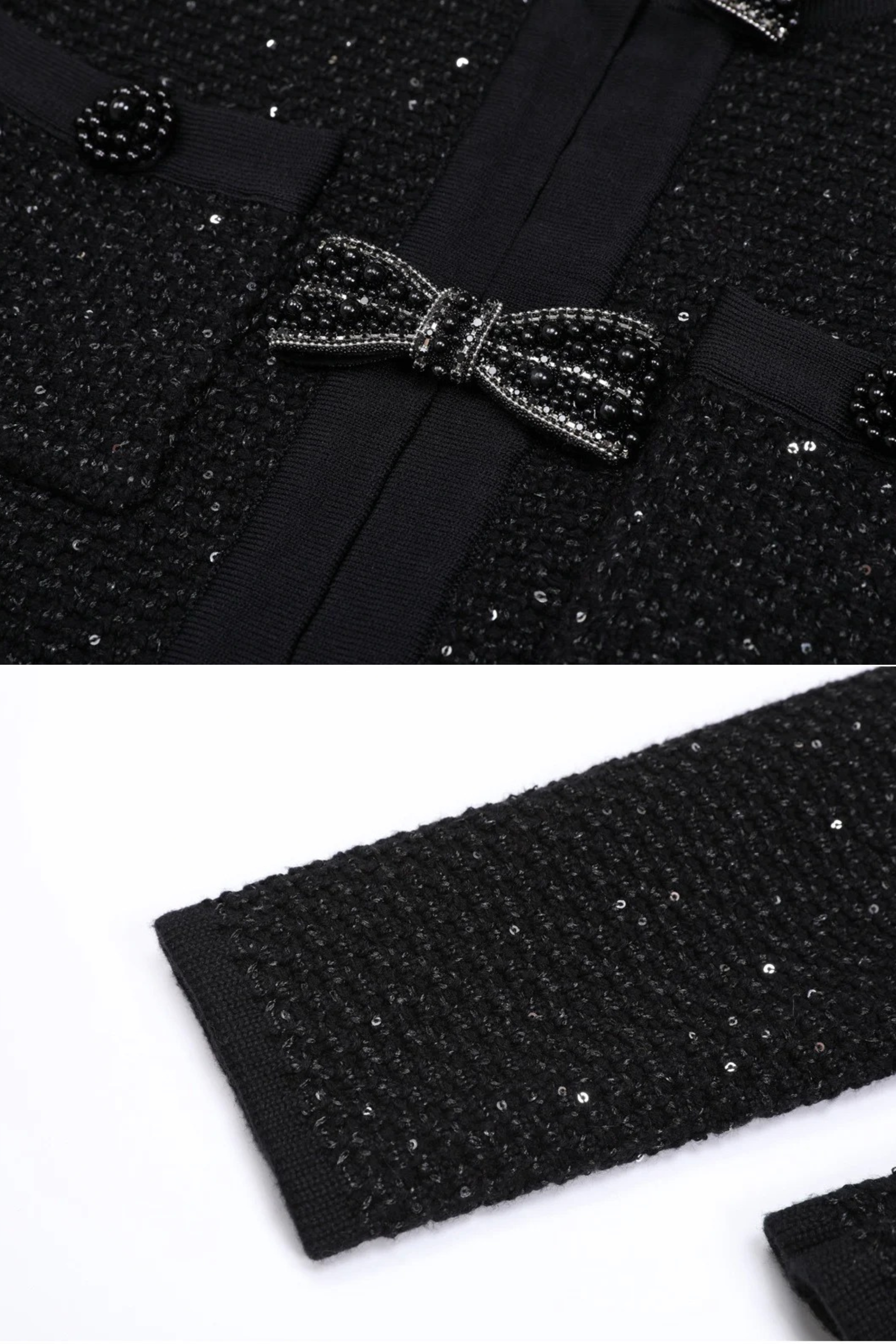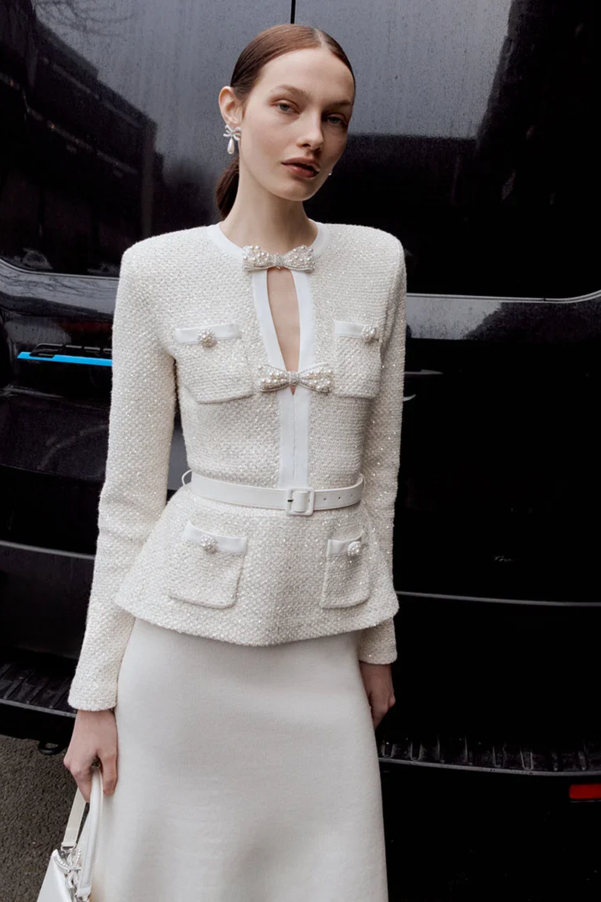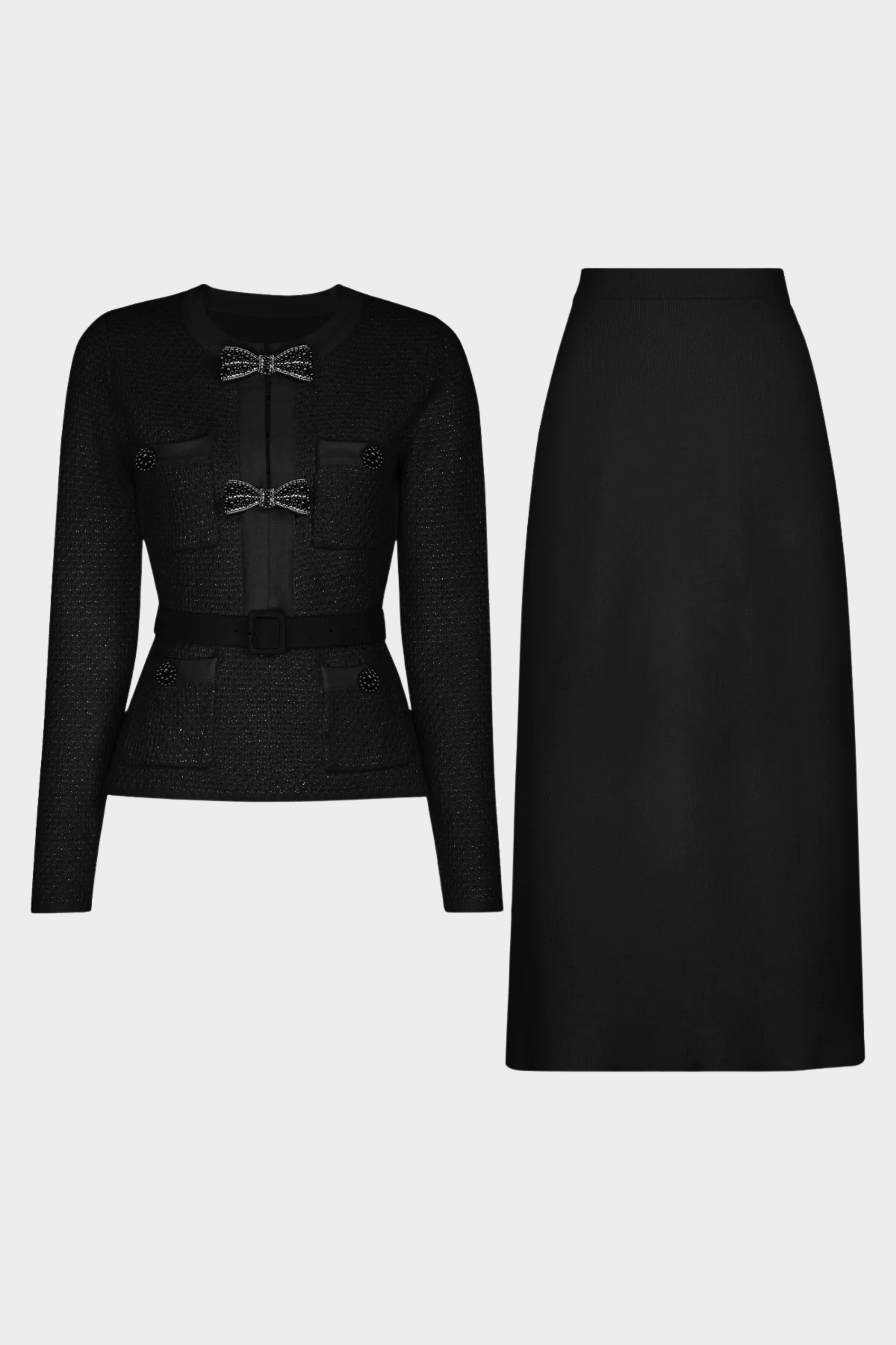 Elevate your wardrobe with this elegant two-piece set, featuring a beautifully embellished tweed top paired with a sleek wool long skirt. The top is designed with intricate beaded bow accents, shimmering sequins, and pearl-detailed buttons that add a luxurious, feminine touch. Its structured silhouette and matching belt create a flattering, cinched waist for a refined finish.