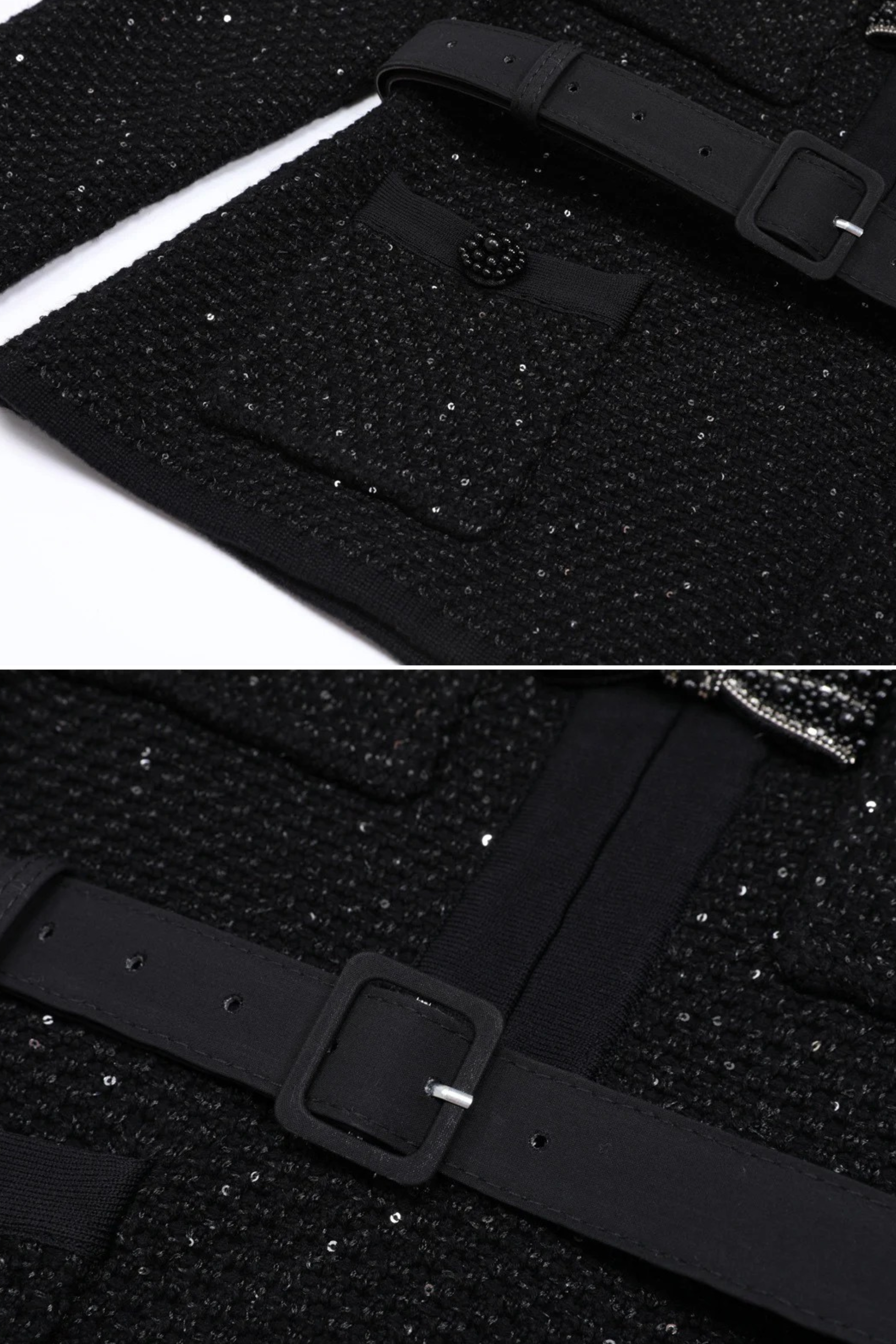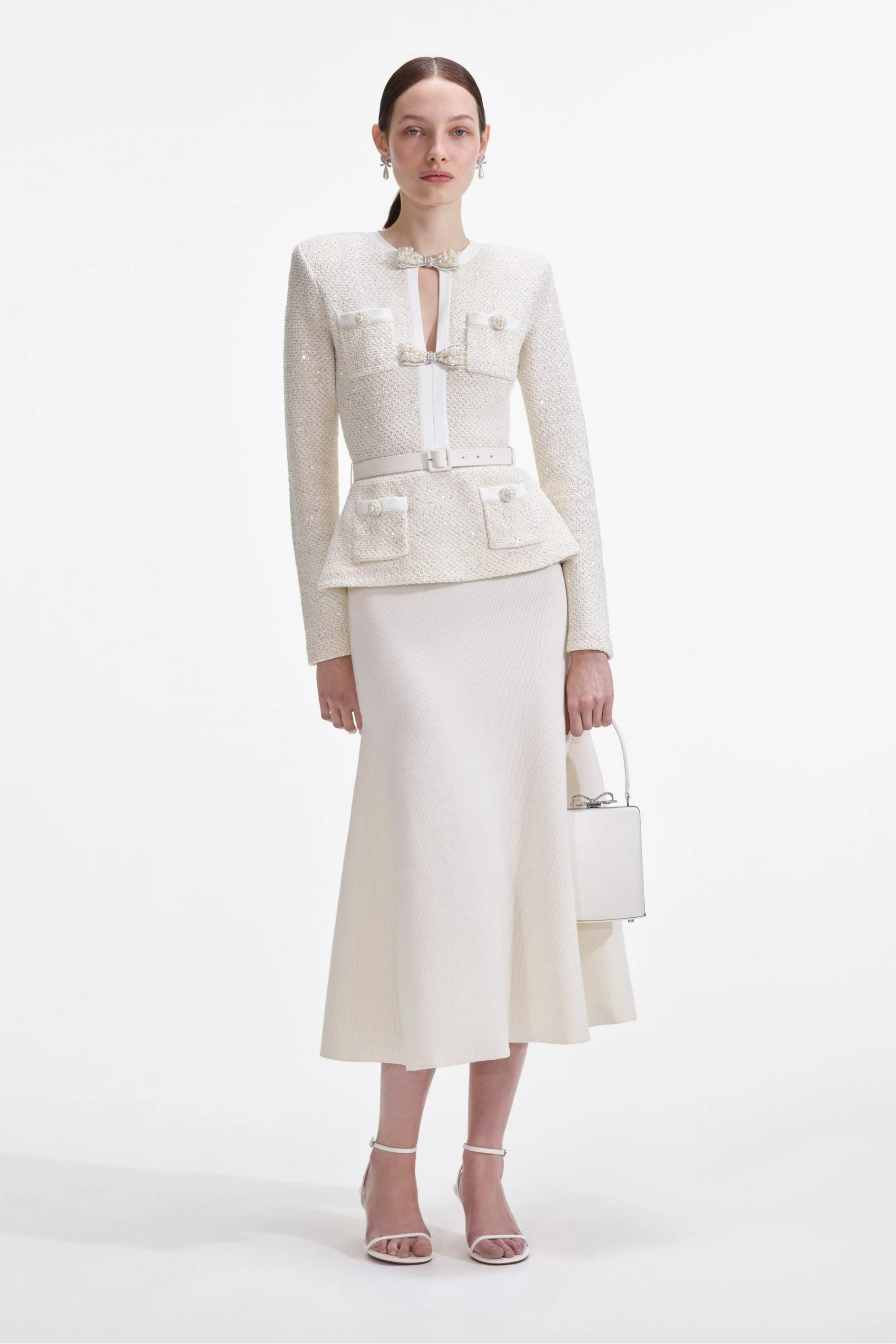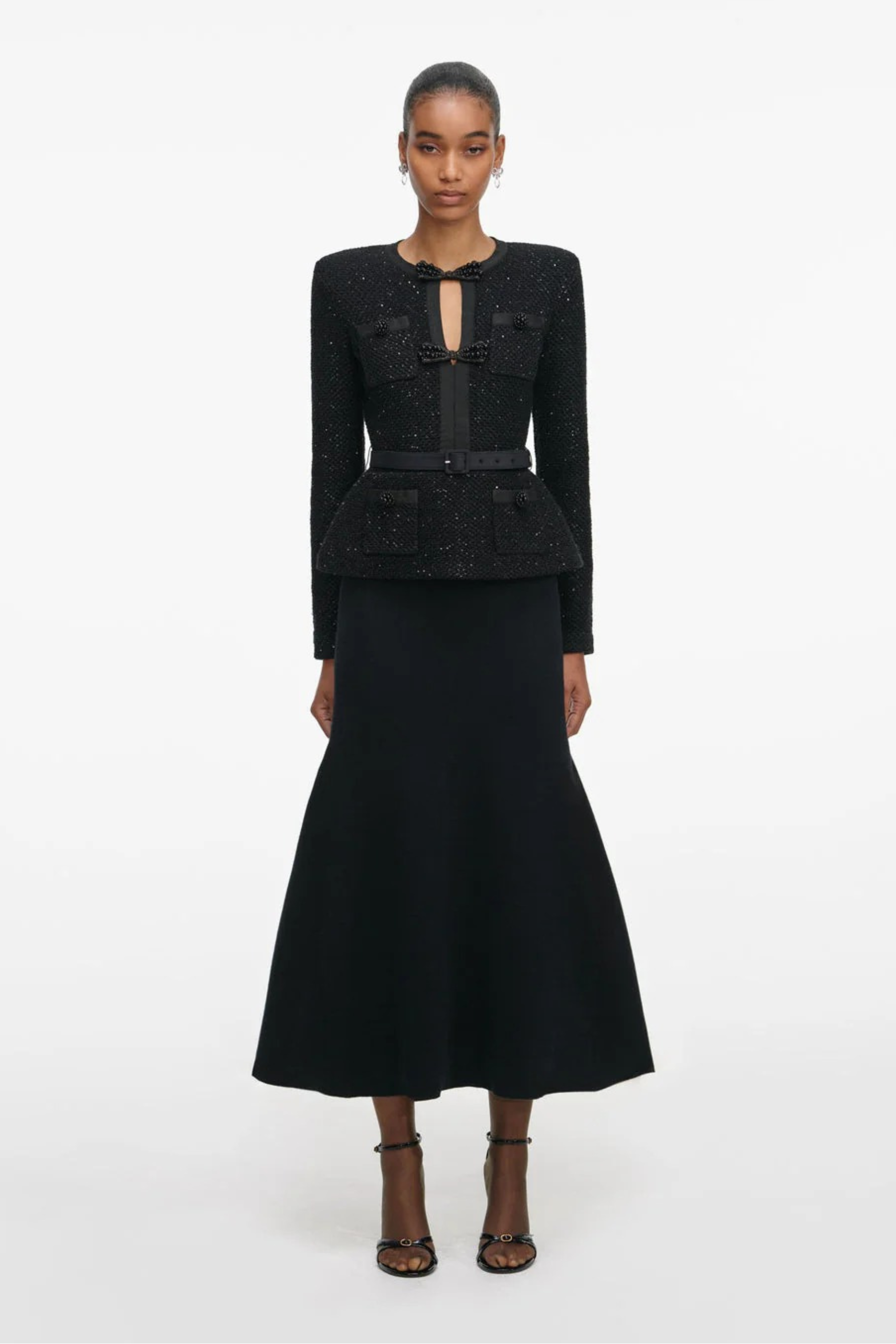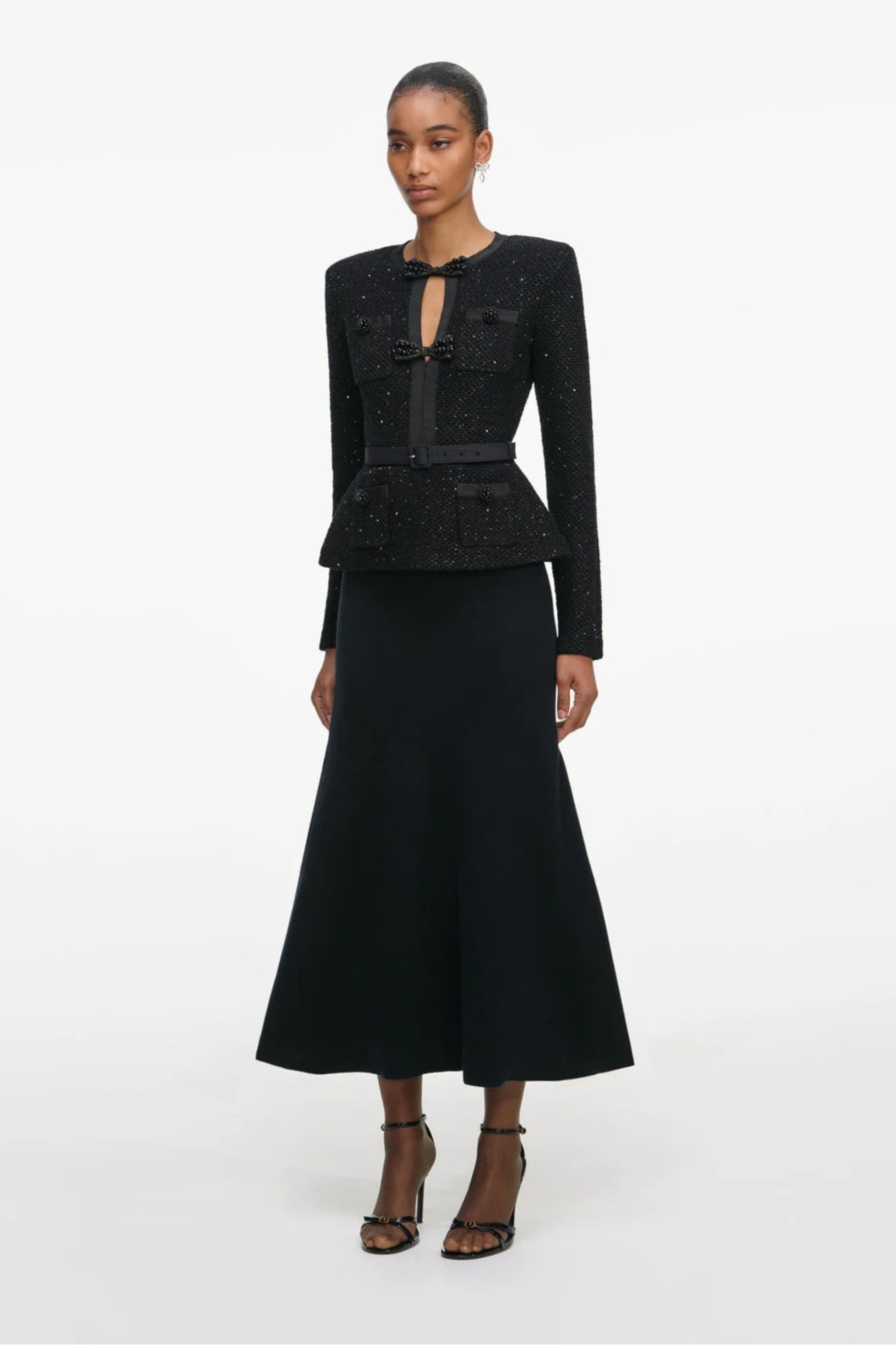 Elevate your wardrobe with this elegant two-piece set, featuring a beautifully embellished tweed top paired with a sleek wool long skirt. The top is designed with intricate beaded bow accents, shimmering sequins, and pearl-detailed buttons that add a luxurious, feminine touch. Its structured silhouette and matching belt create a flattering, cinched waist for a refined finish.
