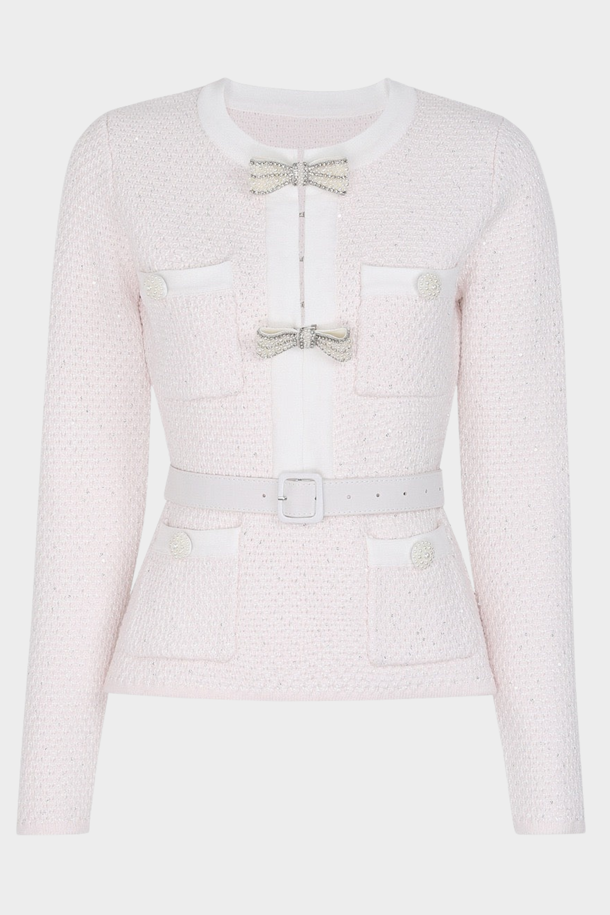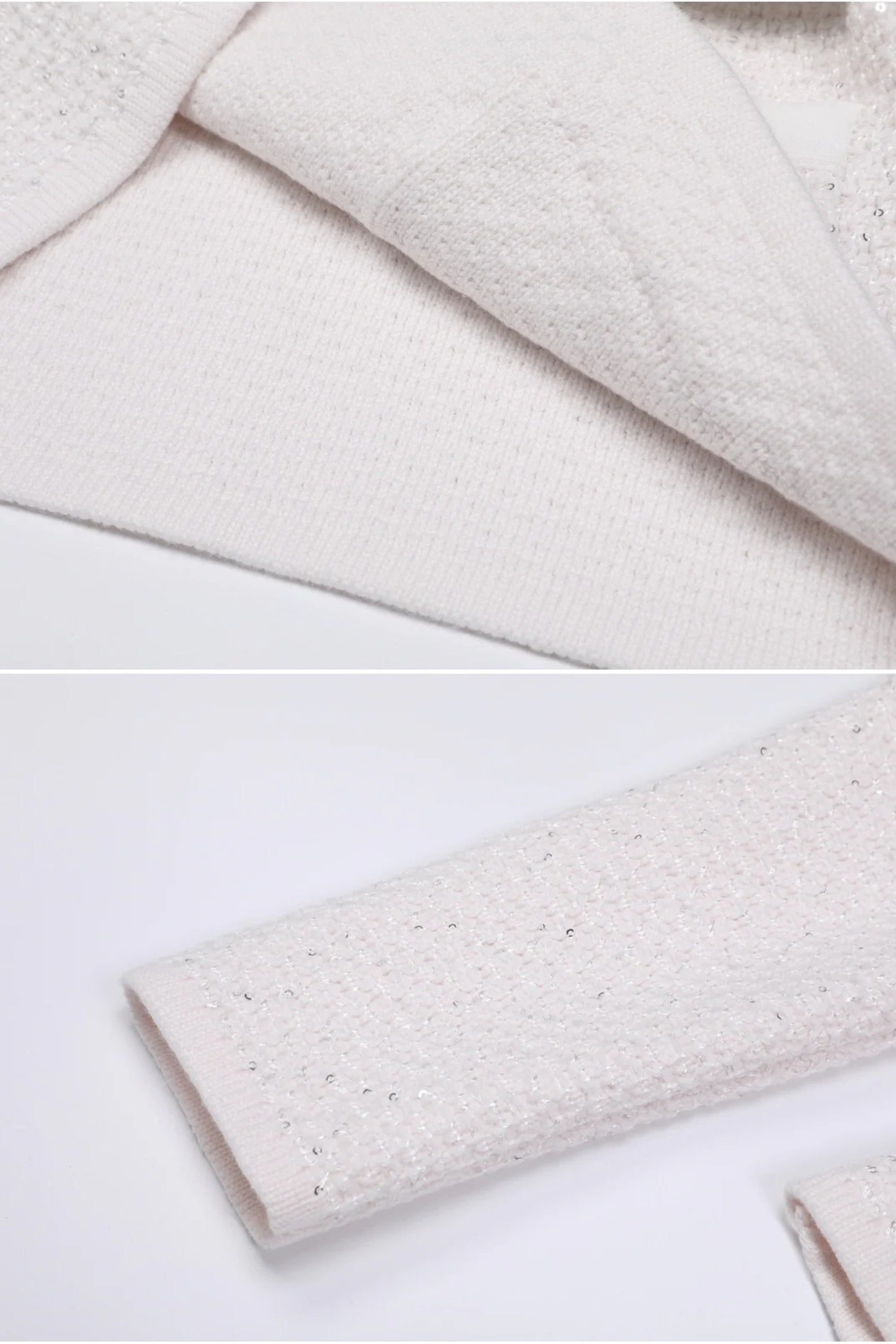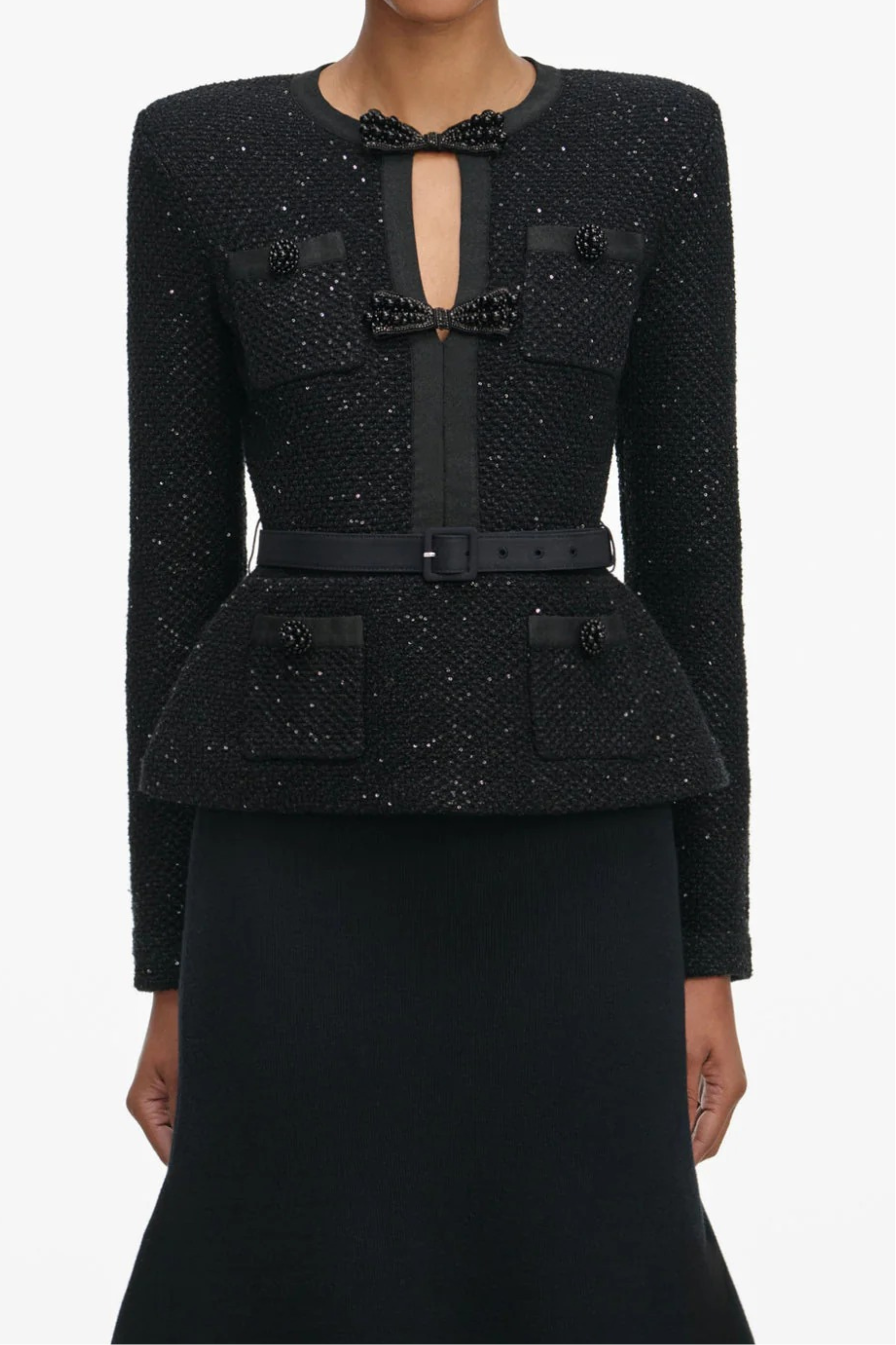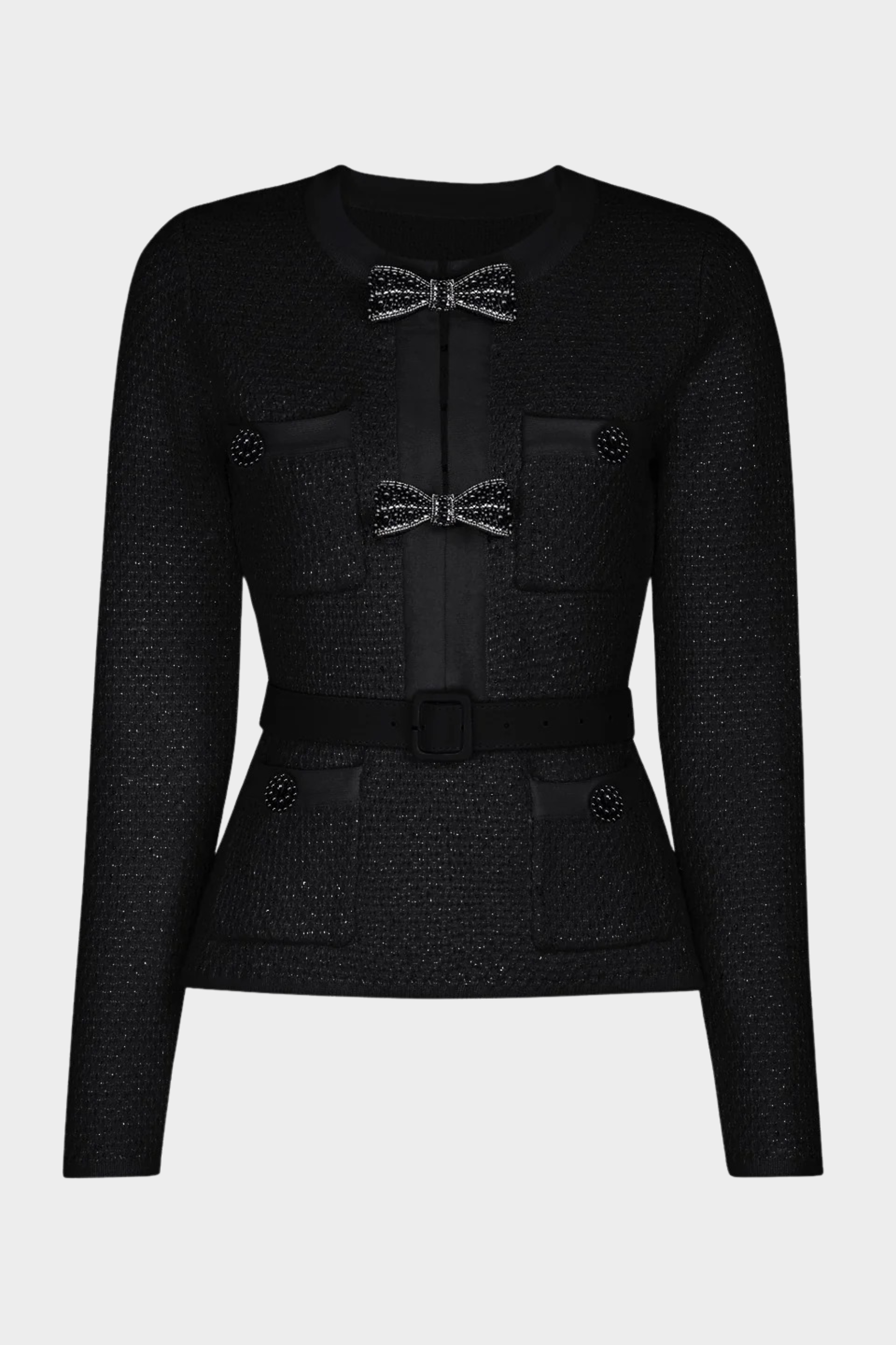 Elevate your wardrobe with this elegant two-piece set, featuring a beautifully embellished tweed top paired with a sleek wool long skirt. The top is designed with intricate beaded bow accents, shimmering sequins, and pearl-detailed buttons that add a luxurious, feminine touch. Its structured silhouette and matching belt create a flattering, cinched waist for a refined finish.