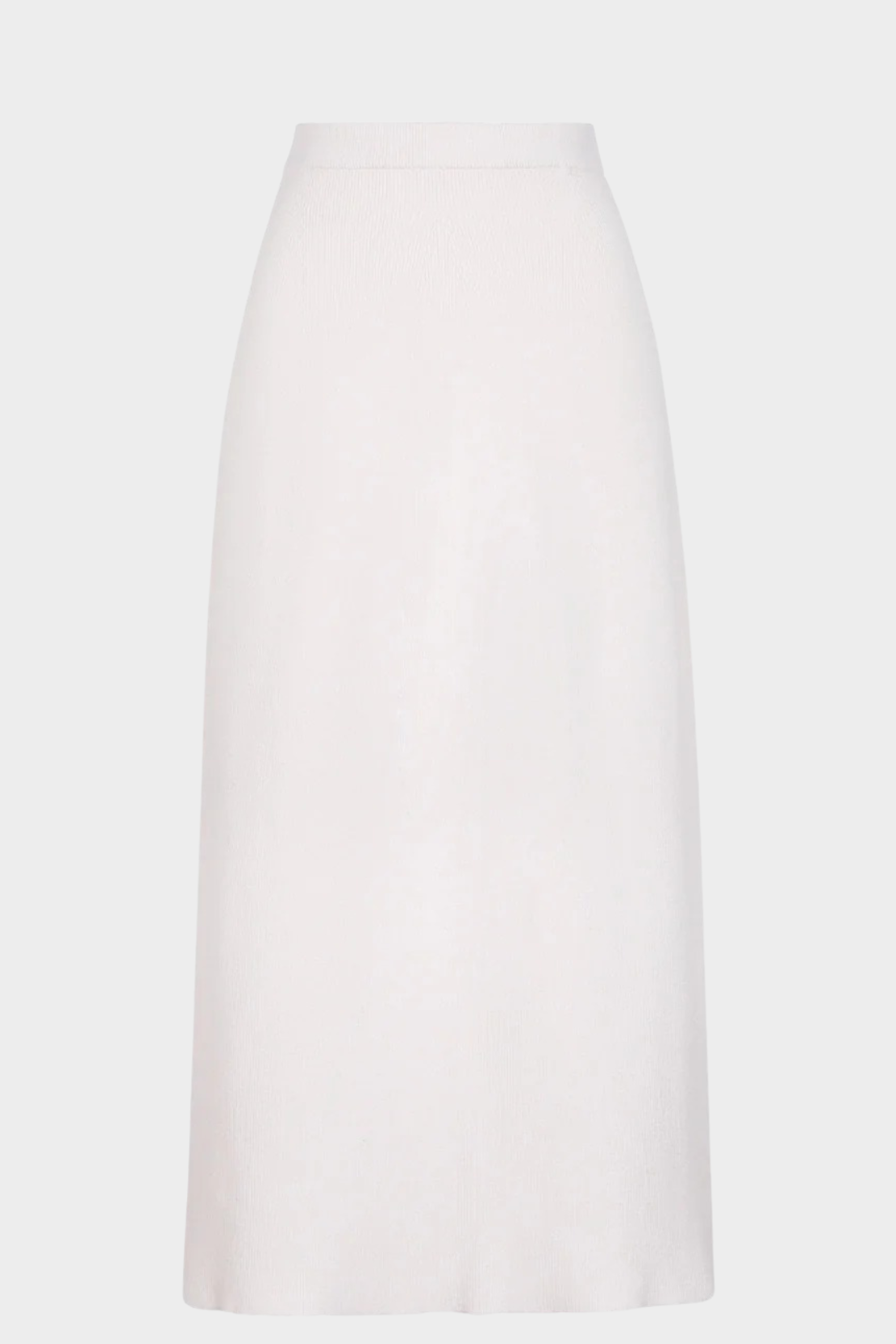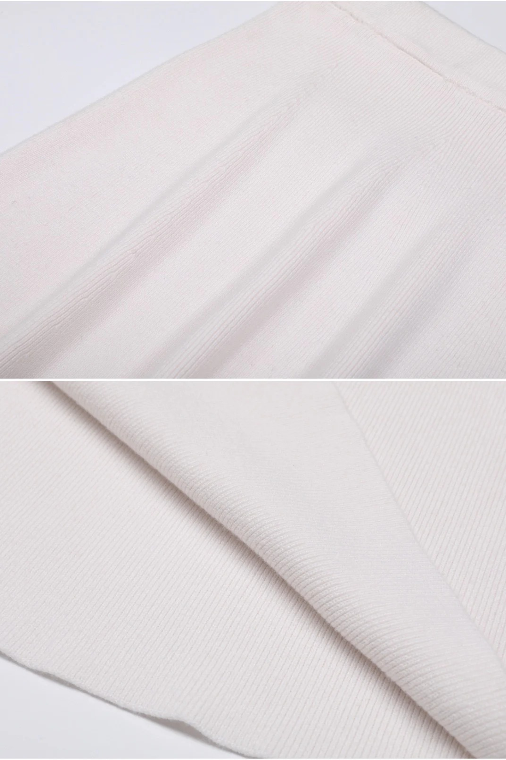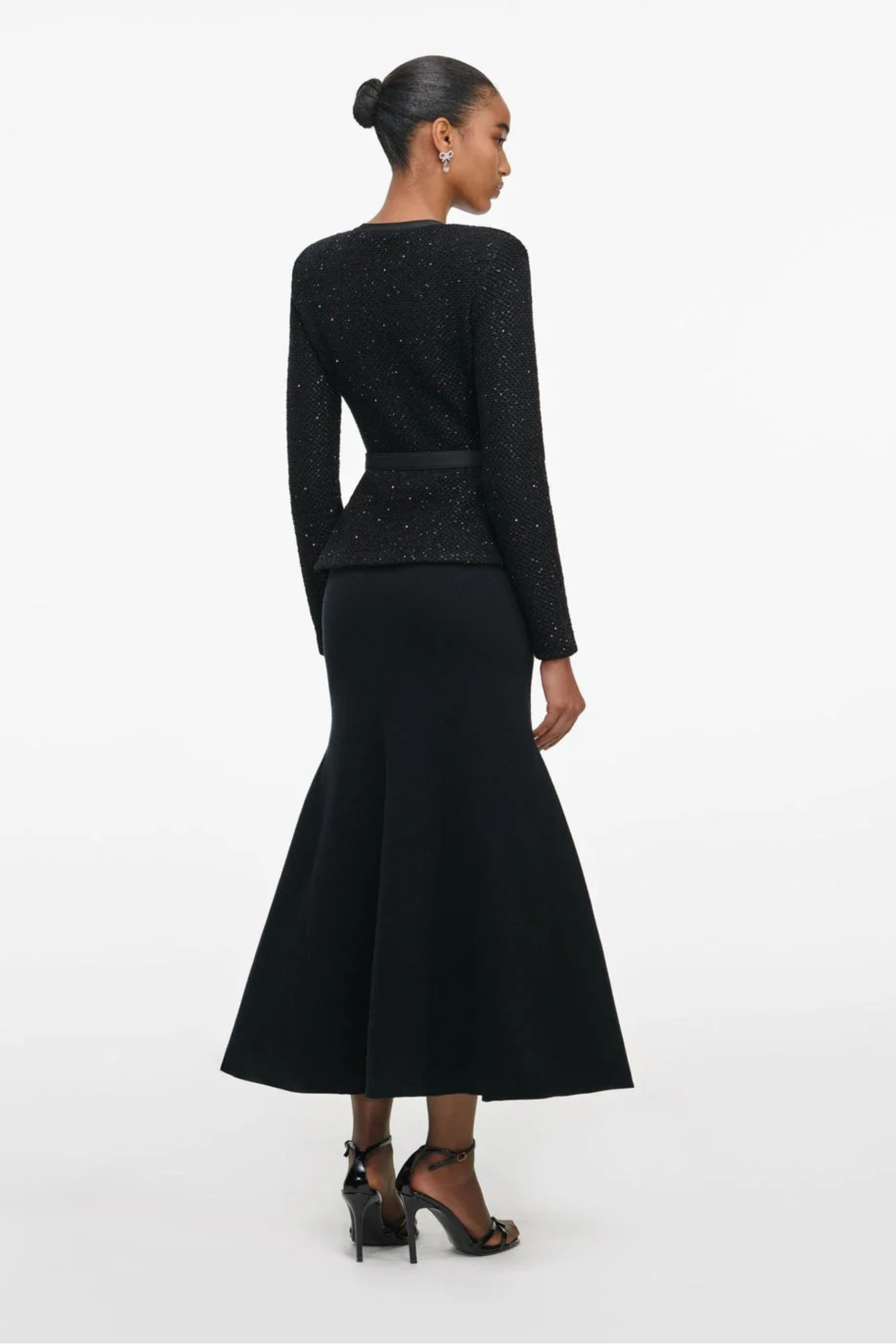 The long skirt is crafted from soft, premium wool-blend knit, offering comfort, warmth, and effortless sophistication. Its smooth, streamlined shape balances the textured tweed top, creating a timeless and chic ensemble suitable for both day and evening occasions.
