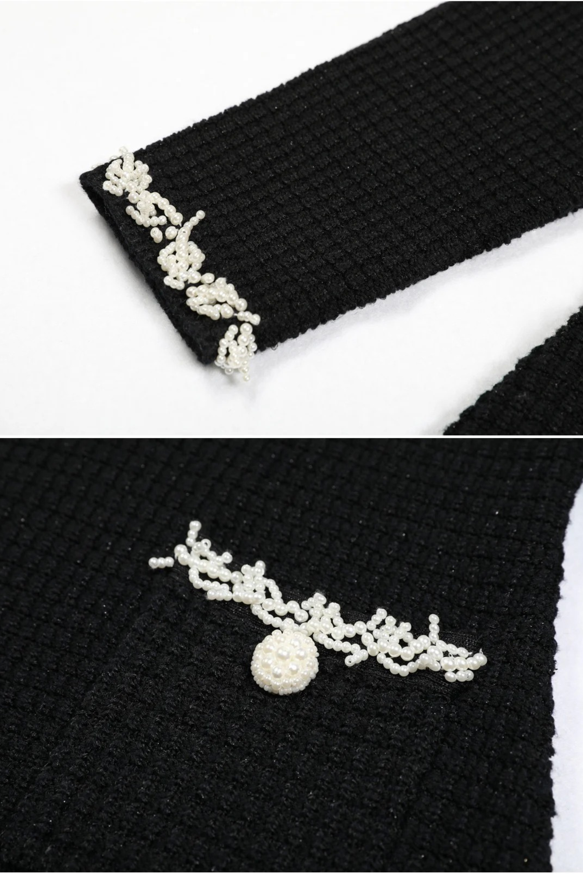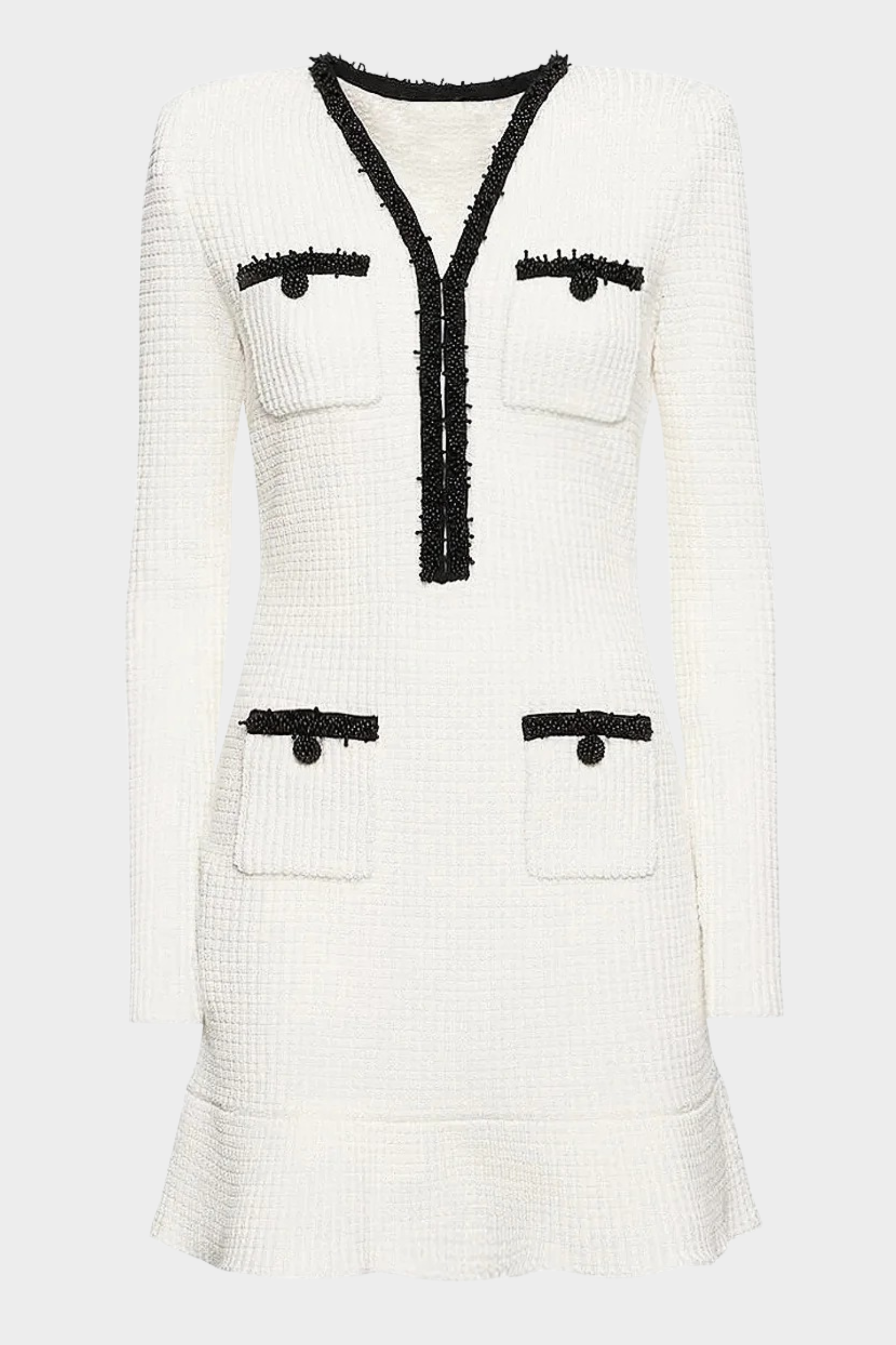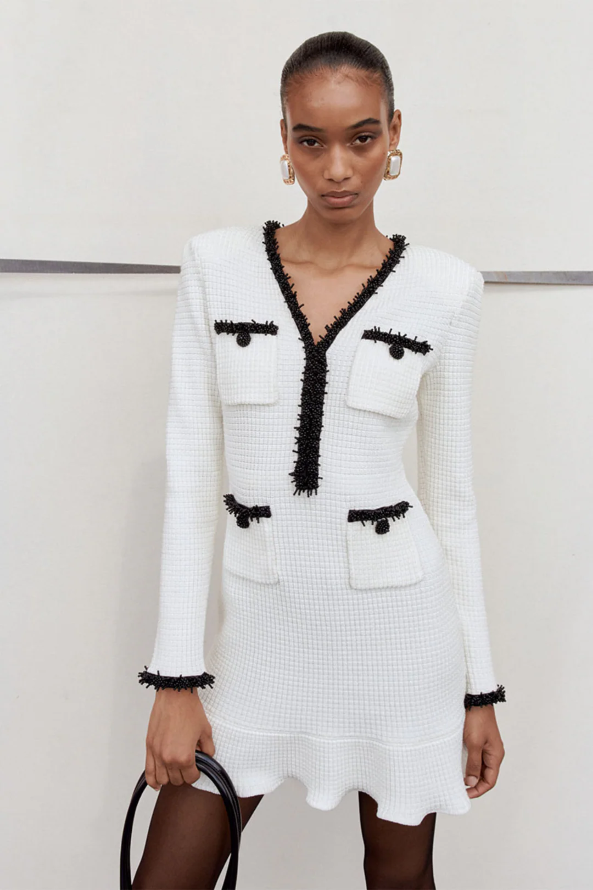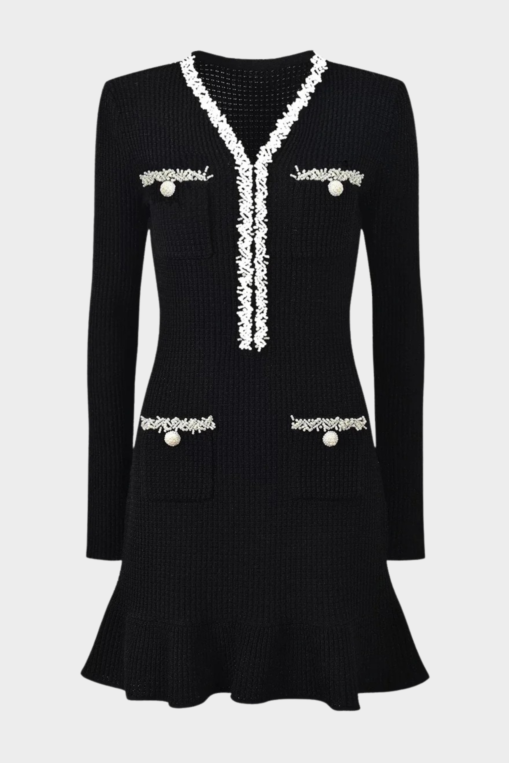 Crafted from a soft textured knit, this long-sleeve beaded dress blends comfort with refined elegance. The structured silhouette highlights the waist, while the gentle flared hem creates a naturally flattering shape suitable for day or evening wear. Hand-applied beaded trim along the neckline and pockets adds a luxurious, detailed finish that sets this design apart.