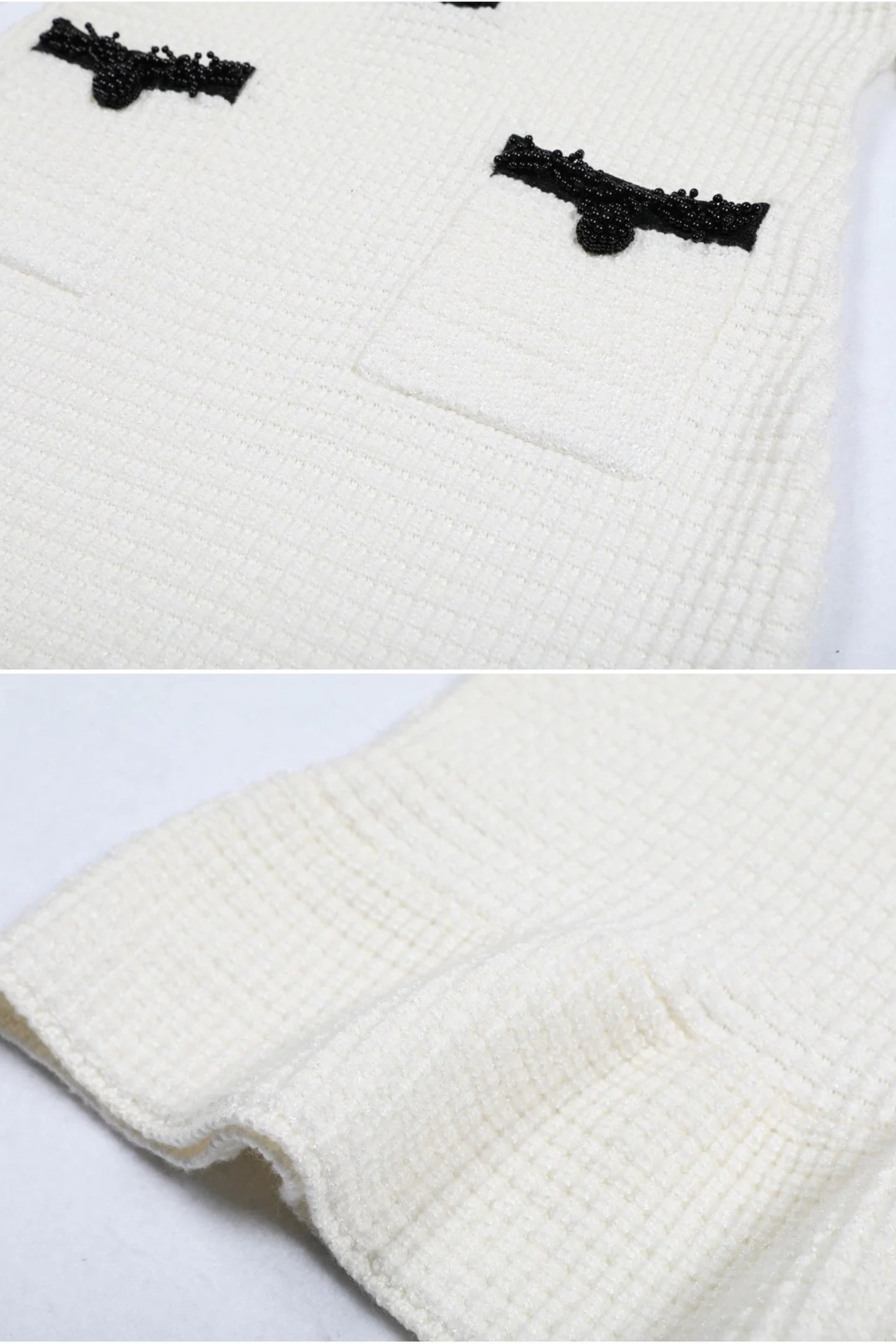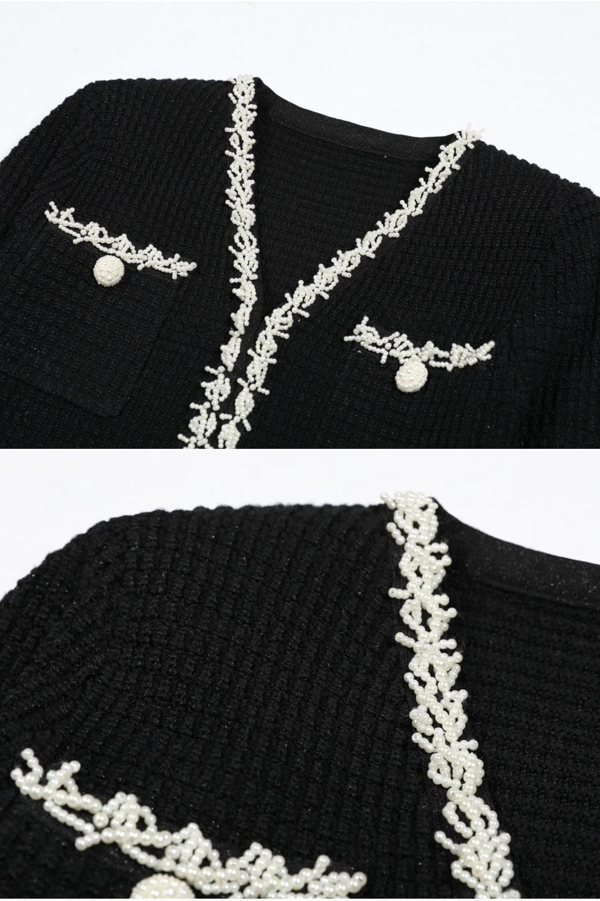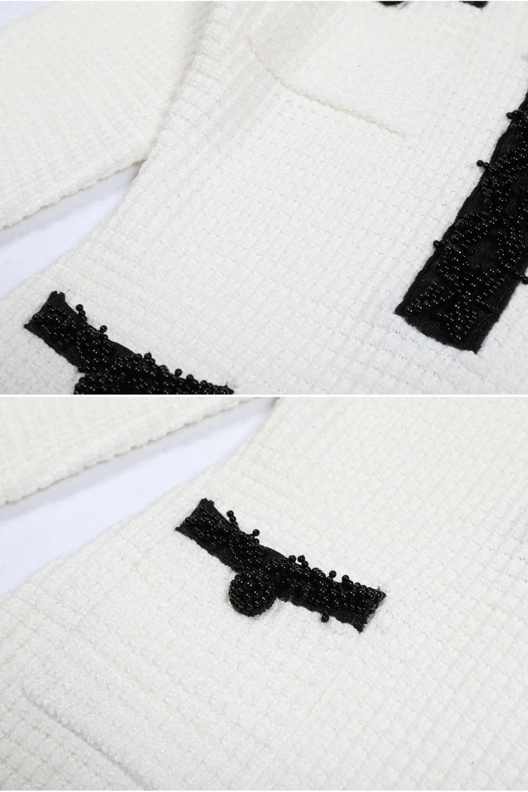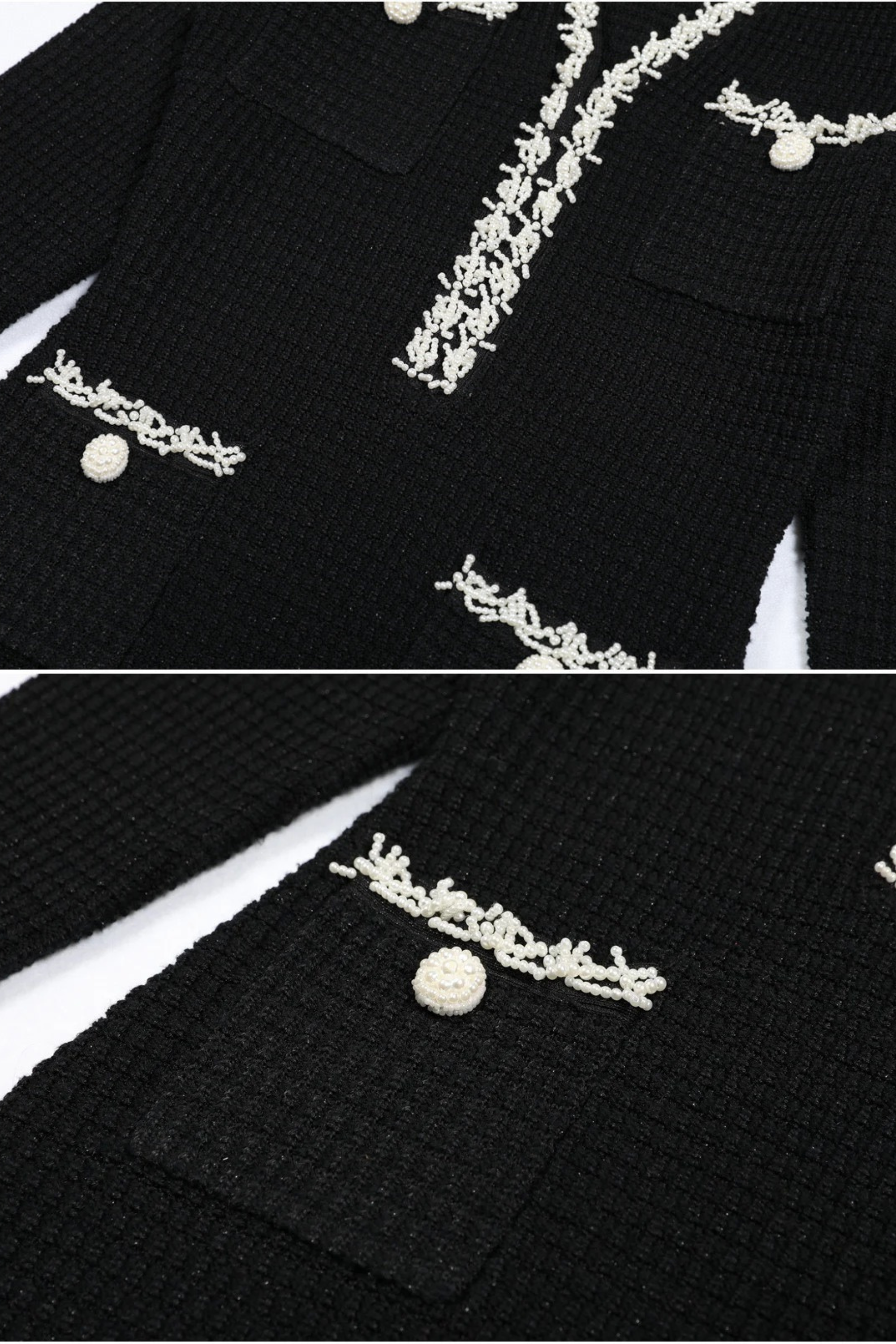 Crafted from a soft textured knit, this long-sleeve beaded dress blends comfort with refined elegance. The structured silhouette highlights the waist, while the gentle flared hem creates a naturally flattering shape suitable for day or evening wear. Hand-applied beaded trim along the neckline and pockets adds a luxurious, detailed finish that sets this design apart.