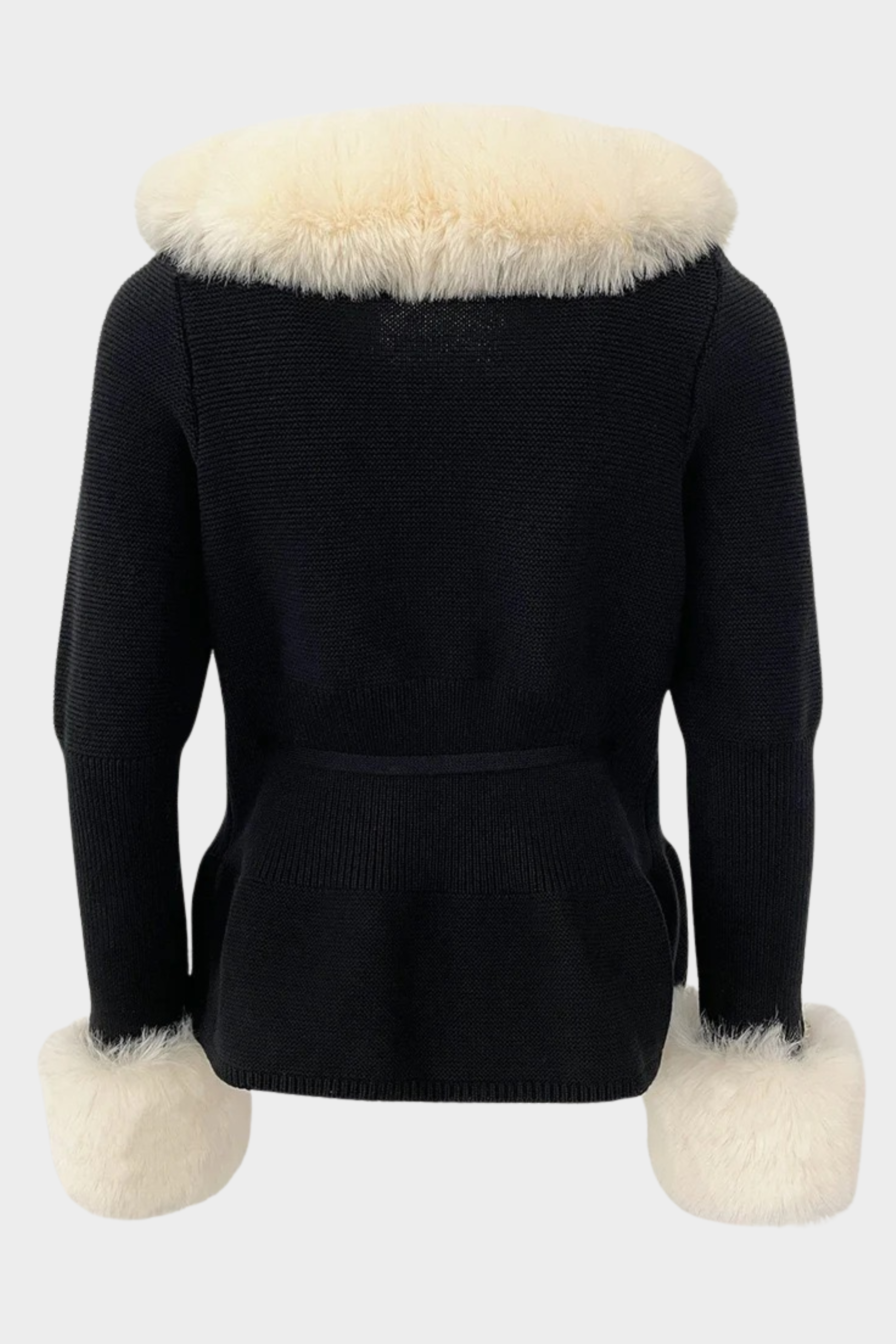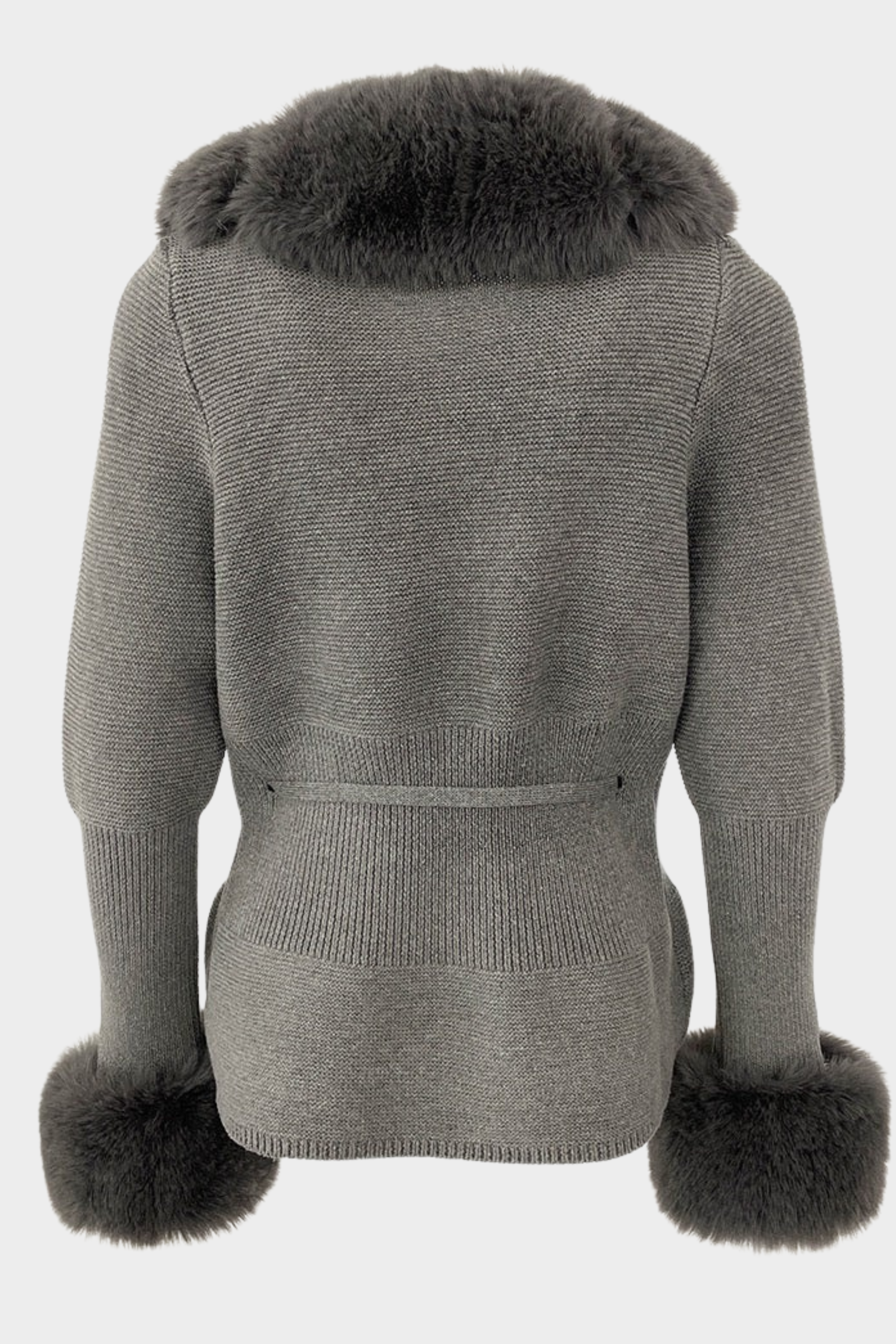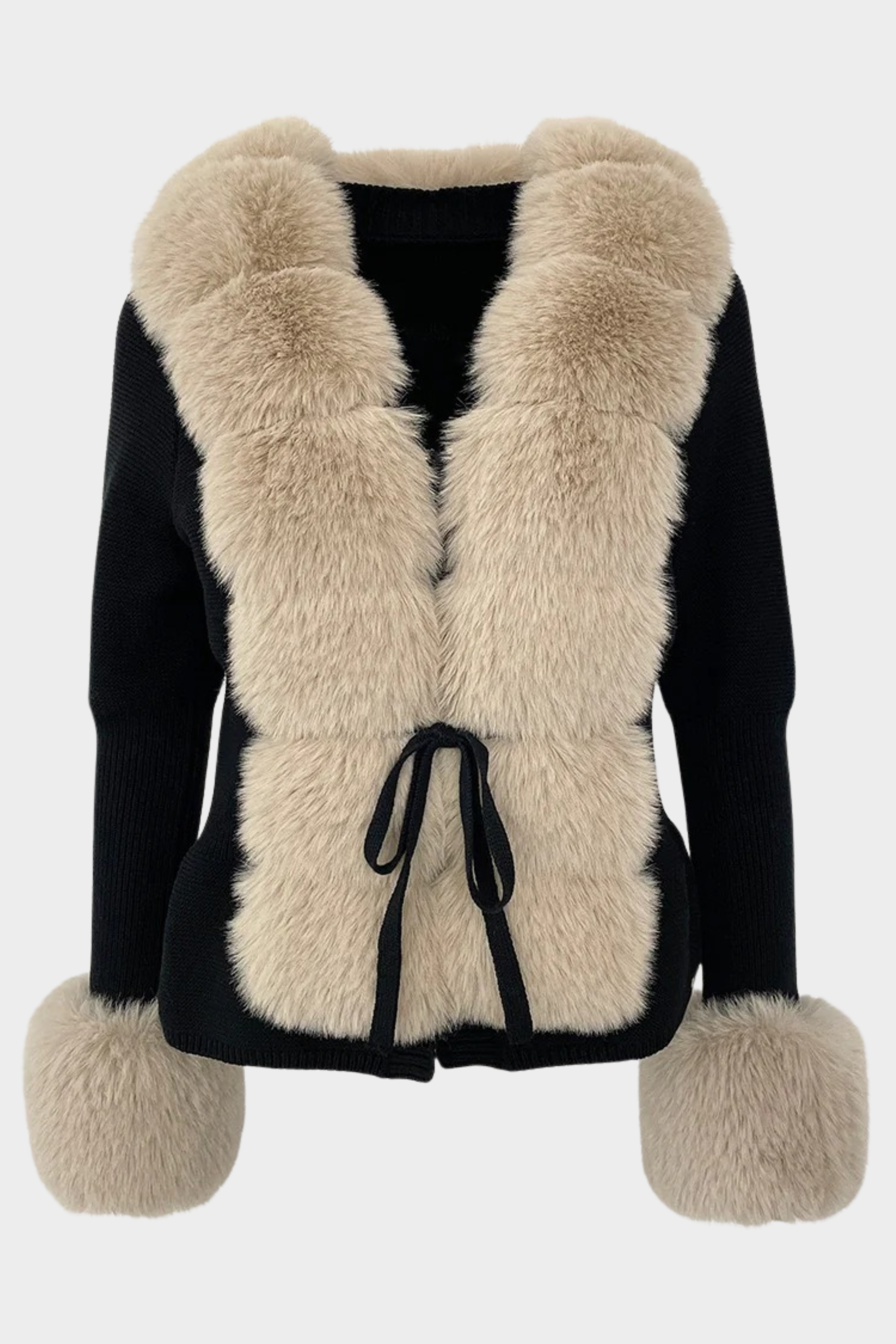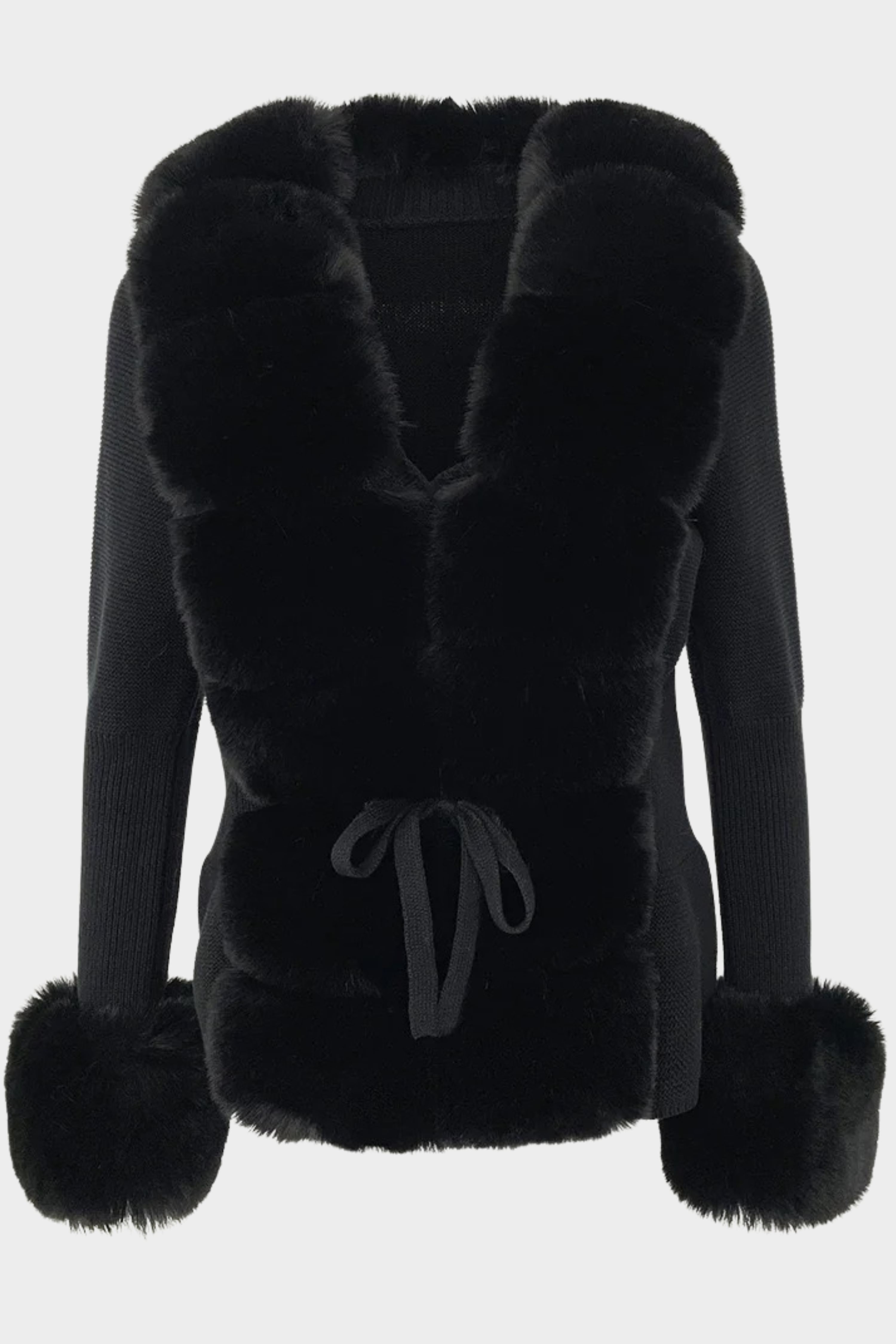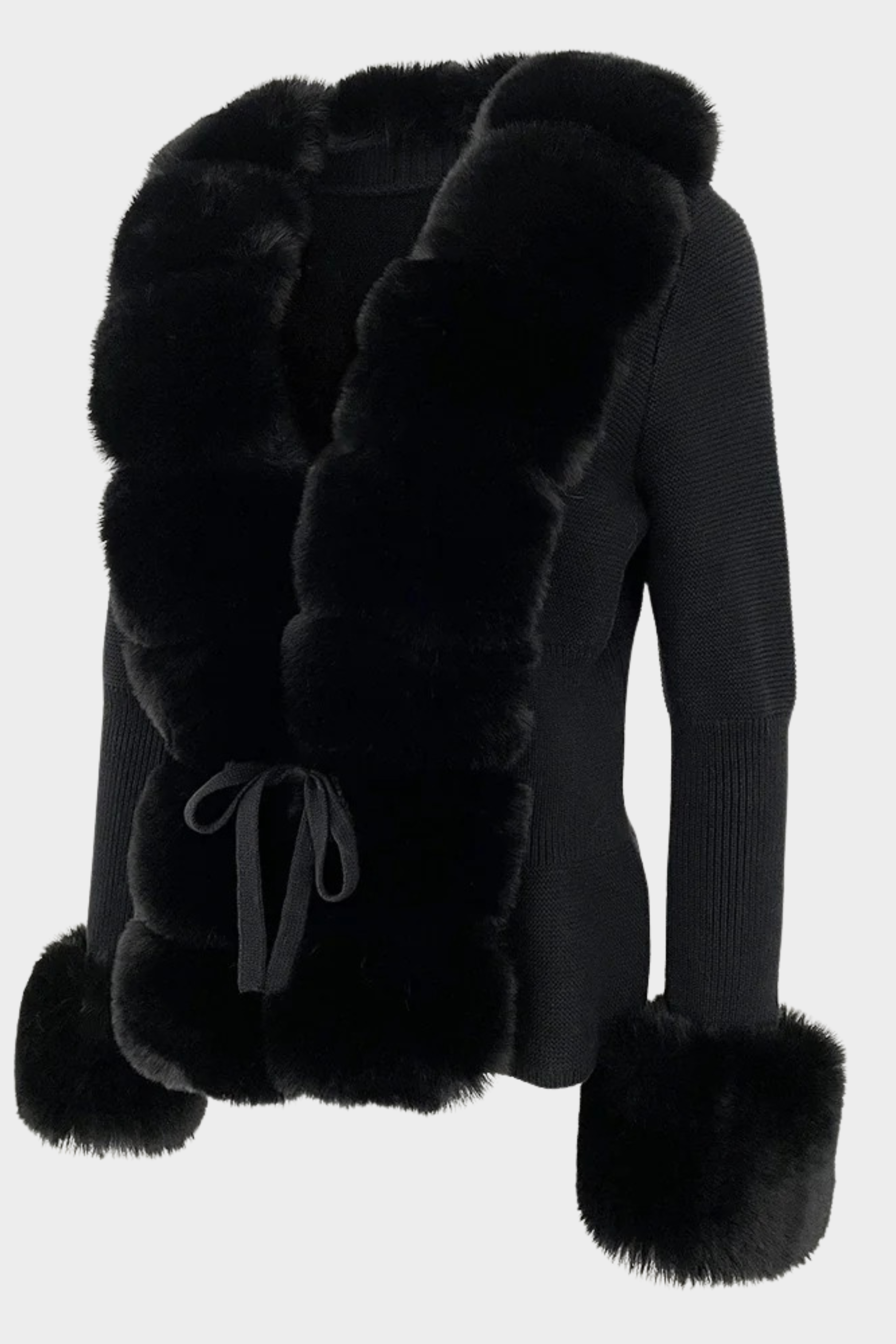 A chic cold-season essential combining soft knit fabric with plush faux fur detailing for a luxurious finish. This long sleeve jacket features voluminous faux fur panels along the front, collar, and sleeve cuffs, creating a rich contrast against the knitted body.