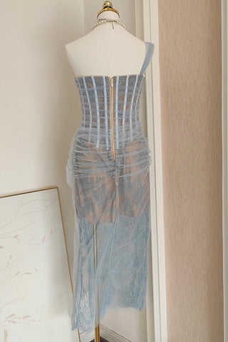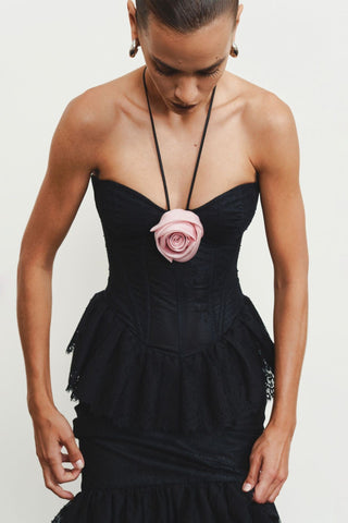 Strapless Lace Mermaid Long Dress with Ruffled Tiers and Pink Rose Detail