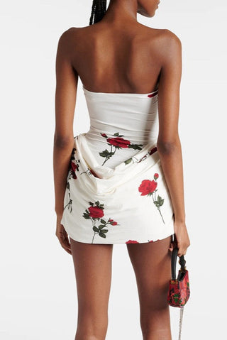 Strapless fitted mini dress with 3D floral ruffles and ruched bodice.