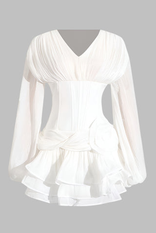 V-Neck Puff Long Sleeve Mini Dress with Corset Waist and Ruffle Skirt