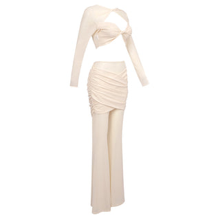 Chic Sheer Ruched Two-Piece Set - Elegant Long Sleeve Top & Flared Pants Combo