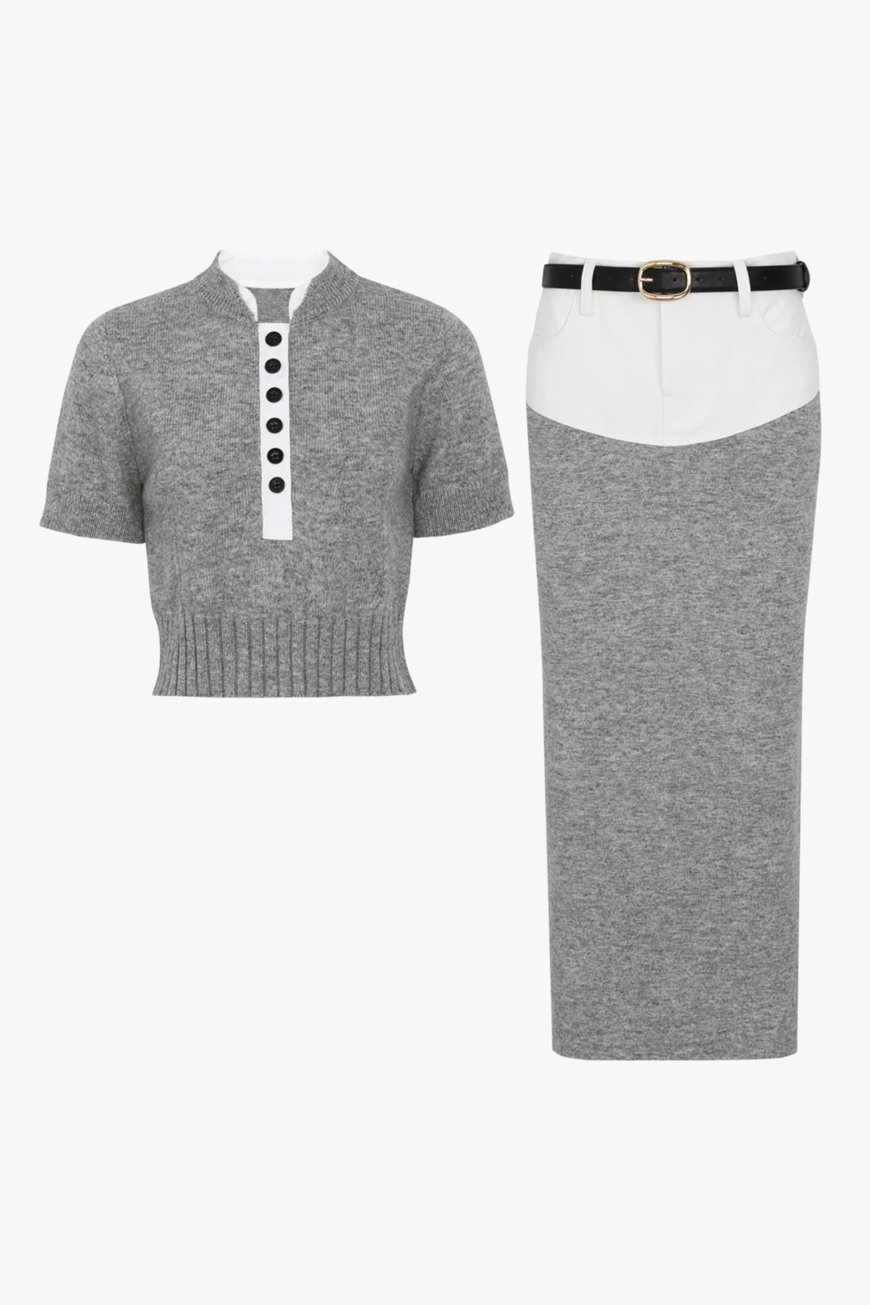 A modern knit matching set designed for effortless elegance. Featuring a structured top with contrast trim and button detail, paired with a sleek high-waisted midi skirt for a polished, flattering silhouette. Soft, comfortable, and perfect for refined everyday wear.
