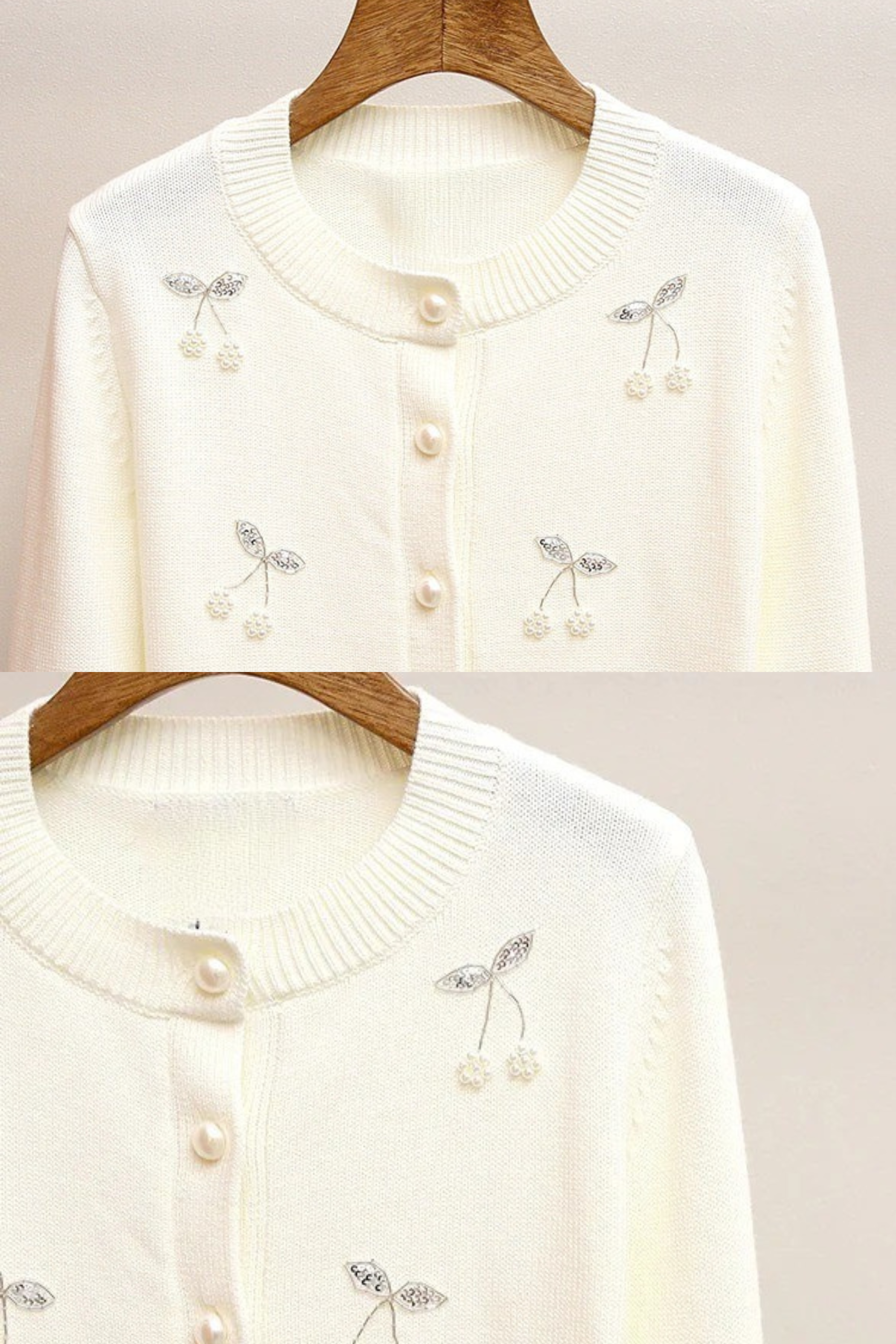 A soft, lightweight knit cardigan featuring delicate embellished cherry motifs, pearl-look buttons, and a classic round neckline. Designed in a cropped silhouette with long sleeves, this elegant piece adds a feminine, polished touch to everyday outfits. Perfect for layering over dresses, jeans, or skirts for a chic and timeless look.