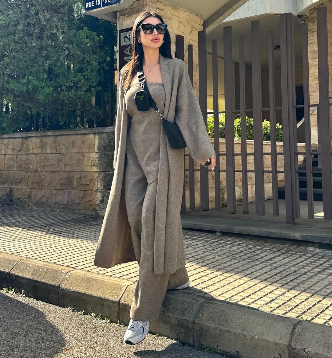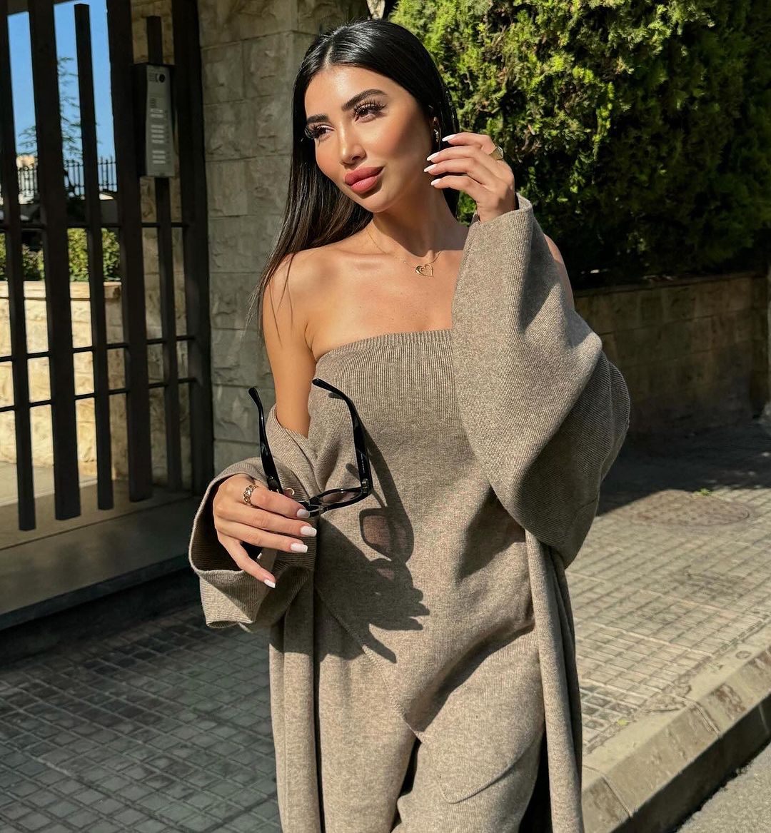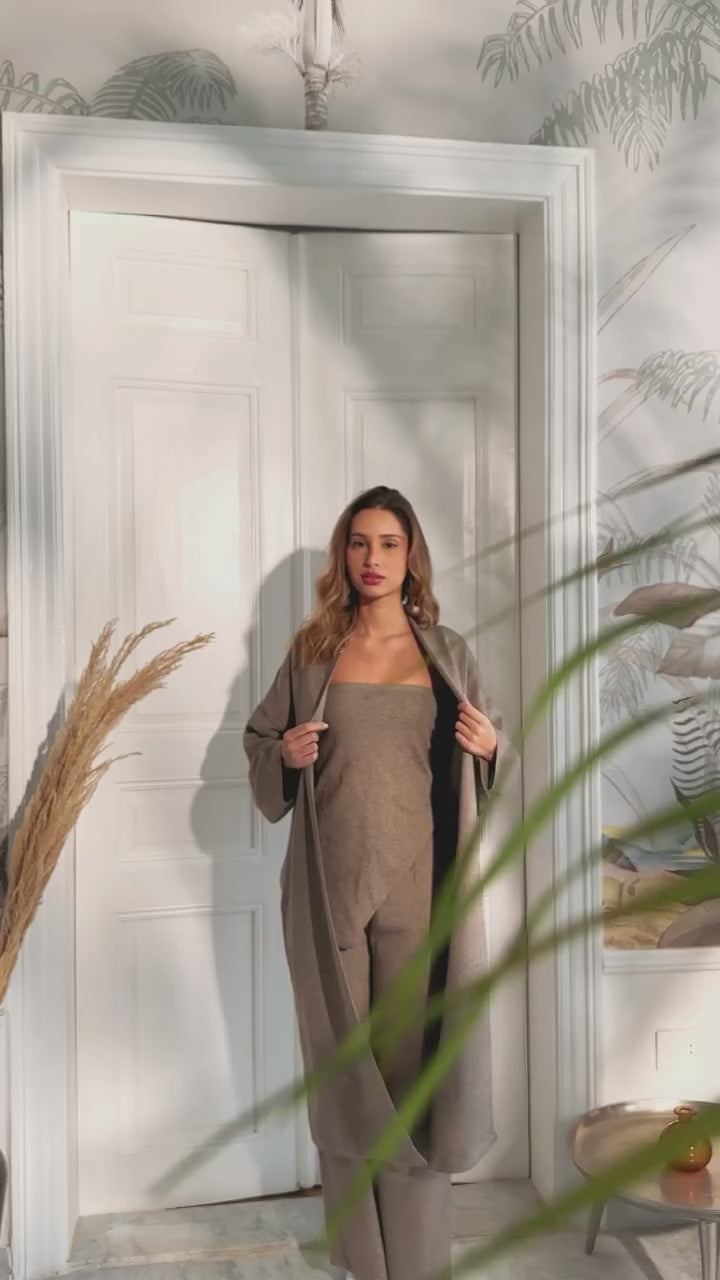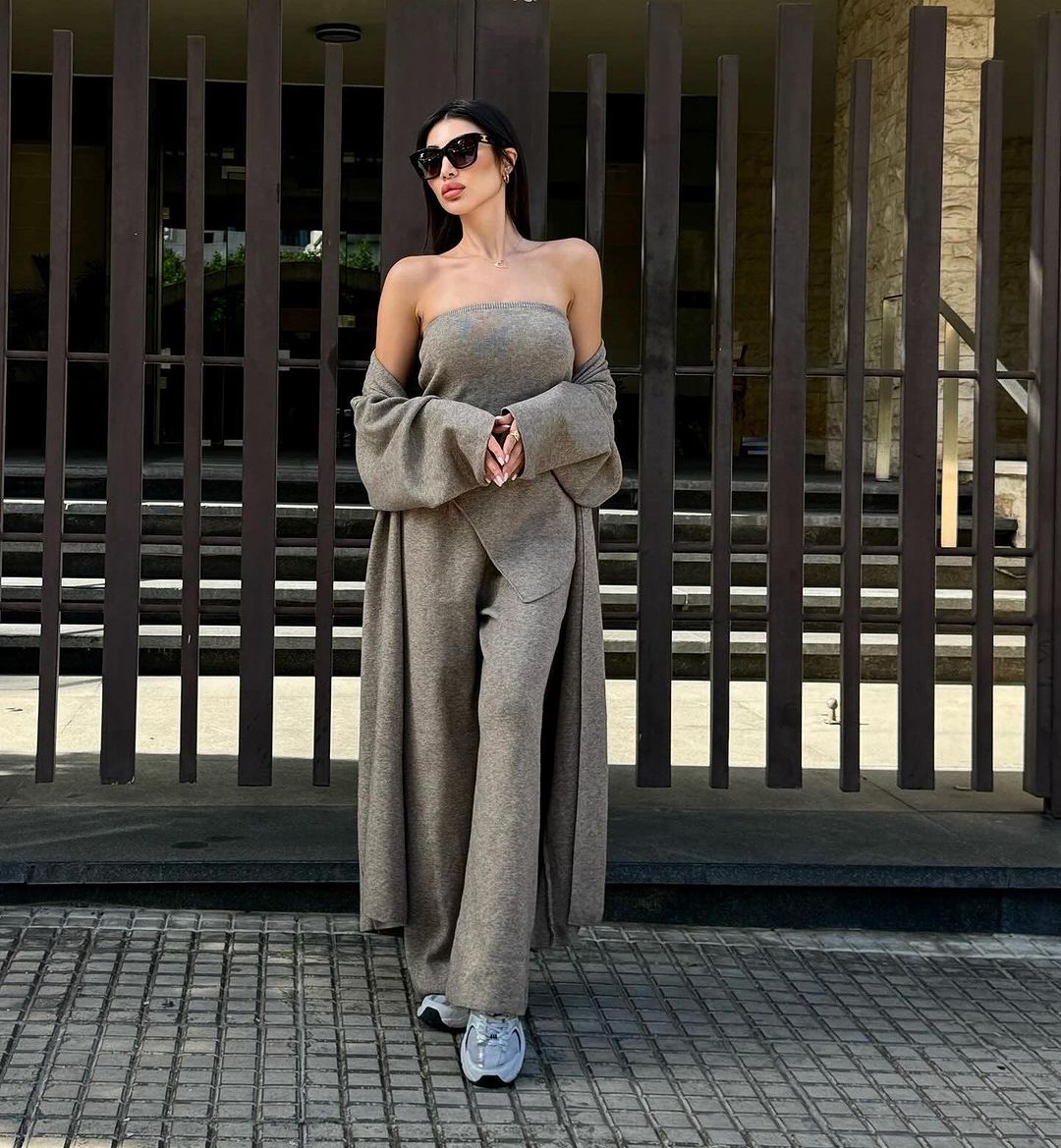An effortlessly stylish three-piece set featuring a sleek tube top, high-waisted wide-leg trousers, and a coordinating oversized cardigan. Crafted from a high end knit material. this ensemble combines comfort with a polished look, perfect for any chic occasion.